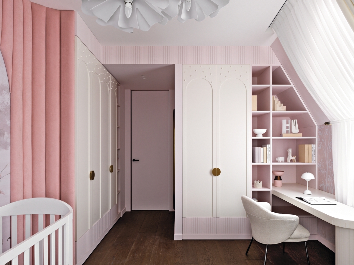 Комната старшей девочки. Обе детские выполнены в пудрово-розовой гамме. Стены декорированы мягкими и рифлеными МДФ-панелями, а также обоями. Игрушка над кроватью сшита на заказ по эскизам авторов проекта. Кровать и мягкая панель, So soft Анны Шункиной. Прикроватные тумбы, Be Home Buro. Корпусная мебель и стеновые панели из МДФ, компания Alium. Комната старшей девочки. Обе детские выполнены в пудрово-розовой гамме. Стены декорированы мягкими и рифлеными МДФ-панелями, а также обоями. Игрушка над кроватью сшита на заказ по эскизам авторов проекта. Кровать и мягкая панель, So soft Анны Шункиной. Прикроватные тумбы, Be Home Buro. Корпусная мебель и стеновые панели из МДФ, компания Alium.