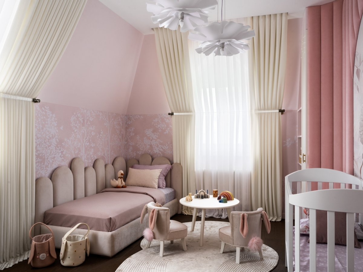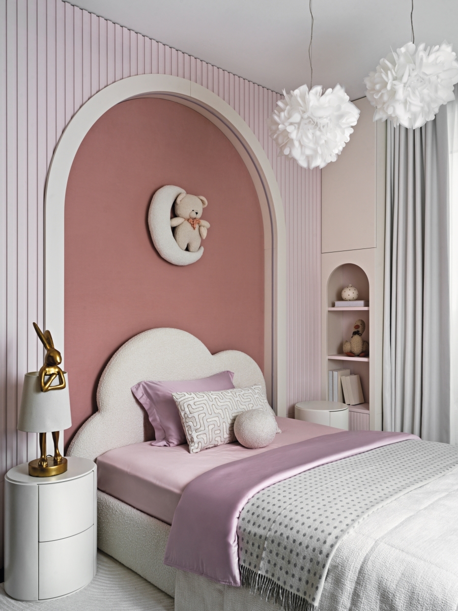 Отдельным пожеланием хозяев было продумать то, как будет меняться интерьер детских. Так, в комнате младшей дочери сейчас стоит маленькая кроватка, но арка в зоне изголовья кровати заранее спроектирована под размеры изголовья взрослой кровати, которая появится здесь в будущем — ведь дети так быстро растут.