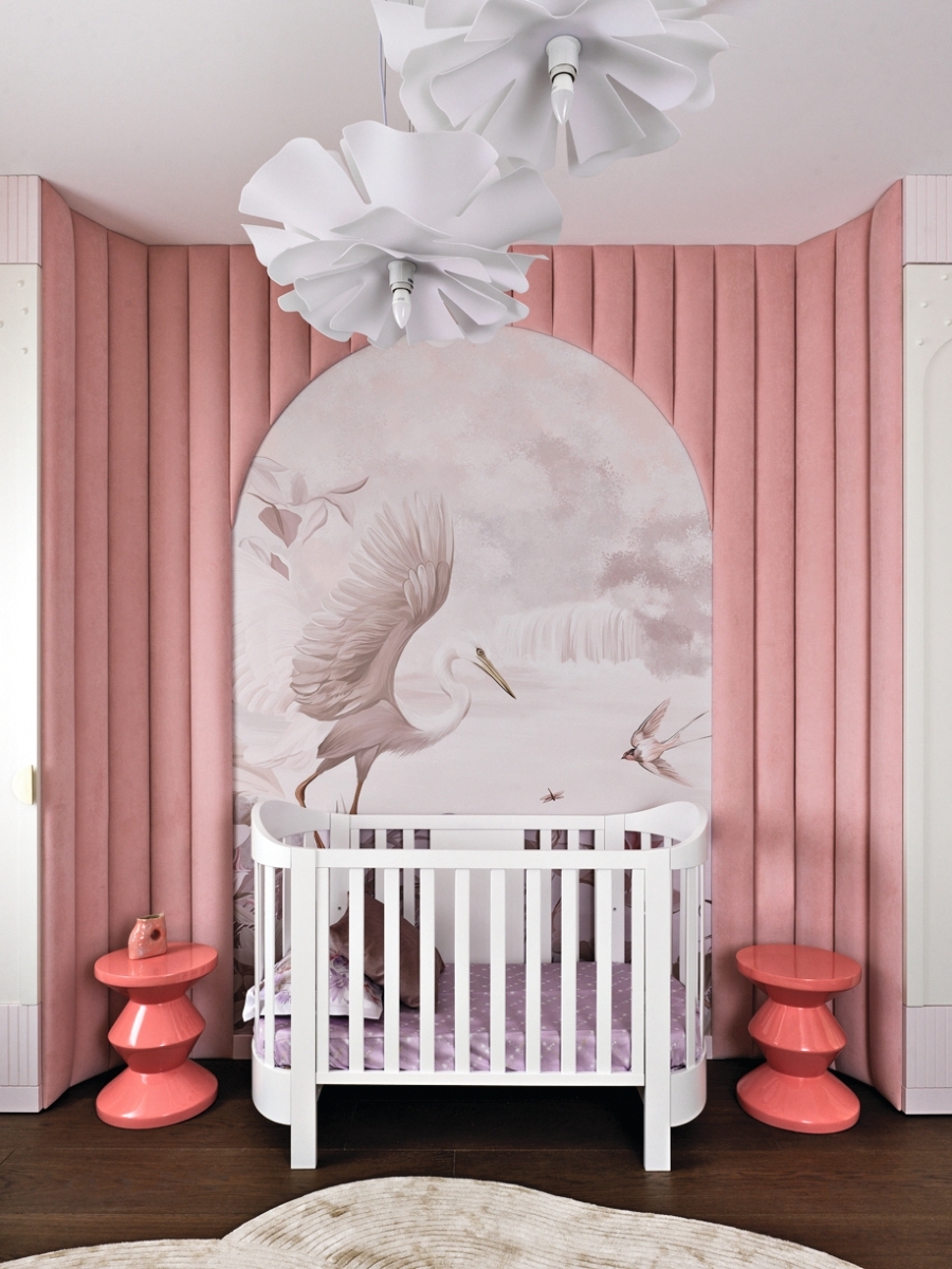 Спальня младшей дочери. Арка, рядом с которой установлена кроватка Erbesi, декорирована панно с изображением аиста. Люстры в детской, компания Verluisant. Спальня младшей дочери. Арка, рядом с которой установлена кроватка Erbesi, декорирована панно с изображением аиста. Люстры в детской, компания Verluisant.