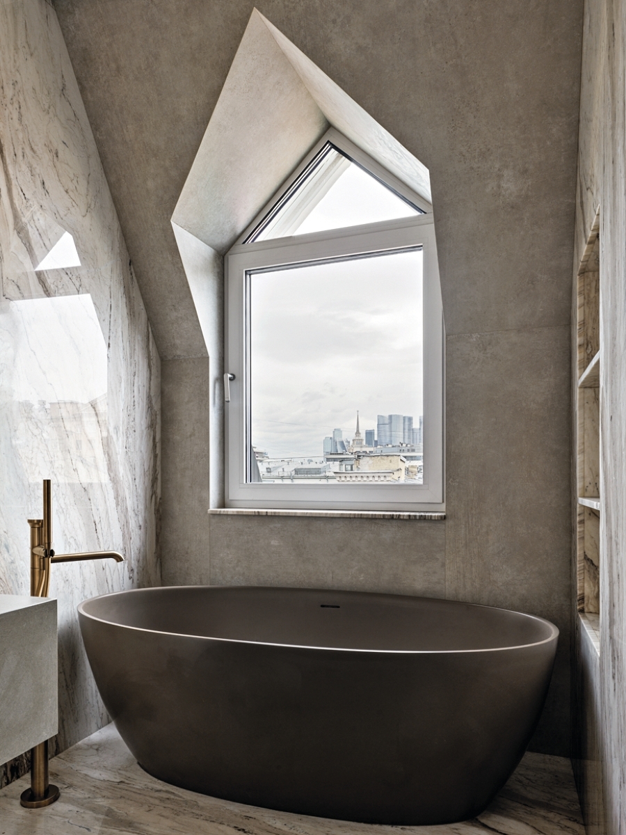 Эта квартира, оформленная в духе элегантного минимализма, находится в самом центре Москвы, в доме на верхнем, мансардном этаже.