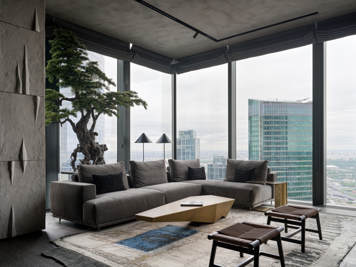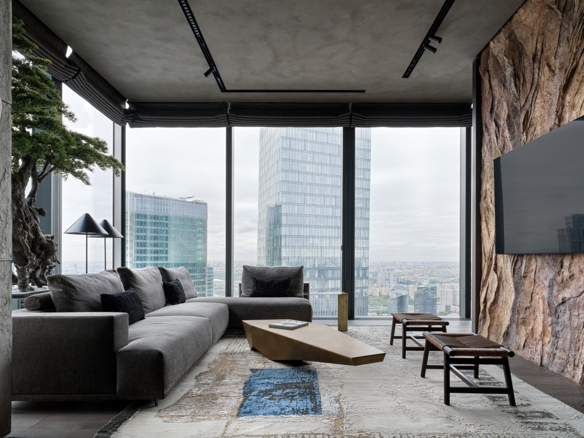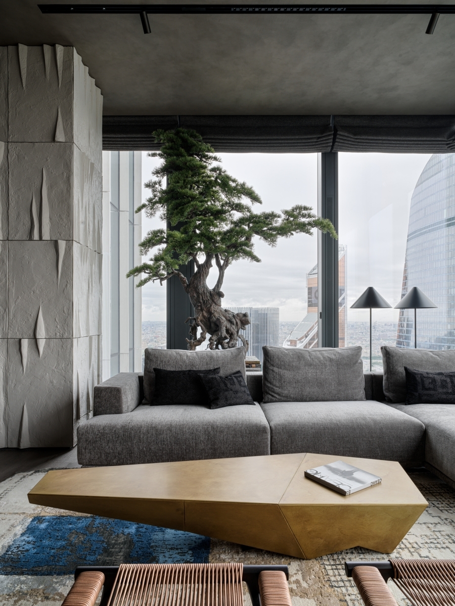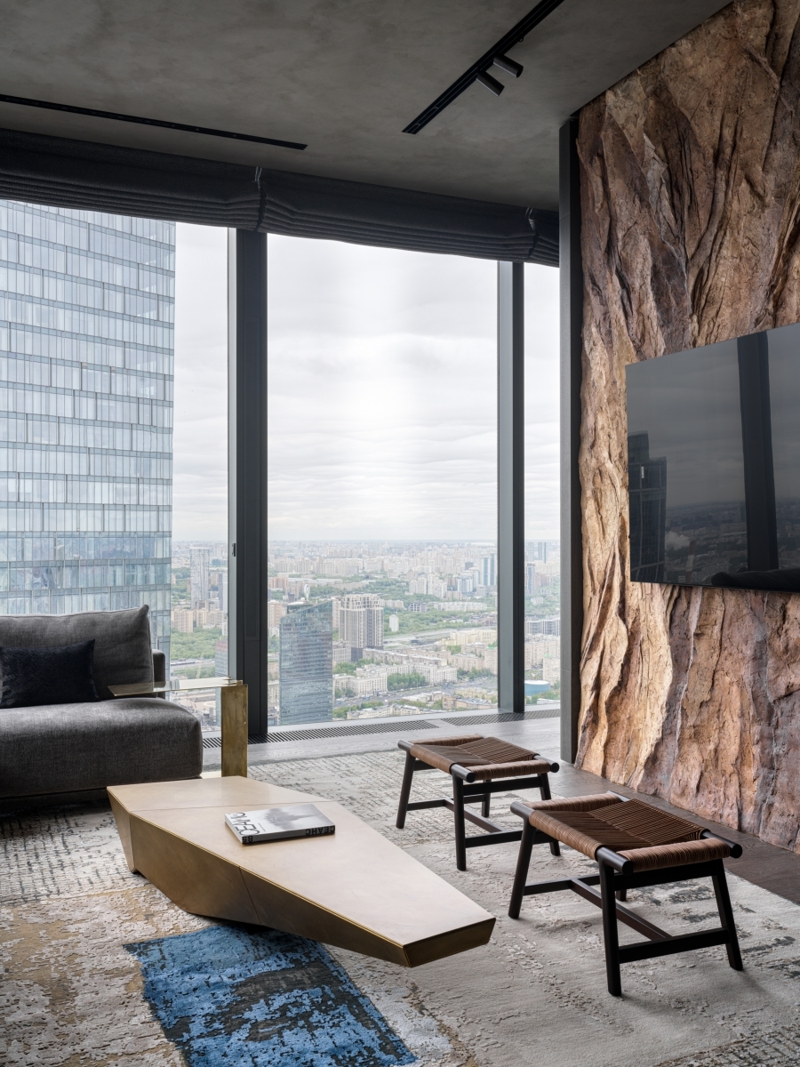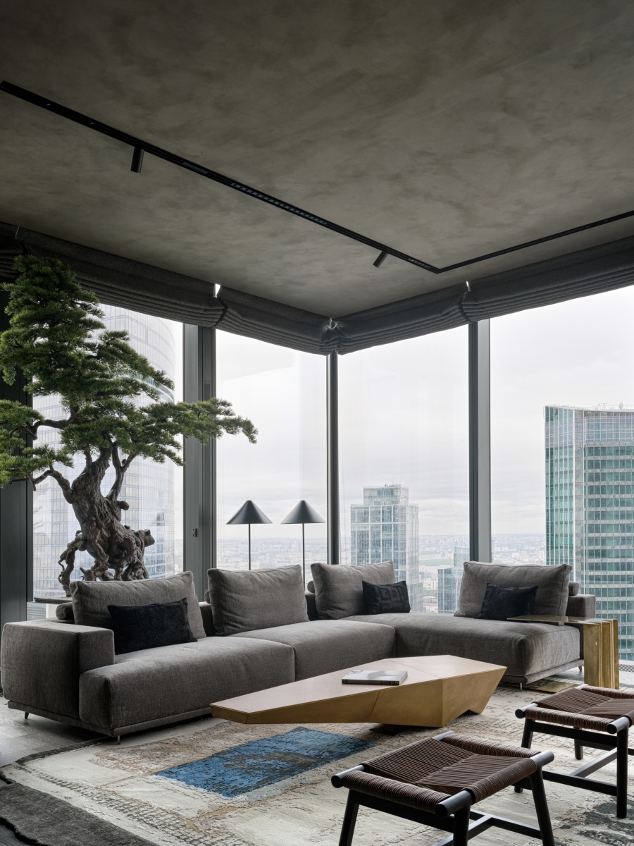Сергей Трегубов воплотил эмоцию чувственности и физического единения в интерьере небоскреба «Москва-Сити». Мультифактурные поверхности, восточные мотивы и авторское искусство создали оазис покоя, где панорама столицы становится частью интерьера.
