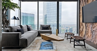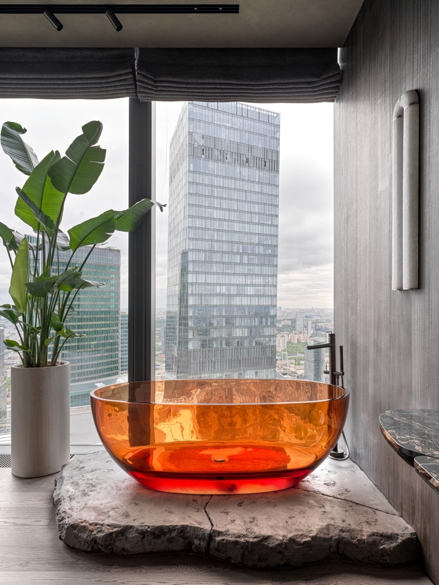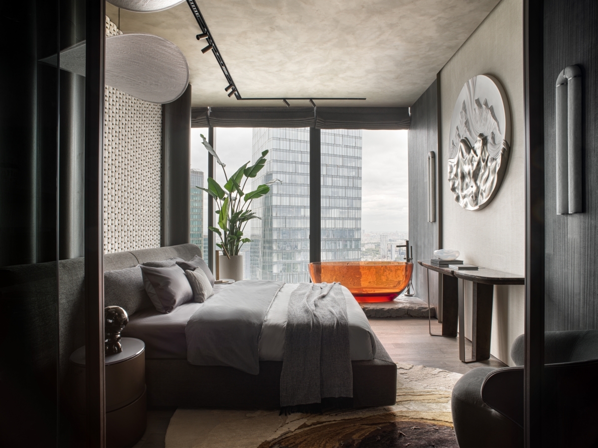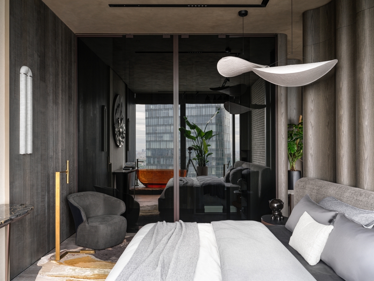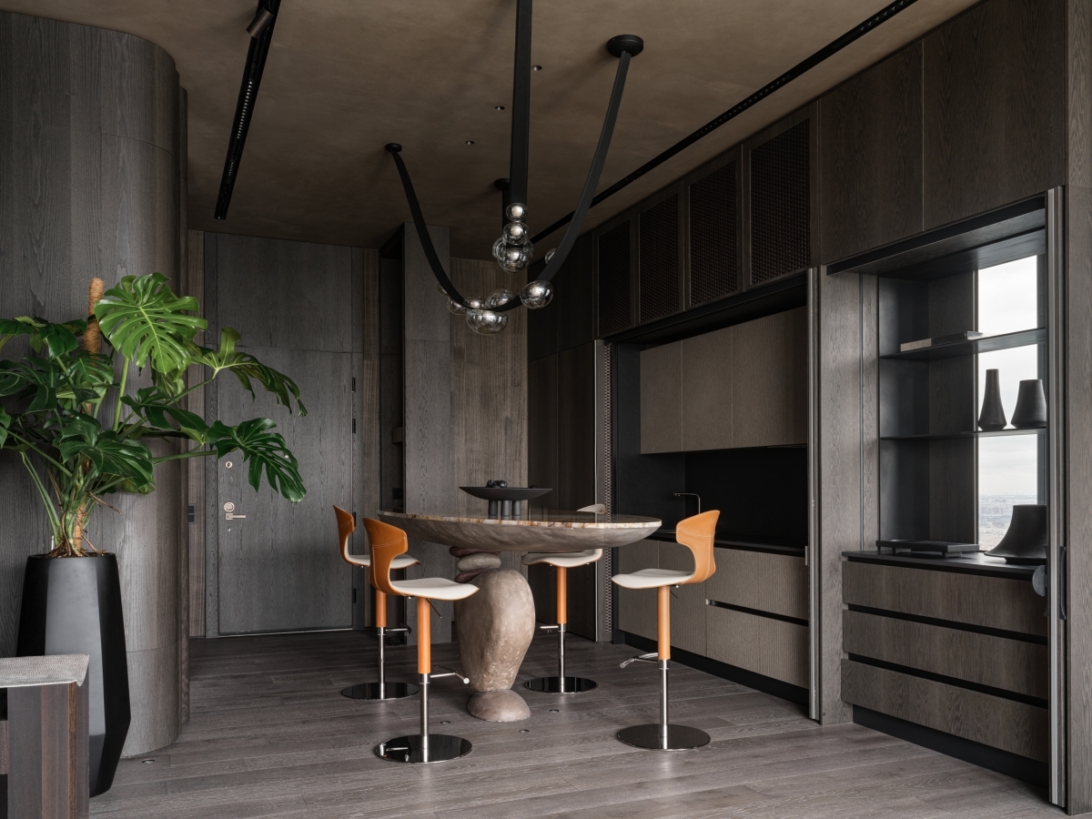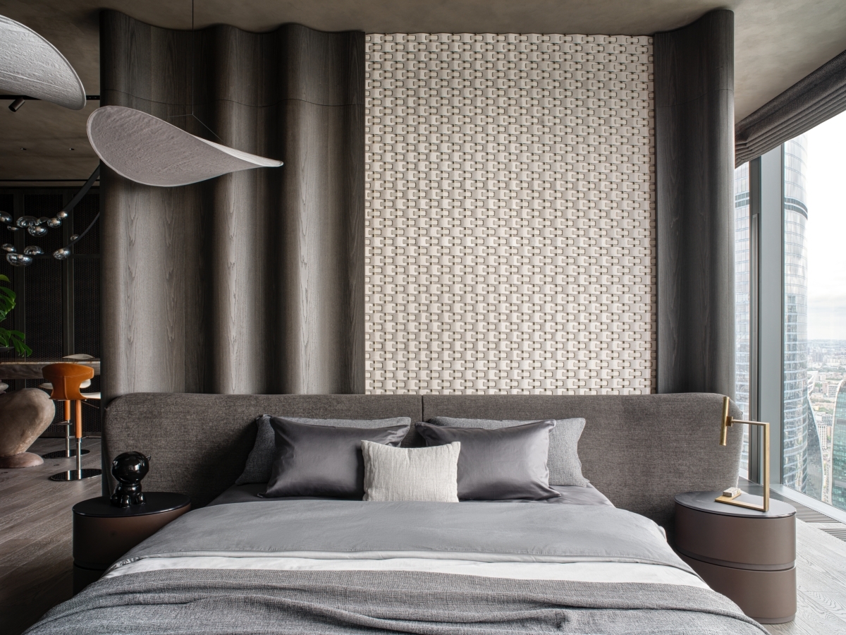 Сергей Трегубов воплотил эмоцию чувственности и физического единения в интерьере небоскреба «Москва-Сити». Мультифактурные поверхности, восточные мотивы и авторское искусство создали оазис покоя, где панорама столицы становится частью интерьера.
