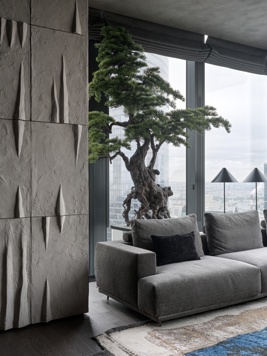 Преимущество просторной гостиной — панорамные окна в пол. За угловым диваном возвышается массивный бонсай. Колонна, как и центральная перегородка в виде стилизованной скалы, — это гипсовый барельеф, созданный скульптором Юлией Мекшун и покрытый каменной замшей, чтобы тактильно приблизиться к фактуре натурального камня. Преимущество просторной гостиной — панорамные окна в пол. За угловым диваном возвышается массивный бонсай. Колонна, как и центральная перегородка в виде стилизованной скалы, — это гипсовый барельеф, созданный скульптором Юлией Мекшун и покрытый каменной замшей, чтобы тактильно приблизиться к фактуре натурального камня.