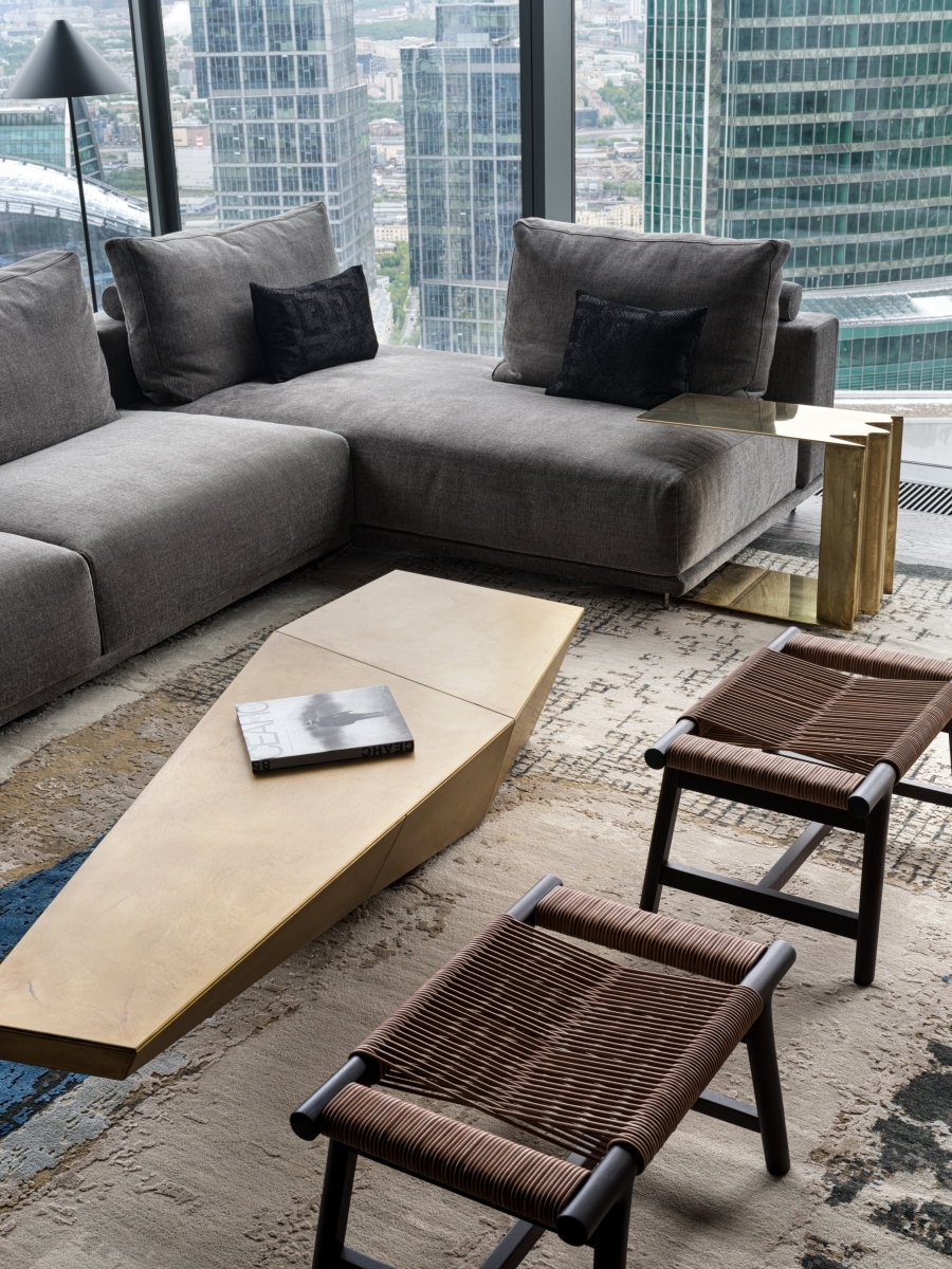 Гостиная. Диван Avalon, Marac. Журнальный столик из латуни Monolith, приставной столик из латуни Be Mine — всё Henge. Банкетки из дерева и кожаных веревок Giano, Flexform. За диваном — лампы Keglen, Louis Poulsen. Ковер Dazzle, Dovlet House.