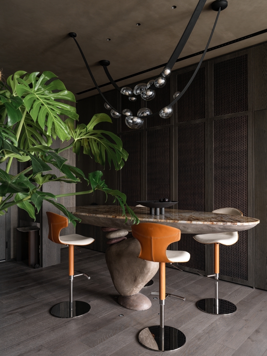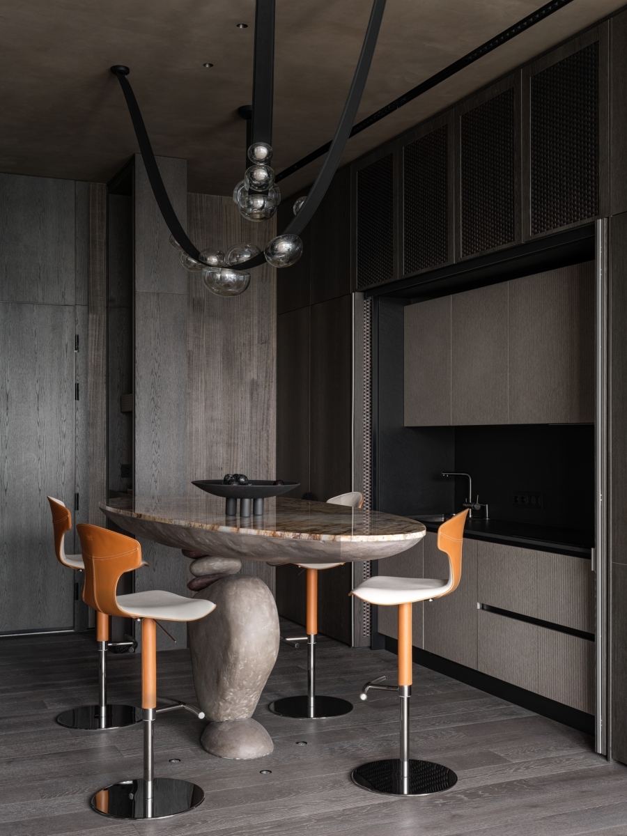 Кухня. «Кухня была спроектирована мной с нуля совместно с Silver Home. Хотелось сделать ее менее заметной для глаз. Фасады, стилизованные под стеновые панели, в закрытом виде представляют собой элегантную деревянную поверхность. Внутренняя отделка шкафов — наборный шпон, который напоминает мягкое кашемировое пальто», — дополняет Сергей Трегубов. Барный блок с металлическими полками для бокалов и коллекционных бутылок размещен в правой части кухни. На кухне установлен антигравитационный стол, Сергей Трегубов придумал его, вдохновившись искусством балансировки камней Икэниси Дайсукэ. Конструкция создает иллюзию хрупкого равновесия, готового разрушиться от малейшего прикосновения, — метафора нежности и уязвимости человеческих отношений. Кухня. «Кухня была спроектирована мной с нуля совместно с Silver Home. Хотелось сделать ее менее заметной для глаз. Фасады, стилизованные под стеновые панели, в закрытом виде представляют собой элегантную деревянную поверхность. Внутренняя отделка шкафов — наборный шпон, который напоминает мягкое кашемировое пальто», — дополняет Сергей Трегубов. Барный блок с металлическими полками для бокалов и коллекционных бутылок размещен в правой части кухни. На кухне установлен антигравитационный стол, Сергей Трегубов придумал его, вдохновившись искусством балансировки камней Икэниси Дайсукэ. Конструкция создает иллюзию хрупкого равновесия, готового разрушиться от малейшего прикосновения, — метафора нежности и уязвимости человеческих отношений.