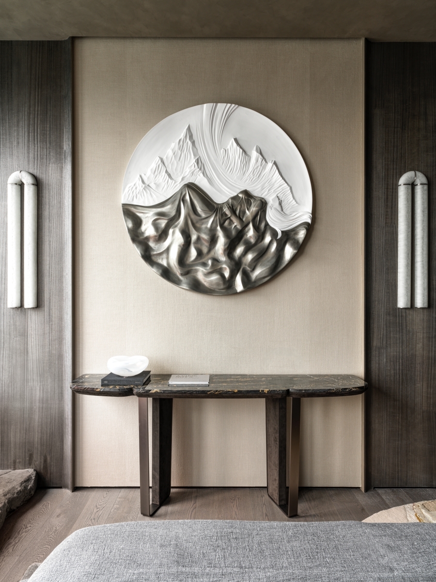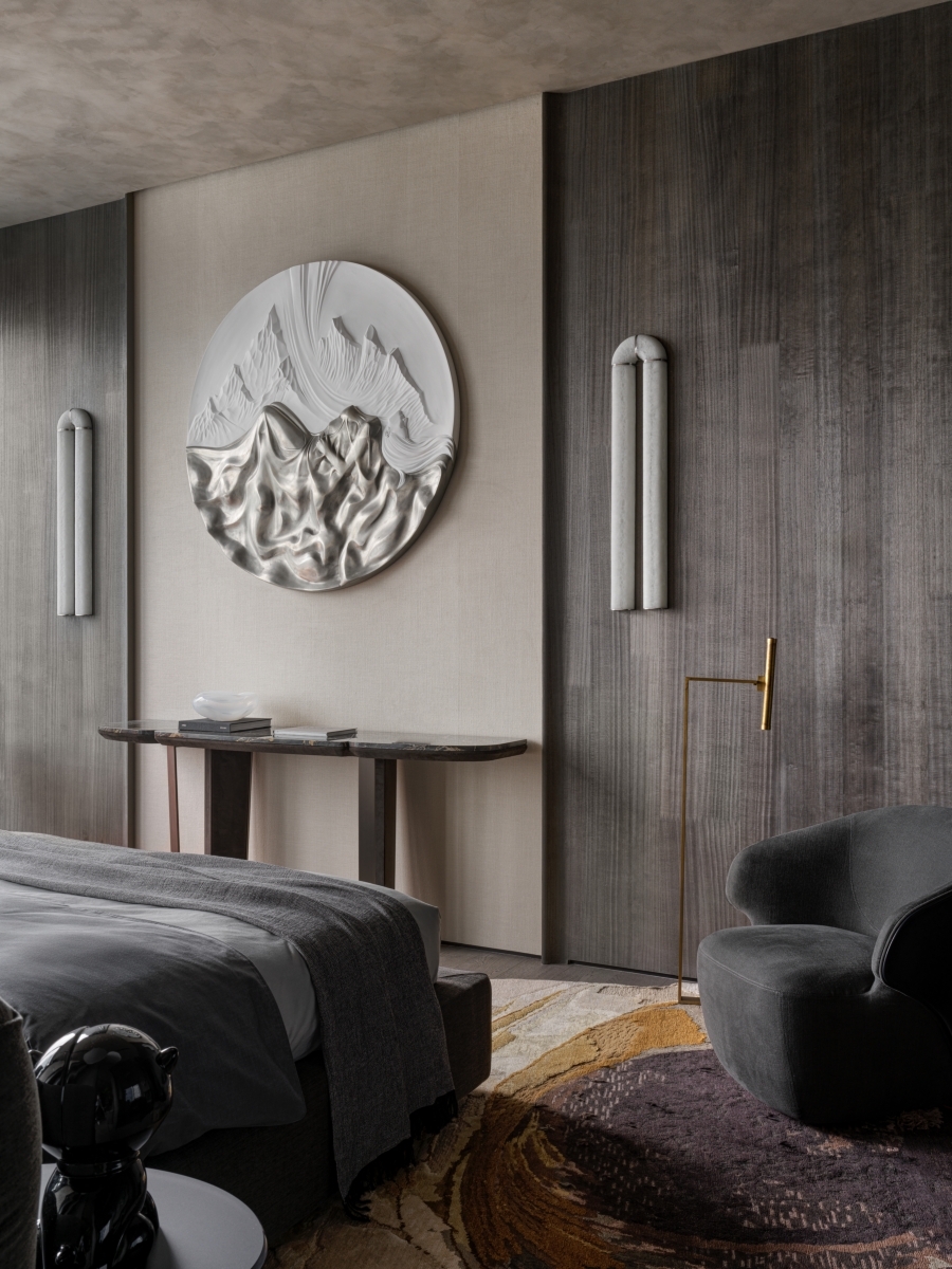 Спальня. Напротив кровати расположена мраморная консоль Keope, Longhi. Над консолью висит панно, придуманное автором проекта Сергеем Трегубовым и реализованное скульптором Юлией Мекшун, — «4 стихии». «Гипс и металл символизируют инь-ян, металл — воду, горы — землю, ветер — воздух, а огонь выражен через барельеф женской фигуры, укрытой влажной тканью в момент наивысшего наслаждения», — дополняет Сергей. Кровать в спальне расположена так, чтобы пробуждение сопровождалось видом на пульсирующий ритмом город. Стена в изголовье кровати имеет волнообразную форму, передающую идею заботы. А в центре — плетеная стена из металла, кожи и тканевых ремней, созданная по дизайну Сергей Трегубова. Спальня. Напротив кровати расположена мраморная консоль Keope, Longhi. Над консолью висит панно, придуманное автором проекта Сергеем Трегубовым и реализованное скульптором Юлией Мекшун, — «4 стихии». «Гипс и металл символизируют инь-ян, металл — воду, горы — землю, ветер — воздух, а огонь выражен через барельеф женской фигуры, укрытой влажной тканью в момент наивысшего наслаждения», — дополняет Сергей. Кровать в спальне расположена так, чтобы пробуждение сопровождалось видом на пульсирующий ритмом город. Стена в изголовье кровати имеет волнообразную форму, передающую идею заботы. А в центре — плетеная стена из металла, кожи и тканевых ремней, созданная по дизайну Сергей Трегубова.