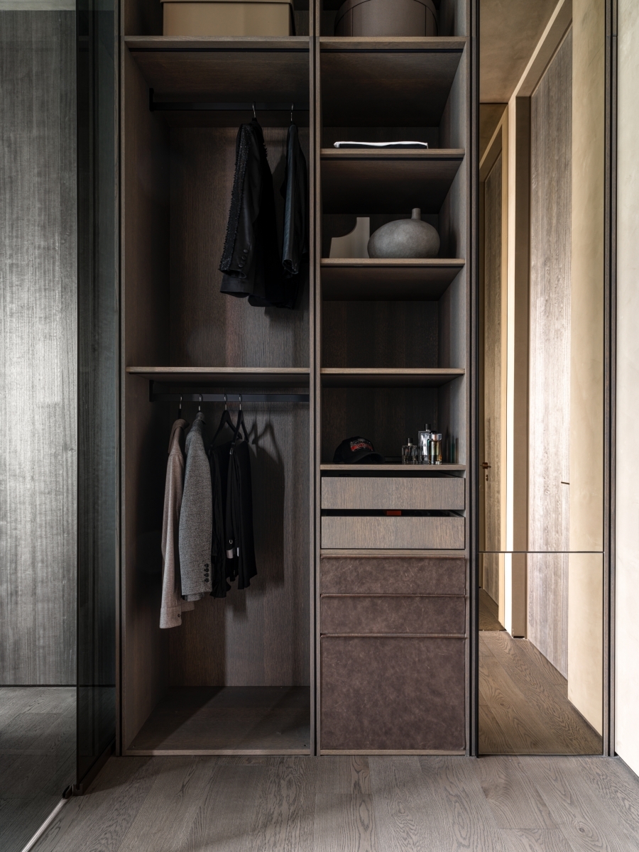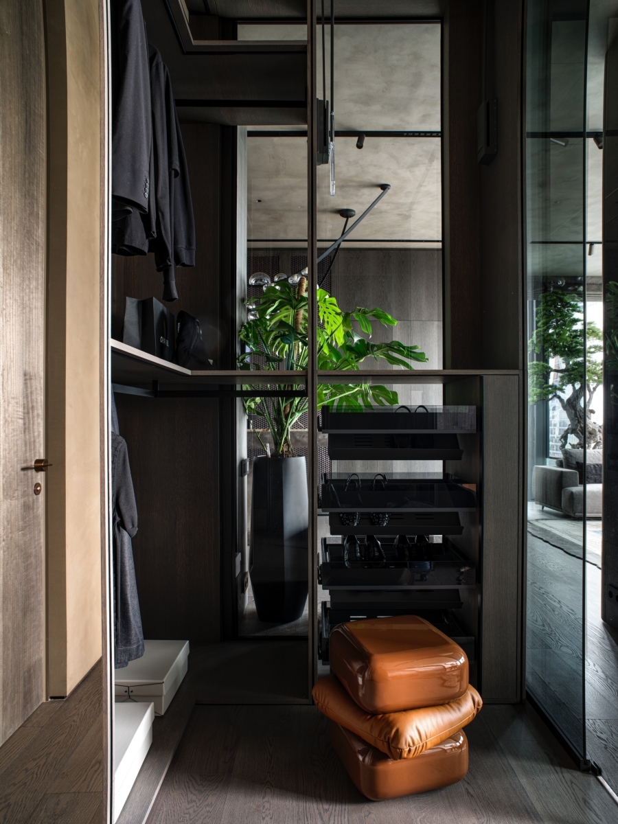 Через раздвижные стеклянные перегородки из спальни можно попасть в гардеробную с прозрачной стеной, разработанную индивидуально для этого проекта. Через раздвижные стеклянные перегородки из спальни можно попасть в гардеробную с прозрачной стеной, разработанную индивидуально для этого проекта.