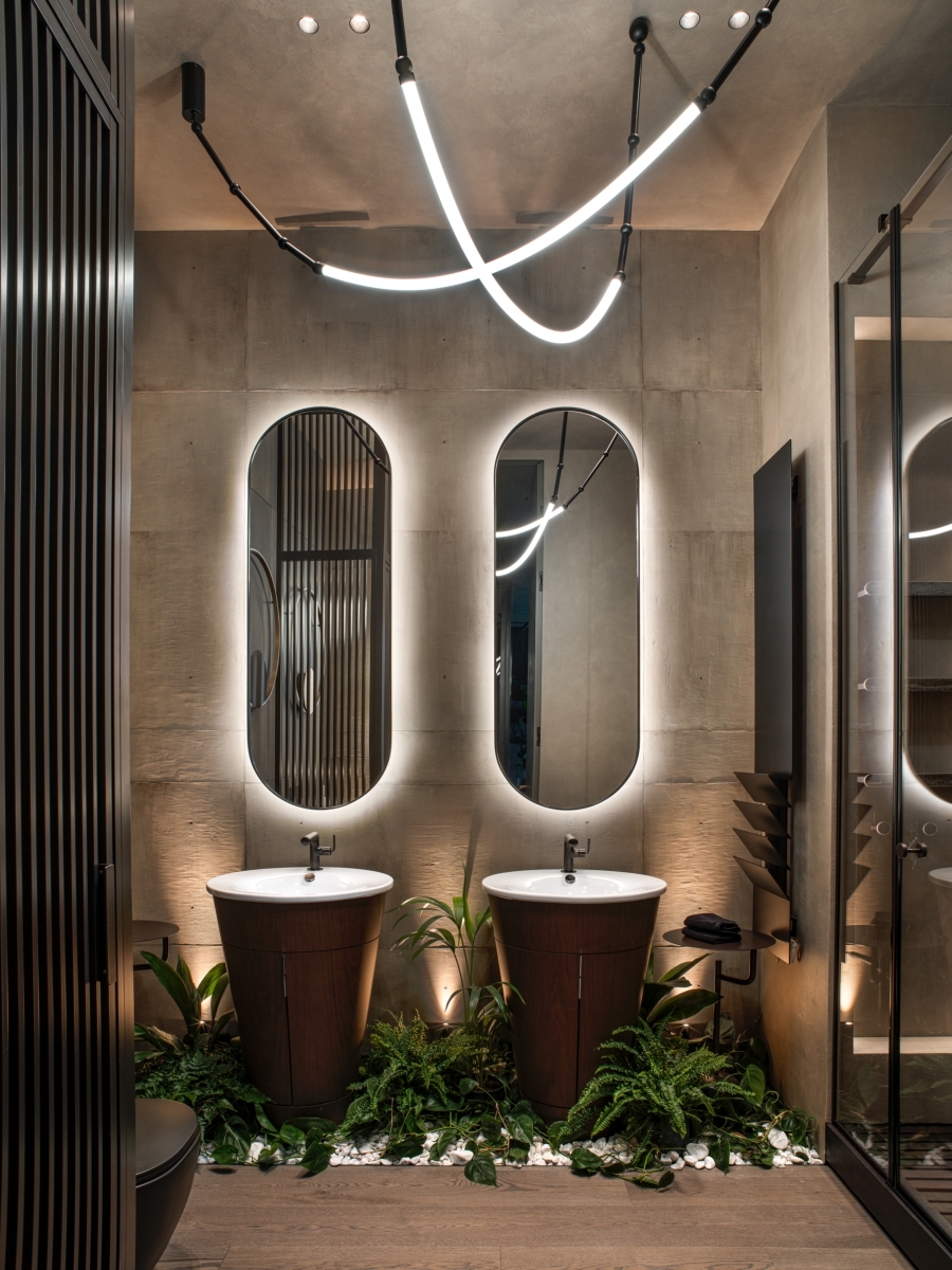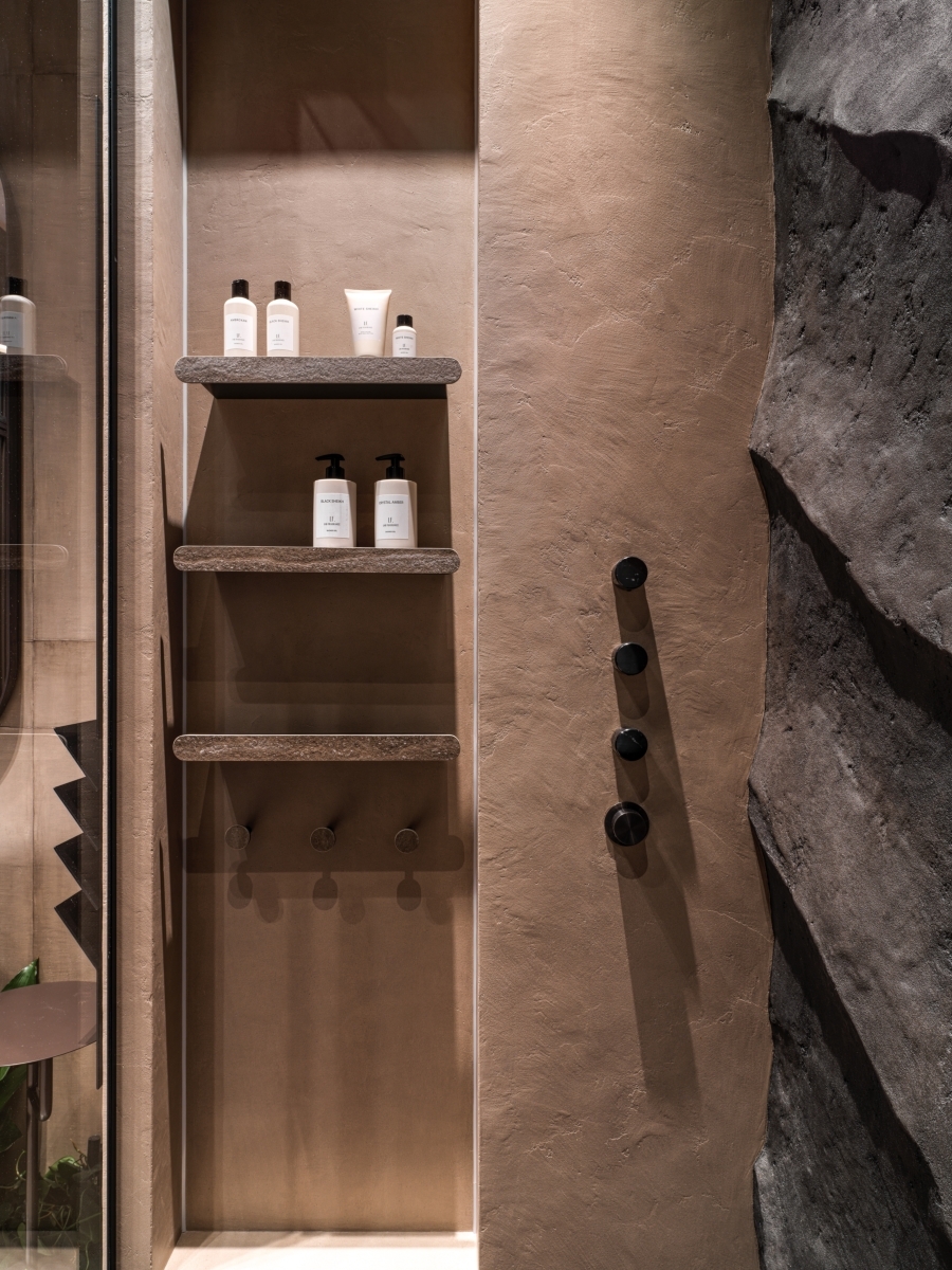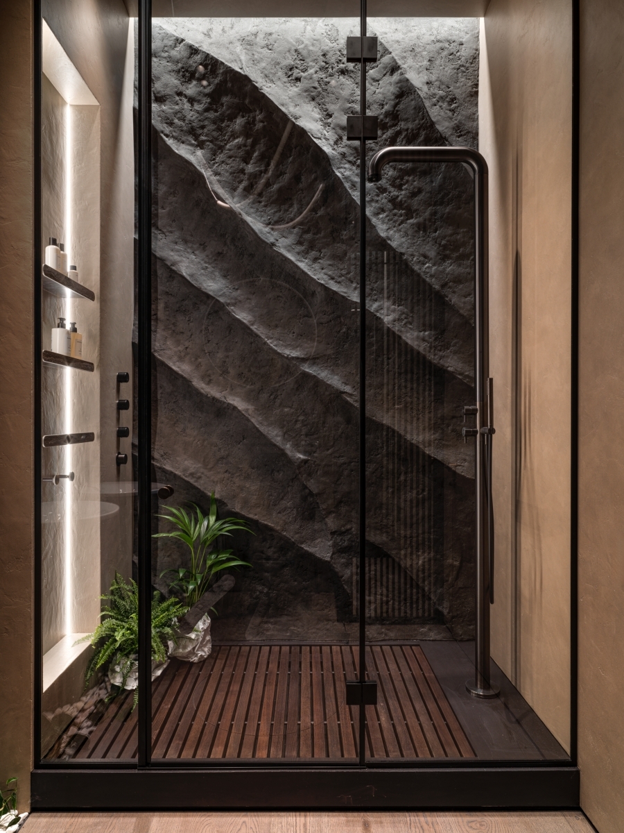 Ванная комната — истинный оазис спокойствия. Обилие живых растений отсылает к Бали. Скала с рисунком прибрежного песка, стены, покрытые микроцементом, имитирующим тонированный полированный бетон, и натуральный деревянный пол создают атмосферу покоя. В душевой потолочная лейка создает эффект водопада и тропического ливня, а уличная лейка-труба напоминает о ритуале ополаскивания после моря, усиливая ощущение пляжного отдыха. Ванная комната — истинный оазис спокойствия. Обилие живых растений отсылает к Бали. Скала с рисунком прибрежного песка, стены, покрытые микроцементом, имитирующим тонированный полированный бетон, и натуральный деревянный пол создают атмосферу покоя. В душевой потолочная лейка создает эффект водопада и тропического ливня, а уличная лейка-труба напоминает о ритуале ополаскивания после моря, усиливая ощущение пляжного отдыха.