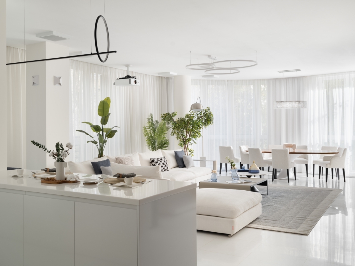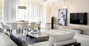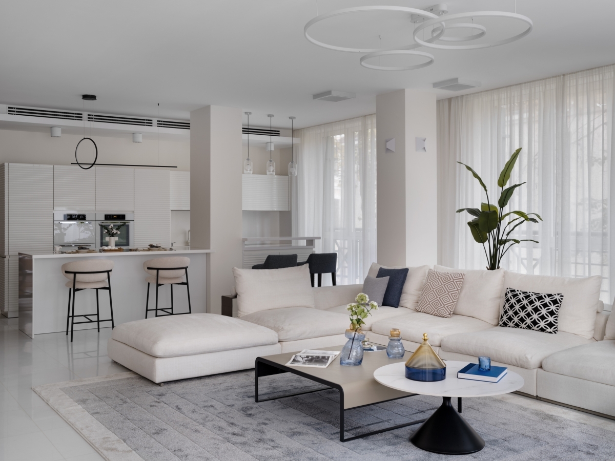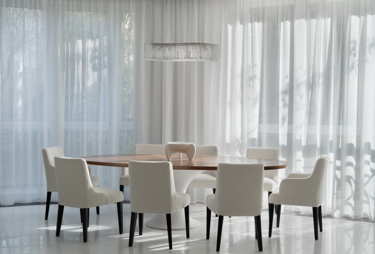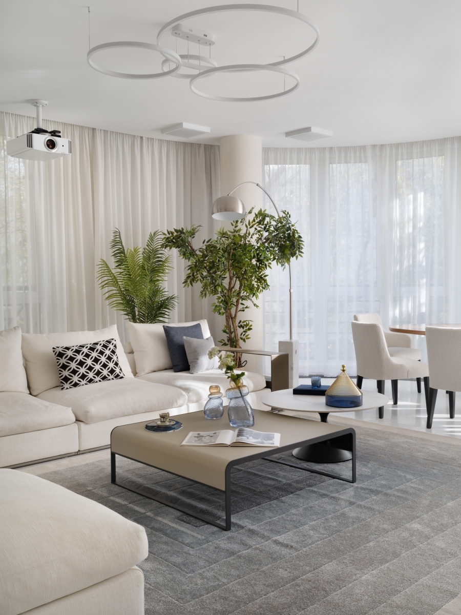 Гостиная — сердце всей квартиры. Благодаря панорамным окнам по всему периметру здесь много естественного света, а нежная молочно-белая гамма поддерживает эффект легкости и воздушности. Пространство удачно зонирует сама форма помещения — в центре скругленного эркера разместили обеденную зону с овальным столом, где хозяева могут собираться вместе с семьей и гостями. С другой стороны — небольшой остров отделяет зону кухни. Ритм всей общей зоне задает акцентная ТВ-стена из травертина с геометричным рисунком.