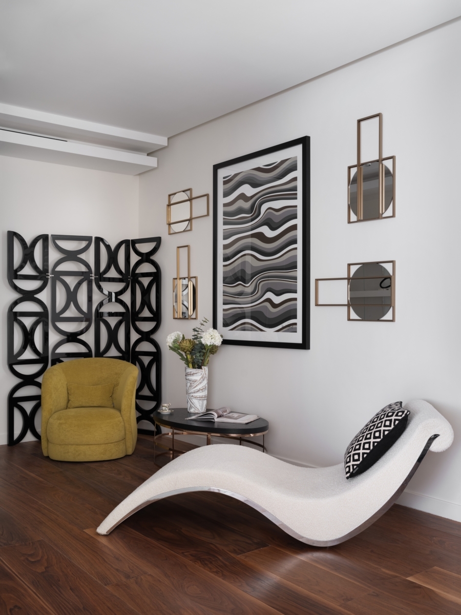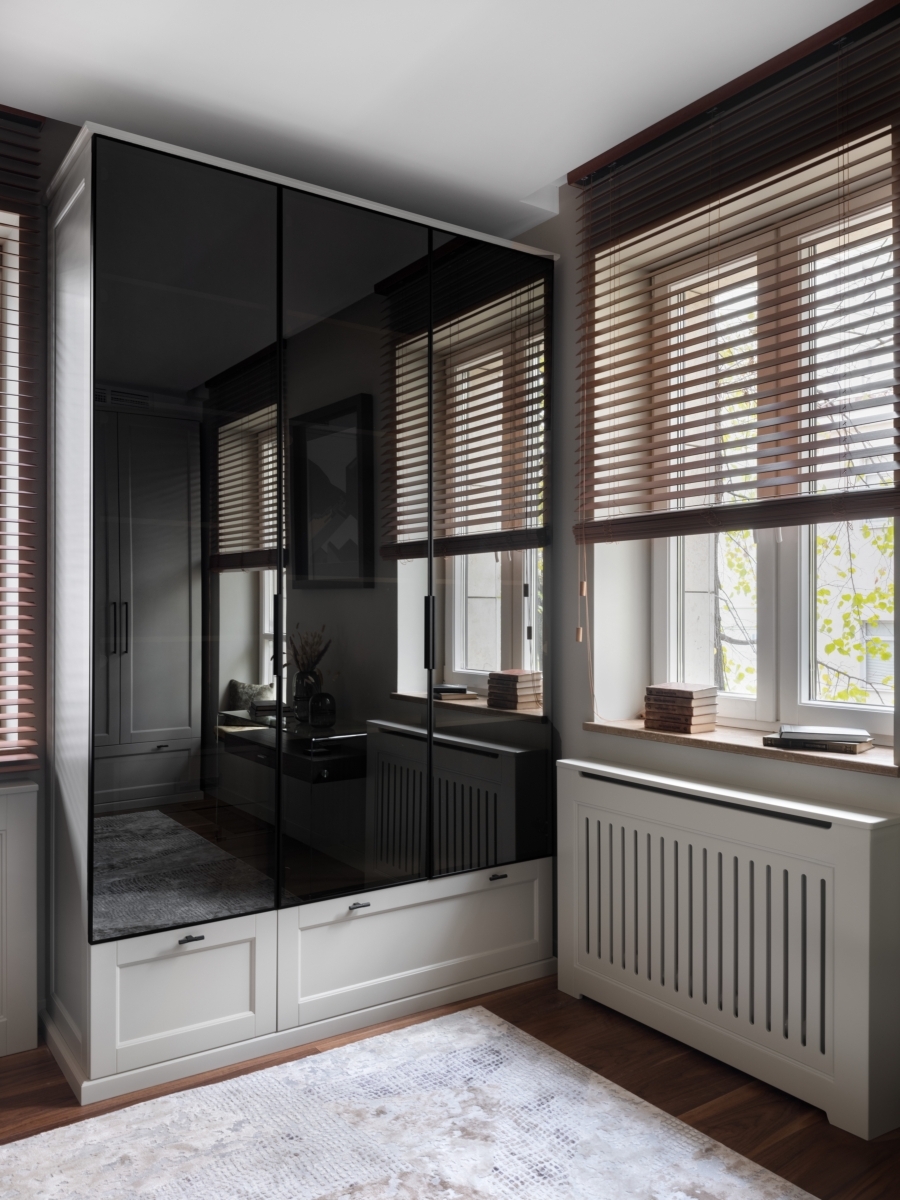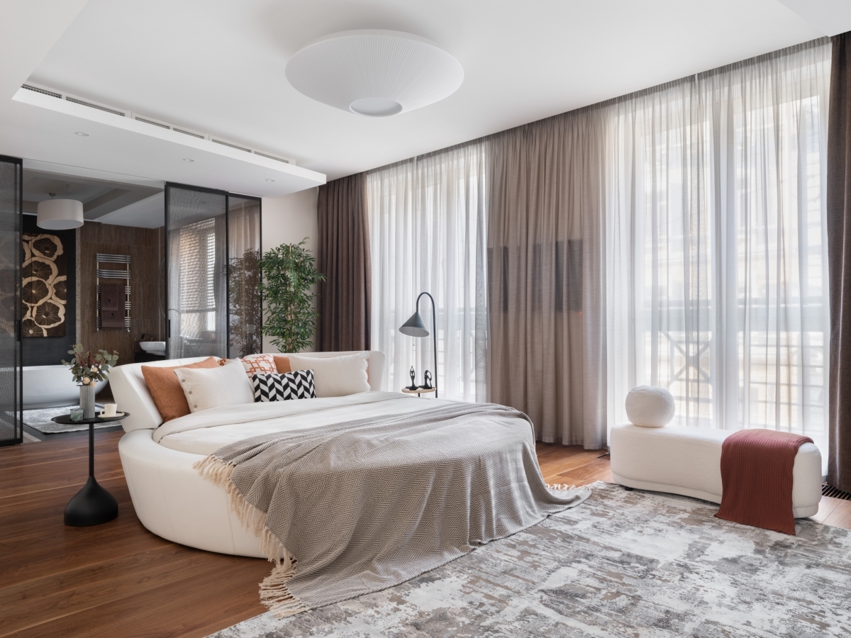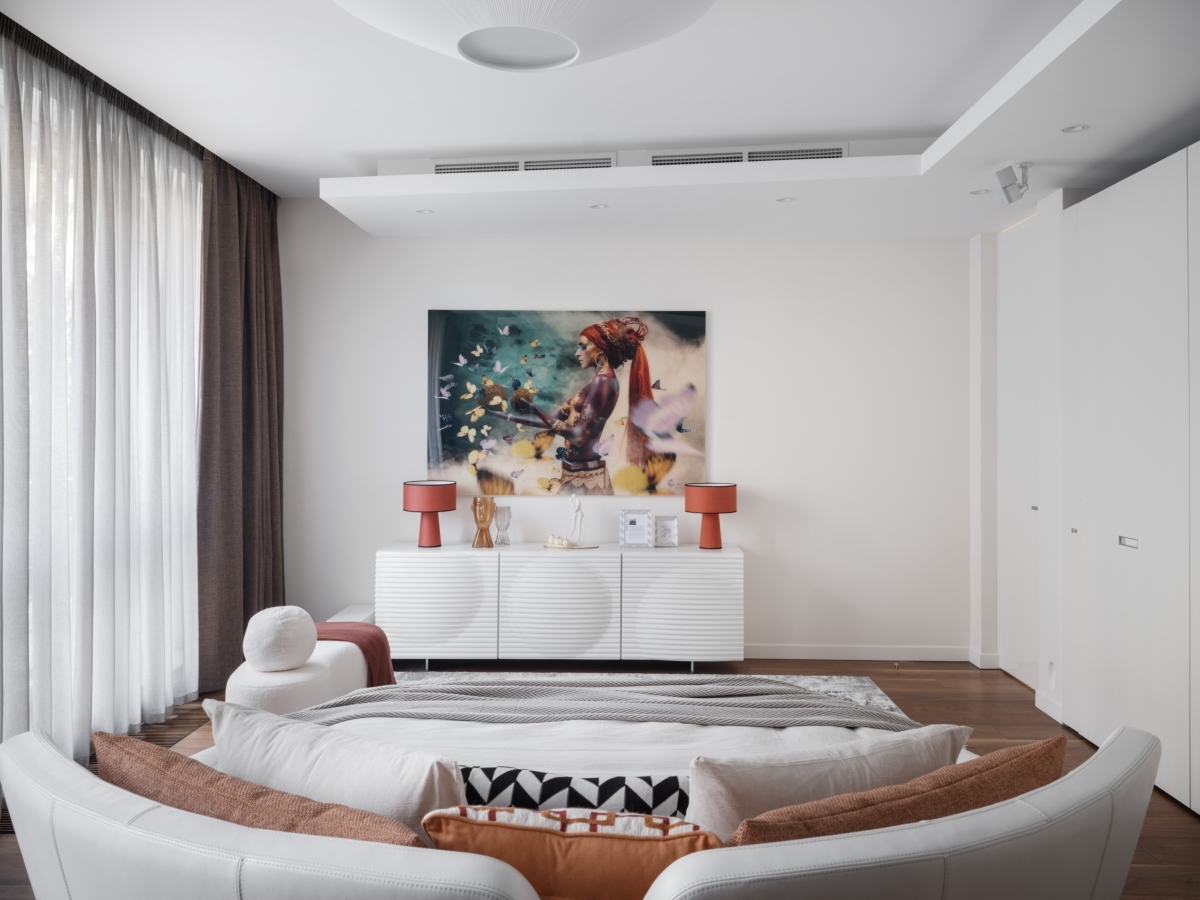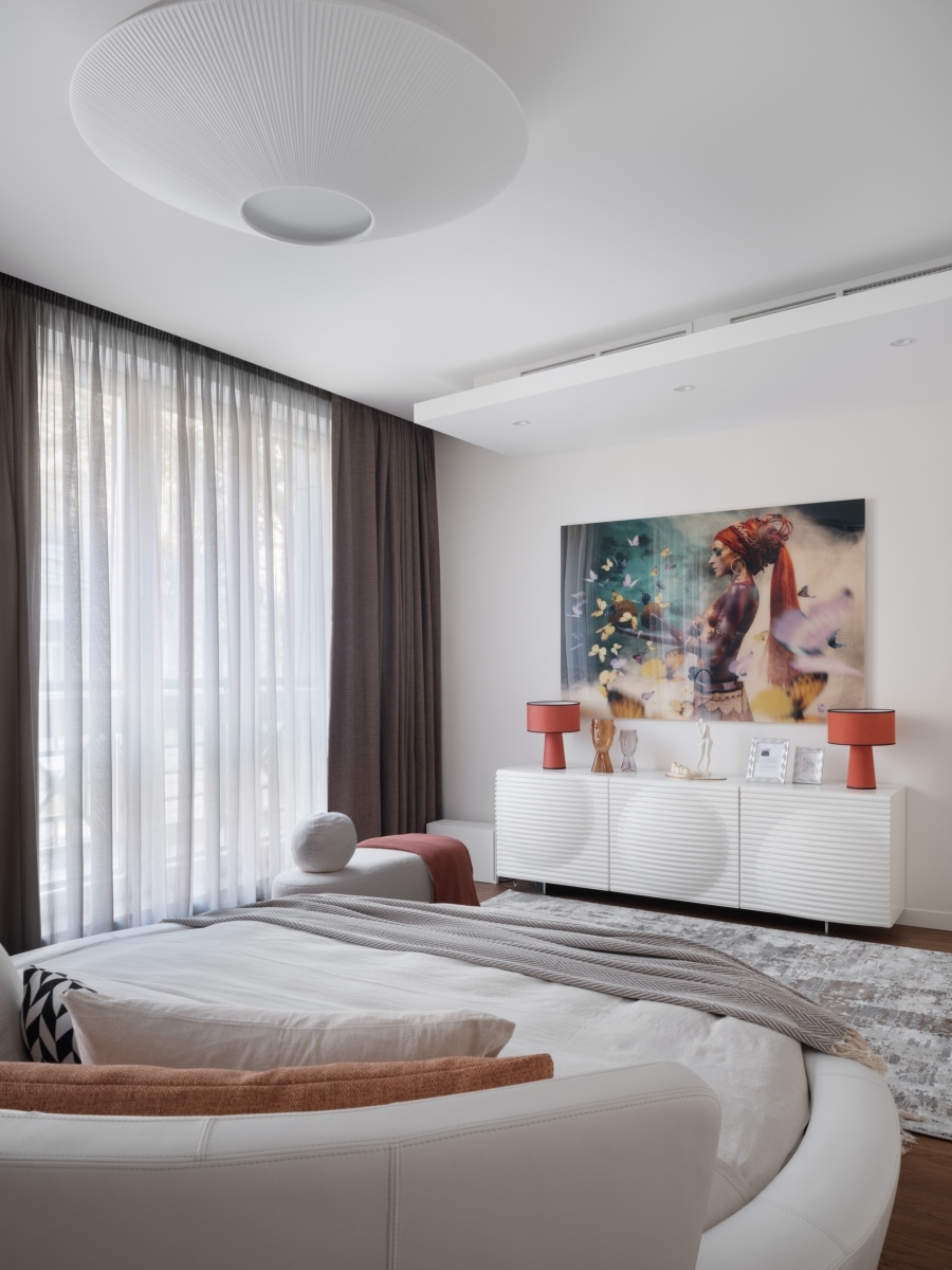 Эксперименты с зонированием продолжаются и в приватном блоке. В самом центре спальни — эффектная круглая кровать. Она визуально разделяет пространство и задает ритм другим элементам мебели — мотив круга повторяется и в форме светильников, и в авангардном рисунке комода. «Создавая интерьеры, я стараюсь опираться не на тренды, а на характер и пожелания заказчиков, их личные истории. В этом проекте мне удалось воплотить идею смешения стилей, но спокойного и гармоничного. Так хозяева квартиры смогут легко добавлять в интерьер детали, наполнять свой дом новыми смыслами, при этом общая концепция не нарушится», — заключает Алексия.