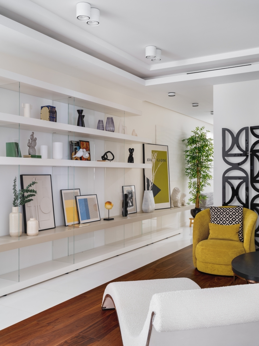 Квартира расположена в клубном доме премиум-класса, в самом сердце столицы, на Патриарших прудах. Заказчики — прогрессивная пара с космополитичными взглядами на дизайн, поэтому команде бюро во главе с Алексией Братушковой предстояло органично соединить несколько стилевых направлений. Отправной точкой проекта стал авангард — его черты считываются в архитектуре дома. «Для меня важно подчеркнуть связь между интерьером и экстерьером, — говорит Алексия Братушкова. — Так, в этом проекте фасад дома облицован мраморированным известняком молочного цвета — тот же известняк мы добавили в композицию из геометричных элементов в зоне гостиной. А оттенки зеленого в кабинете и санузлах перекликаются с цветом французских балкончиков на фасаде дома».