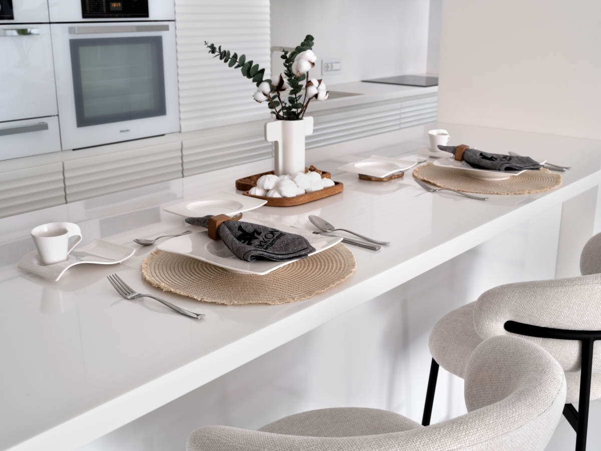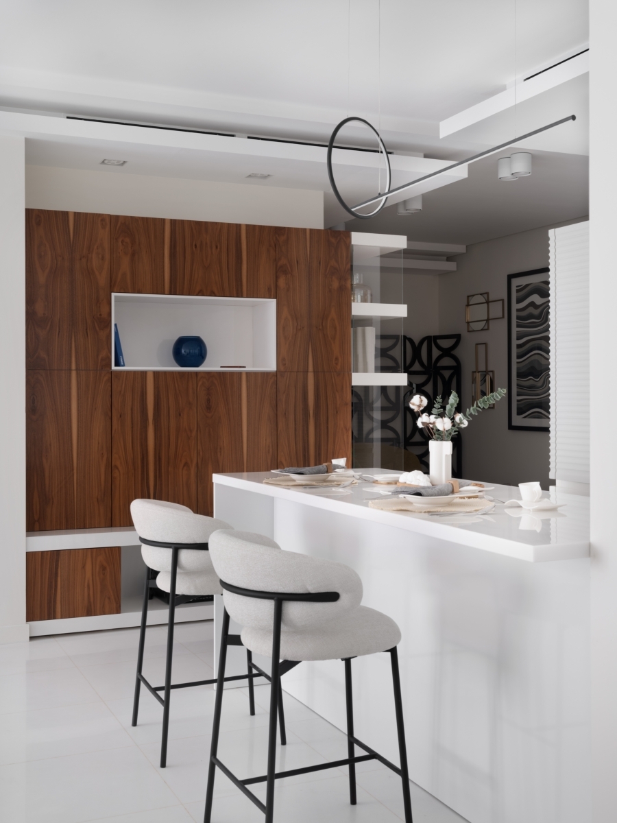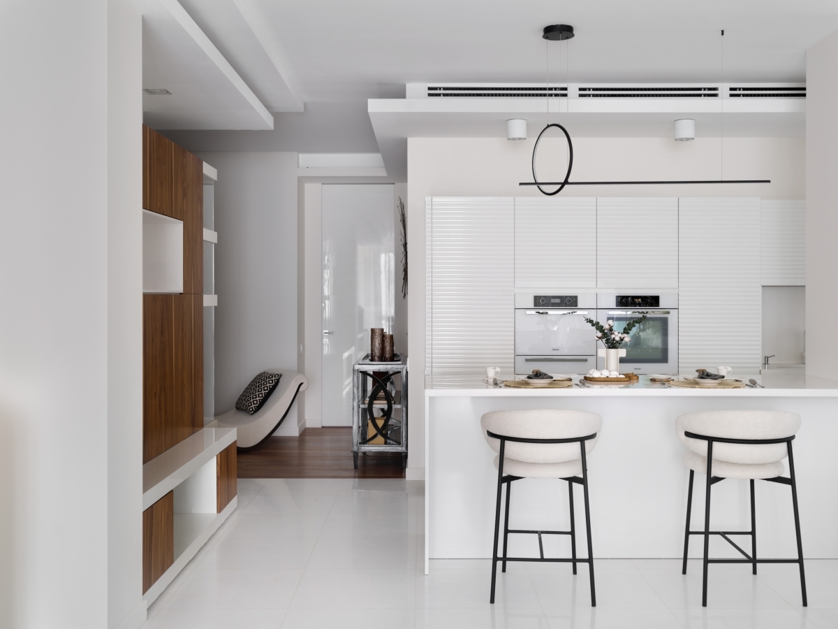 Зона кухни. Белые глянцевые фасады отражают потоки света из панорамных окон и делают кухню визуально более просторной. Кухня изготовлена на заказ (МДФ, эмаль под высоким глянцем), Алексия Братушкова. Столешница выполнена из кварцевого агломерата «Белая Тайга» от АВАРУС, «ГримаСтоун». Техника, Miele (Миле). Барные стулья, Adele (Адель). Светильники, Rum24 (Рум24). Зона кухни. Белые глянцевые фасады отражают потоки света из панорамных окон и делают кухню визуально более просторной. Кухня изготовлена на заказ (МДФ, эмаль под высоким глянцем), Алексия Братушкова. Столешница выполнена из кварцевого агломерата «Белая Тайга» от АВАРУС, «ГримаСтоун». Техника, Miele (Миле). Барные стулья, Adele (Адель). Светильники, Rum24 (Рум24).