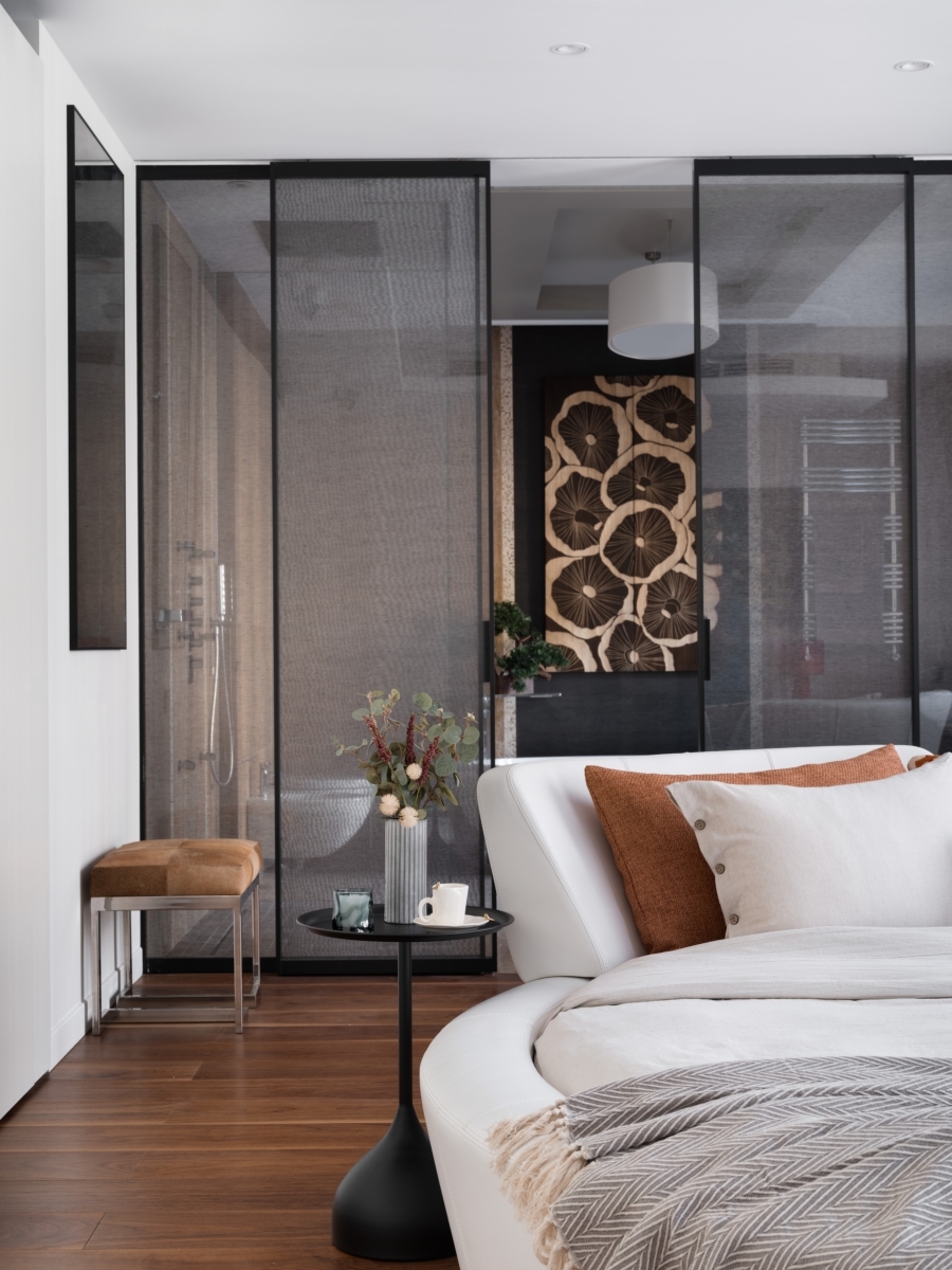 Спальня хозяев. Прозрачные перегородки Rimadesio (Римадезио) создают ощущение текучего пространства, где ванная комната логично продолжает зону спальни. Кровать Ivano Redaelli (Ивано Редаелли), торшер от Miniforms (Миниформс), светильник Bover (Бовер), перегородки — «ТРИО-интерьер». Текстиль и портьеры, Алексия Братушкова. Ковер «Ами Ковры». Столик, Артфабрик. Спальня хозяев. Прозрачные перегородки Rimadesio (Римадезио) создают ощущение текучего пространства, где ванная комната логично продолжает зону спальни. Кровать Ivano Redaelli (Ивано Редаелли), торшер от Miniforms (Миниформс), светильник Bover (Бовер), перегородки — «ТРИО-интерьер». Текстиль и портьеры, Алексия Братушкова. Ковер «Ами Ковры». Столик, Артфабрик.