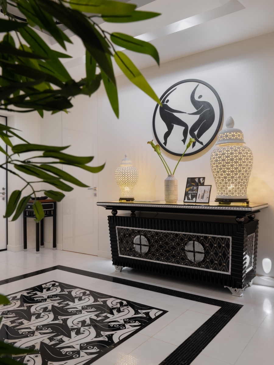 Фрагменты холла. Геометричное черно-белое панно на полу выполнено из итальянского мрамора и отсылает к работам Маурица Корнелиса Эшера. Диван Francesco Molon (Франческо Молон), «ТРИО-интерьер». Картина по мотивам работ Анри Матисса, Юлия Гантье. Краска Sanderson, компания Decorroom (ДекорРум). Фрагменты холла. Геометричное черно-белое панно на полу выполнено из итальянского мрамора и отсылает к работам Маурица Корнелиса Эшера. Диван Francesco Molon (Франческо Молон), «ТРИО-интерьер». Картина по мотивам работ Анри Матисса, Юлия Гантье. Краска Sanderson, компания Decorroom (ДекорРум).