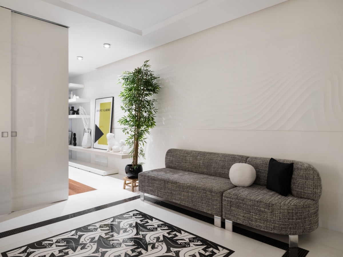 Изначальная планировка квартиры отвечала всем пожеланиям заказчиков. Просторный холл плавно перетекает в общее пространство гостиной, столовой и кухни. В нем же обустроили уютную зону библиотеки. В приватном блоке — хозяйская спальня со своим санузлом и кабинет, который может в будущем послужить и гостевой, и детской. В основу интерьерной концепции легло творчество нидерландского художника-графика Маурица Корнелиса Эшера. Эксперименты с формой, перспективой и логикой пространства в его работах на стыке сюрреализма и поп-арта отражают характер проекта — многослойный, динамичный, построенный на контрастах. К гравюрам Эшера отсылает геометричное панно из нескольких сортов мрамора в холле, его же литографии украшают стены кабинета.