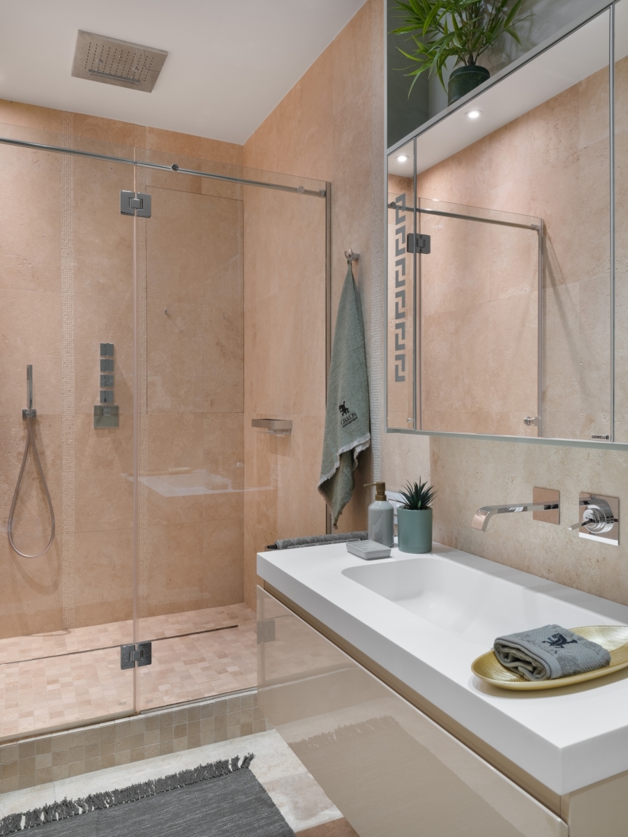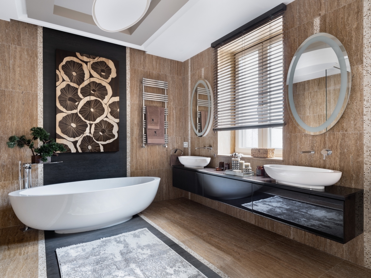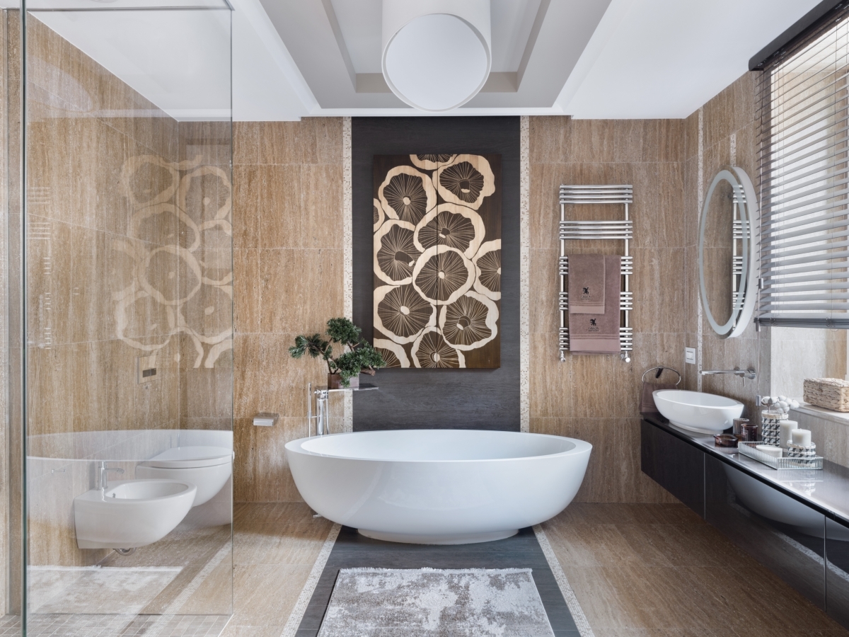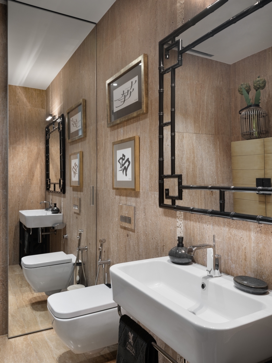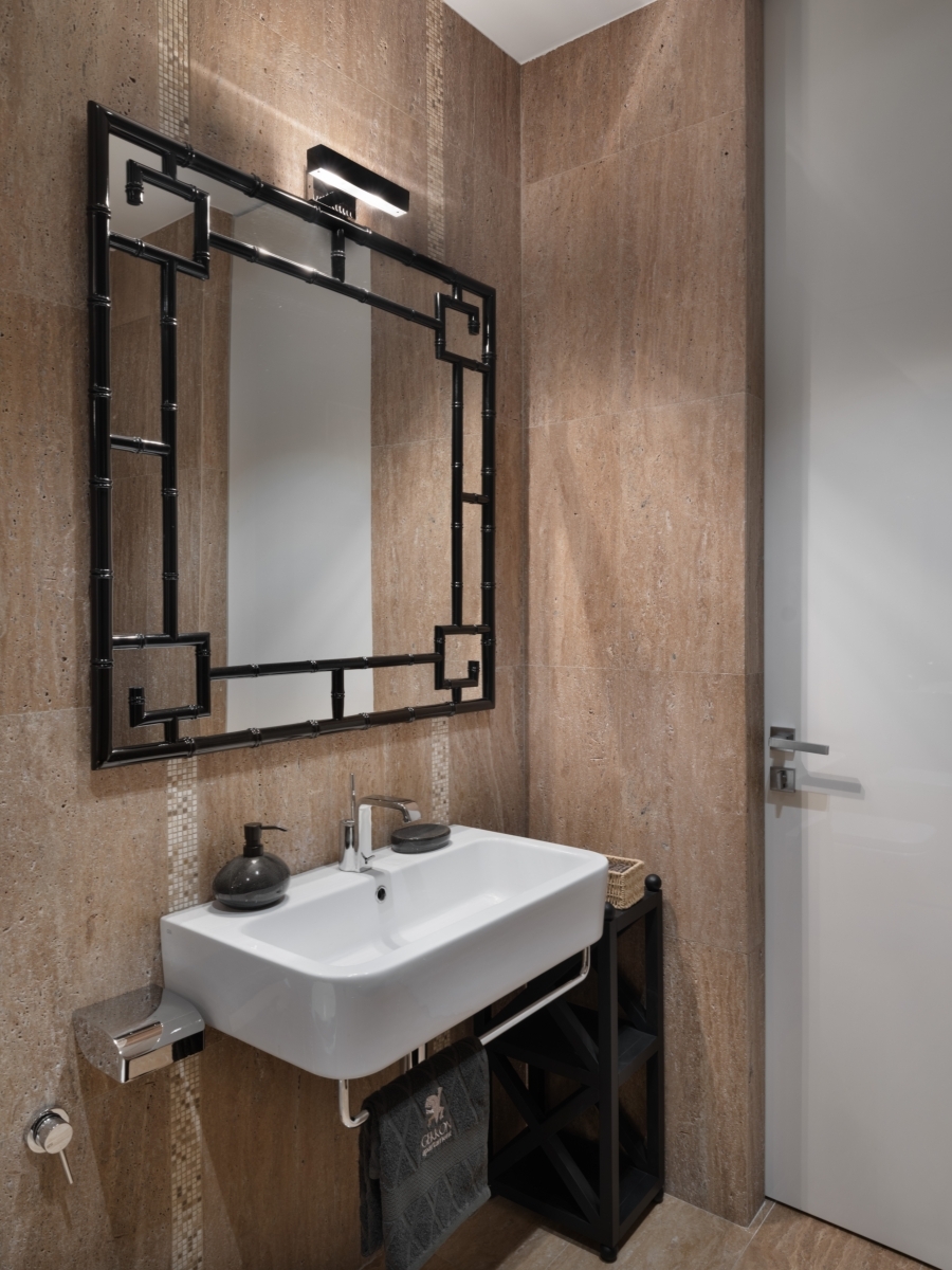 Ванная комната. Взгляд сразу приковывает композиция из дерева — изящная отсылка к работам восточных мастеров. Сочетание стекла и натурального камня теплого шоколадного оттенка придает обстановке нотку утонченности и респектабельности. Стены отделаны натуральным травертином. Ванна, сантехника и аксессуары Gessi (Гесси), «Европейская Сантехника». Светильник Bover (Бовер), «ТРИО- интерьер». Бонсай, компания «РОССКА». Ванная комната. Взгляд сразу приковывает композиция из дерева — изящная отсылка к работам восточных мастеров. Сочетание стекла и натурального камня теплого шоколадного оттенка придает обстановке нотку утонченности и респектабельности. Стены отделаны натуральным травертином. Ванна, сантехника и аксессуары Gessi (Гесси), «Европейская Сантехника». Светильник Bover (Бовер), «ТРИО- интерьер». Бонсай, компания «РОССКА».