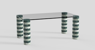Основание обеденных столов и кофейных столиков сделано из натурального камня: разными сортами цветного мрамора выложен полосатый узор.