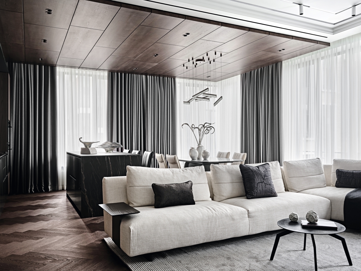 Гостиная. Диван, Ditre Italia. Напольное покрытие — инженерная доска Coswick. Шпонированный потолок Esse со встроенной системой света от Центрсвет. Ковер, Dovlet House. Гостиная. Диван, Ditre Italia. Напольное покрытие — инженерная доска Coswick. Шпонированный потолок Esse со встроенной системой света от Центрсвет. Ковер, Dovlet House.