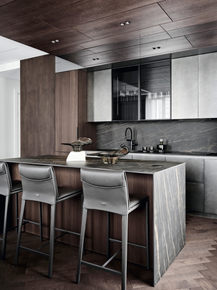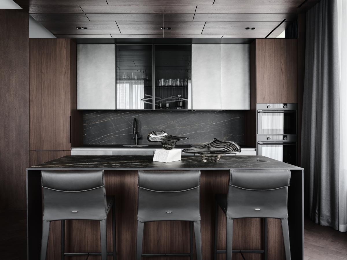 Кухня отличается продуманной эргономикой и обилием встроенной техники. В основной рабочей зоне предусмотрена техническая ниша, где скрыты розетки и интегрированы рейлинговые системы для хранения кухонной утвари, обеспечивая идеальный порядок. Цветовая гамма кухонного гарнитура выдержана в теплых тонах натурального дерева, в то время как навесные шкафы выполнены в контрастном ключе. Их фасады изготовлены из тонированного стекла. Центральным элементом пространства выступает кухонный остров, который разграничивает зону кухни и отдыха. Мебельные фасады, скрывающие технику, выполнены в насыщенном цвете графита, что создает гармоничный дуэт с металлическими рамами и тонированным стеклом витрин. А завершает композицию вставка из состаренного зеркала в верхней части гарнитура.