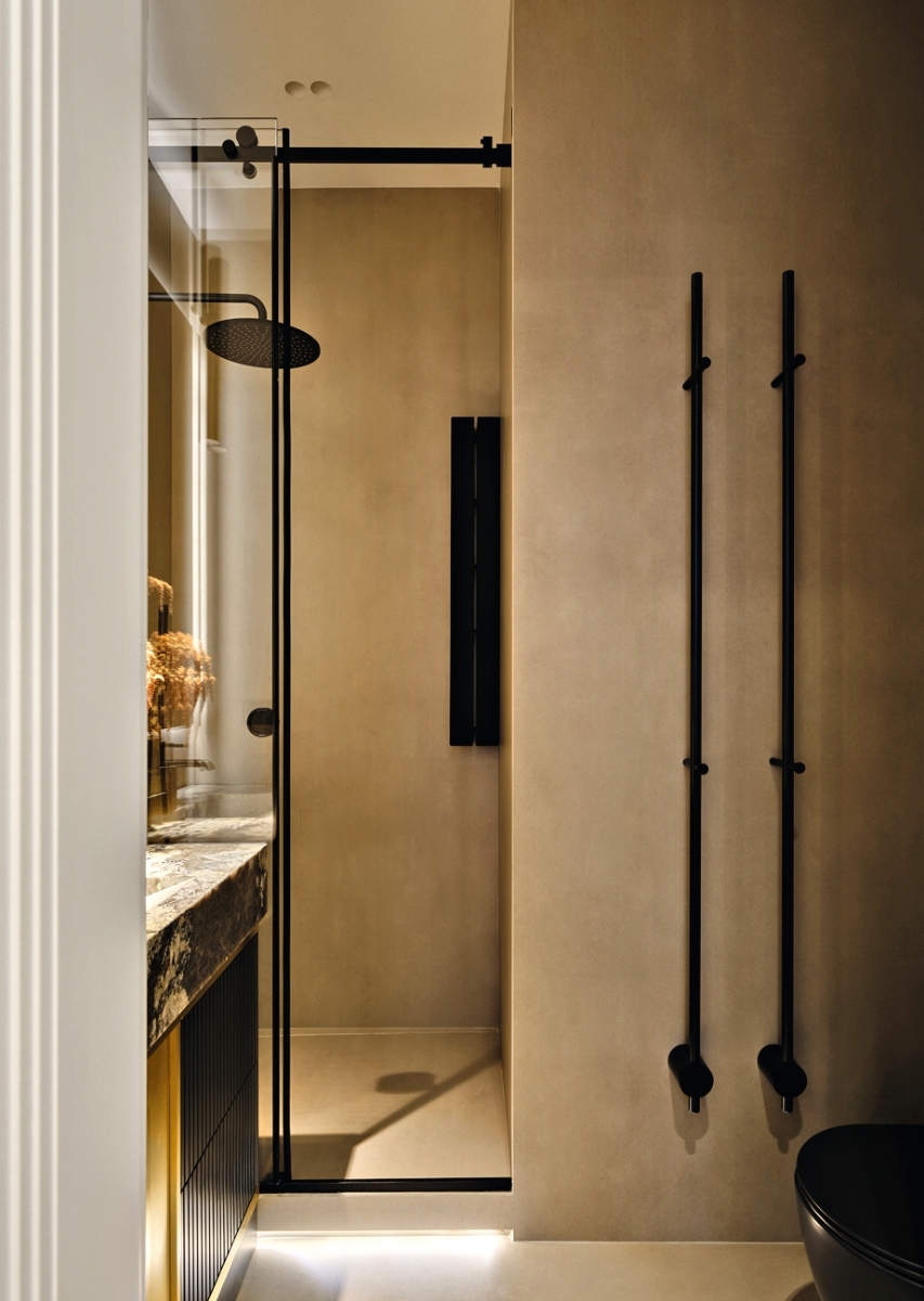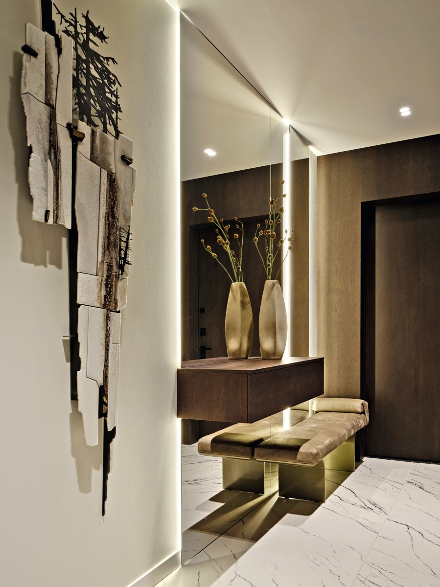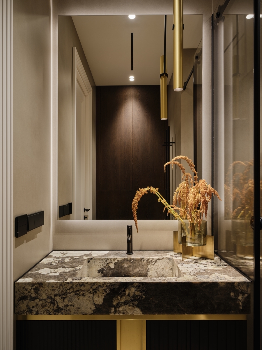 «Задача состояла в том, чтобы интерьер стал не просто фоном, а органичным продолжением внутреннего мира владельцев — ценителей современного искусства, — дополняет автор проекта Екатерина Дурава. — Мы стремились создать не просто красивое пространство, а уютное, спокойное убежище для отдыха, наполненное ощущением глубокой релаксации и гармонии. Такого эффекта мы добились благодаря выверенному стилю и сложной, многослойной цветовой палитре в сочетании с текстурой натурального дерева и природного камня».