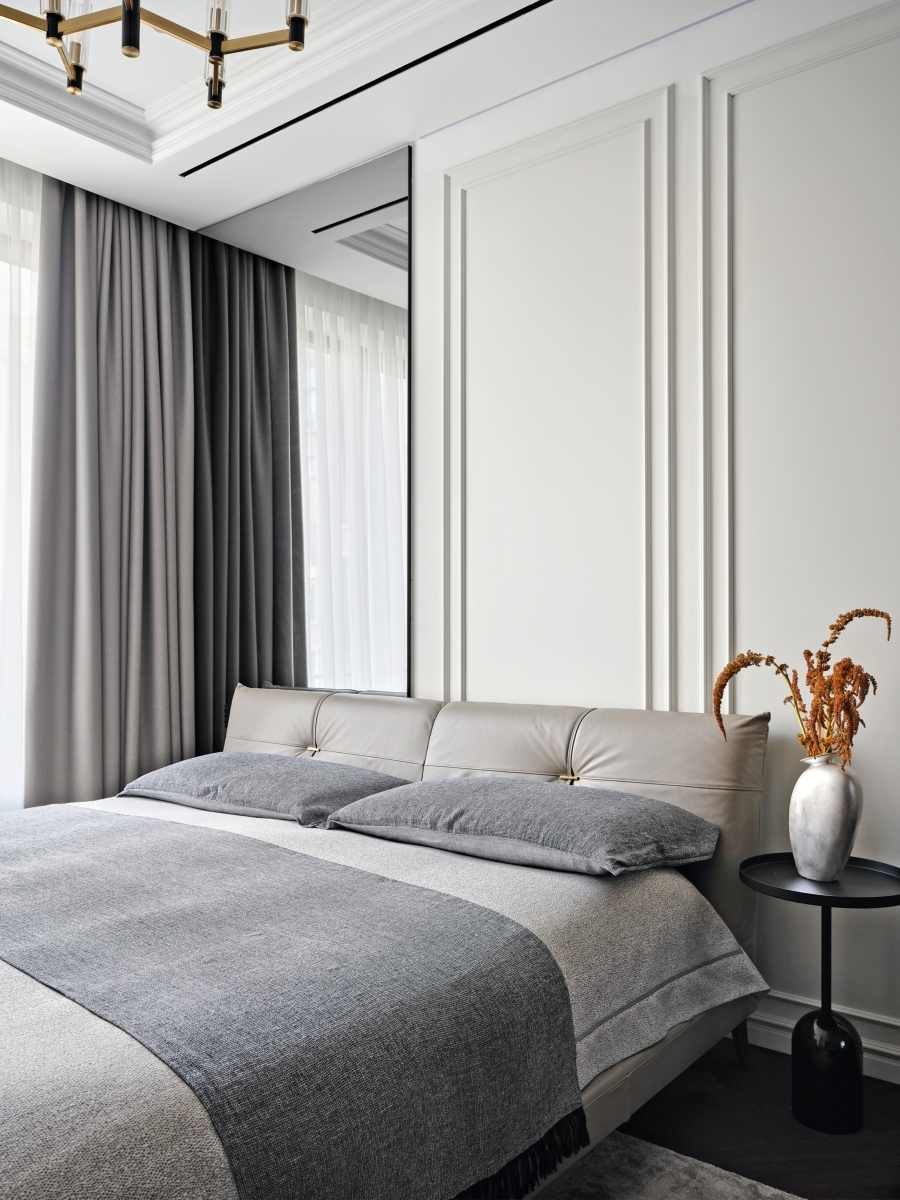 Спальная комната объединяет три важнейшие функции: гигиену — в просторной ванной комнате, организацию хранения — во вместительной гардеробной, а также создание комфортной атмосферы для сна и уединенной работы.