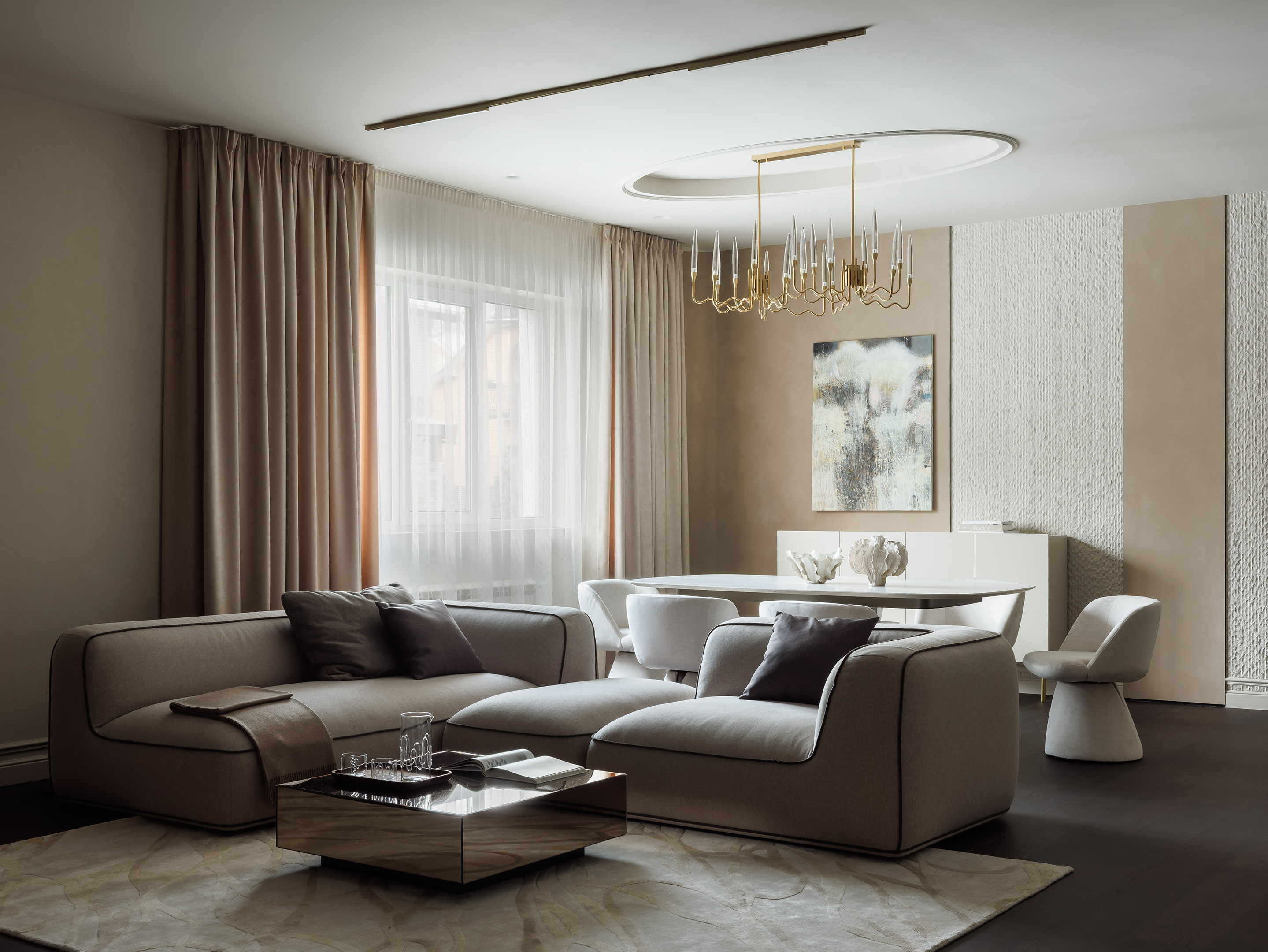 Зона гостиной-столовой. На стенах — декоративная штукатурка Polivelure Opaco San Marito и фактурные панели под камень WallPanels Flex Stone от Decaro. Диван «Баллон», обеденный стол «Баул», ТОК. Обеденные стулья со вставками из шпона ореха выполнены на заказ по эскизам дизайнера компаний SoftHome store. Ковер, kover.ru. Светильник с лепным декором Rodecor выполнен компанией Mebeliana по эскизам дизайнера. Картина «Без названия №433», Юрий Первушин, ArtMaley Gallery. Декор, Laboratory dome, Galerie 46, Chertogi. Зона гостиной-столовой. На стенах — декоративная штукатурка Polivelure Opaco San Marito и фактурные панели под камень WallPanels Flex Stone от Decaro. Диван «Баллон», обеденный стол «Баул», ТОК. Обеденные стулья со вставками из шпона ореха выполнены на заказ по эскизам дизайнера компаний SoftHome store. Ковер, kover.ru. Светильник с лепным декором Rodecor выполнен компанией Mebeliana по эскизам дизайнера. Картина «Без названия №433», Юрий Первушин, ArtMaley Gallery. Декор, Laboratory dome, Galerie 46, Chertogi.
