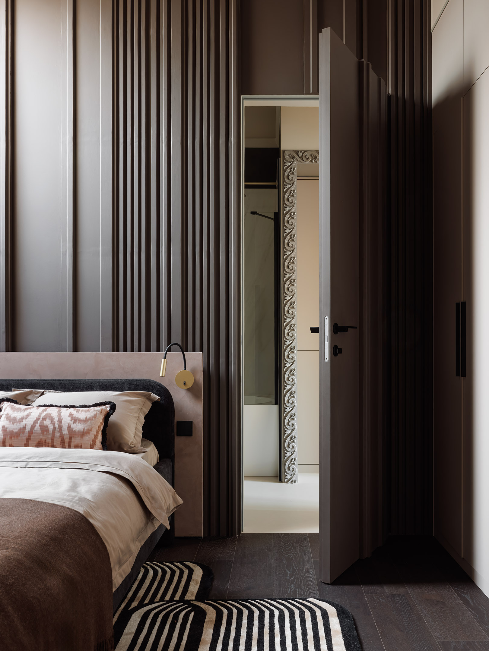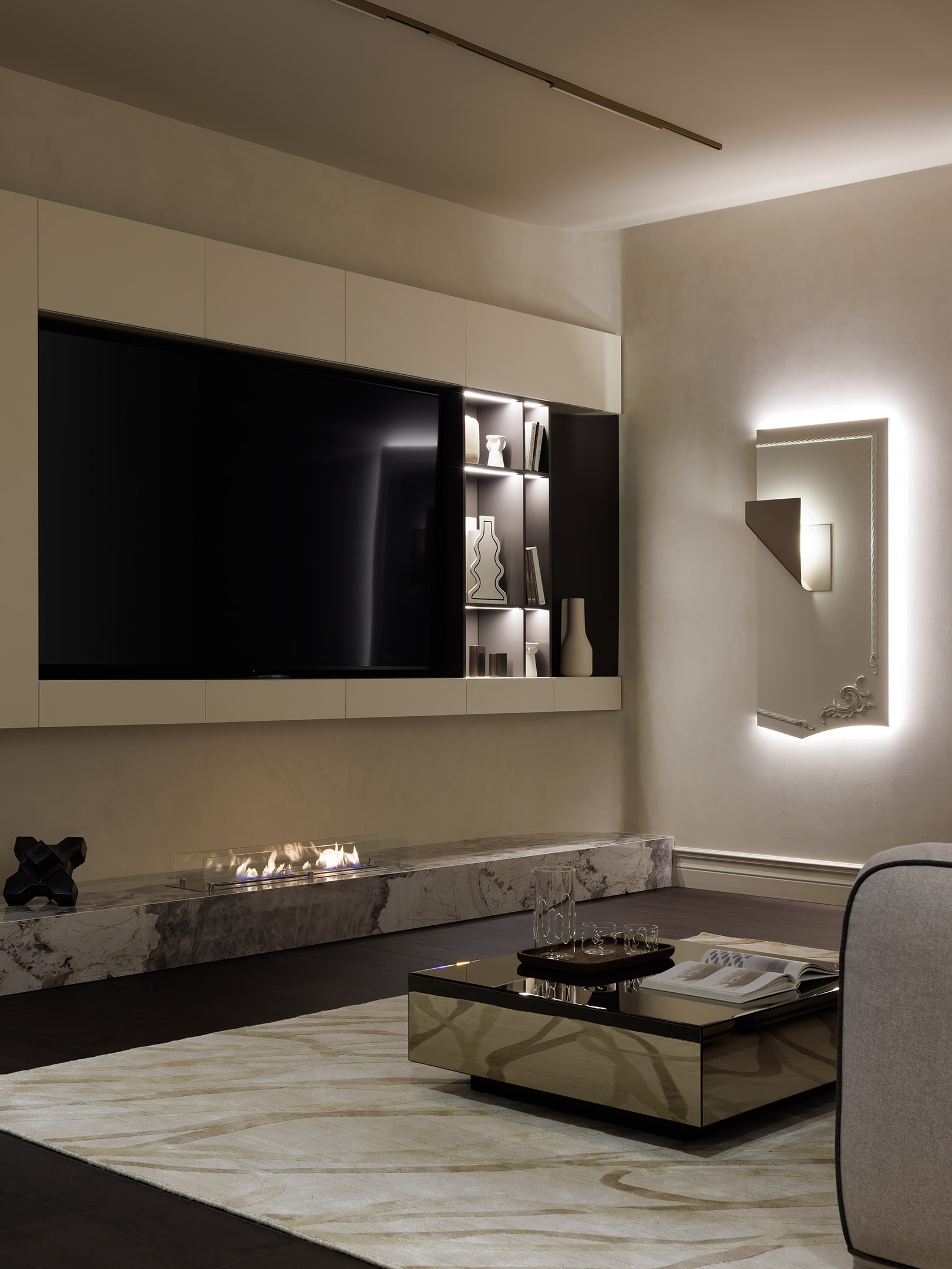 Огромный телевизор незаметен за счет смещения акцентов. Он встроен в нишу, выделенную глубоко коричневым, почти черным цветом в комбинации с открытыми декоративными полками. В фокусе внимания — камень «Патагония» с биокамином Royal Thermo, скругленная форма стены, мебели и зеркальный бронзовый столик, игриво отражающий узоры ковра. Стену украшает арт-объект, ставший главным акцентом диванной зоны. «Эта композиция, по сути, кратко отражает стилистику всего интерьера, — комментирует решение дизайнер. — Это светильник Mantra из металла мягкой и одновременно очень геометричной формы, виртуозно встроенный компанией Mebeliana в декоративную панель неправильной формы, которая ломает традиционное восприятие неоклассики. А венчает всю композицию потрясающая лепнина Rodecor. Фоновая подсветка подчеркивает фактуру «замшевого» декоративного покрытия Polivelure Opaco San Marito. Роскошь нежного лепного декора контрастирует с холодным металлом и обрамляется в абсолютно неклассическую форму. Именно таким настроением пропитан весь интерьер». Ковер, kover.ru. Декор, Laboratory dome, Galerie 46, Chertogi. Трековая система, Denkirs. Огромный телевизор незаметен за счет смещения акцентов. Он встроен в нишу, выделенную глубоко коричневым, почти черным цветом в комбинации с открытыми декоративными полками. В фокусе внимания — камень «Патагония» с биокамином Royal Thermo, скругленная форма стены, мебели и зеркальный бронзовый столик, игриво отражающий узоры ковра. Стену украшает арт-объект, ставший главным акцентом диванной зоны. «Эта композиция, по сути, кратко отражает стилистику всего интерьера, — комментирует решение дизайнер. — Это светильник Mantra из металла мягкой и одновременно очень геометричной формы, виртуозно встроенный компанией Mebeliana в декоративную панель неправильной формы, которая ломает традиционное восприятие неоклассики. А венчает всю композицию потрясающая лепнина Rodecor. Фоновая подсветка подчеркивает фактуру «замшевого» декоративного покрытия Polivelure Opaco San Marito. Роскошь нежного лепного декора контрастирует с холодным металлом и обрамляется в абсолютно неклассическую форму. Именно таким настроением пропитан весь интерьер». Ковер, kover.ru. Декор, Laboratory dome, Galerie 46, Chertogi. Трековая система, Denkirs.