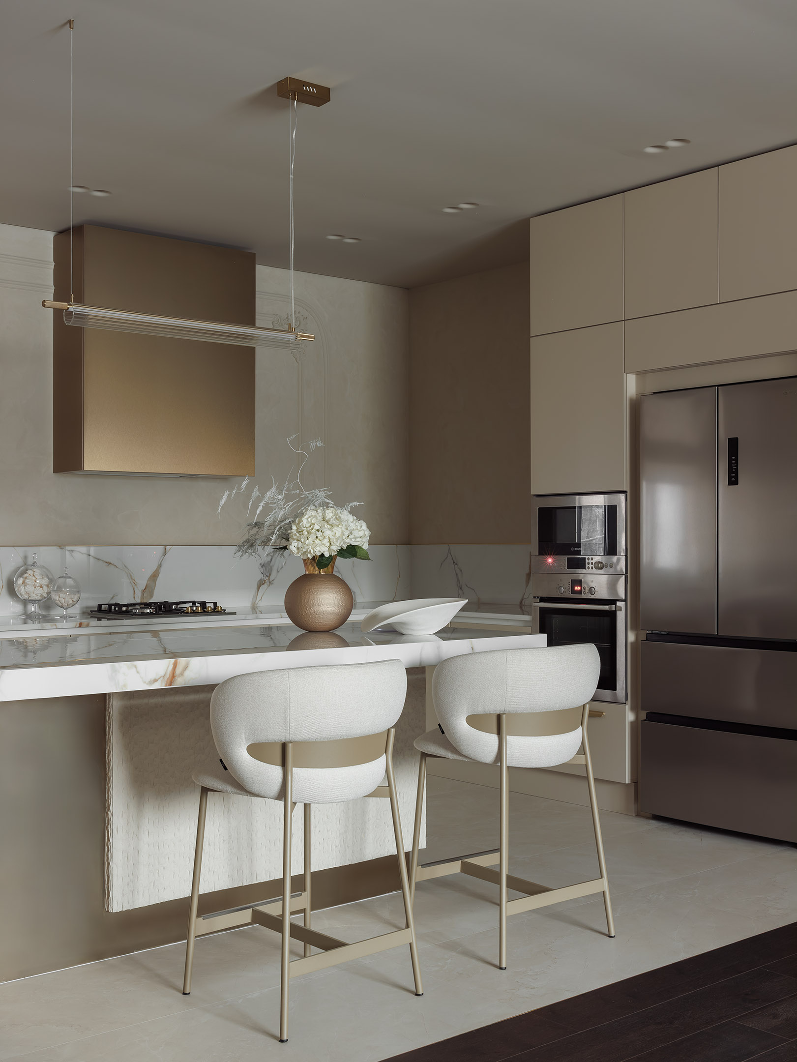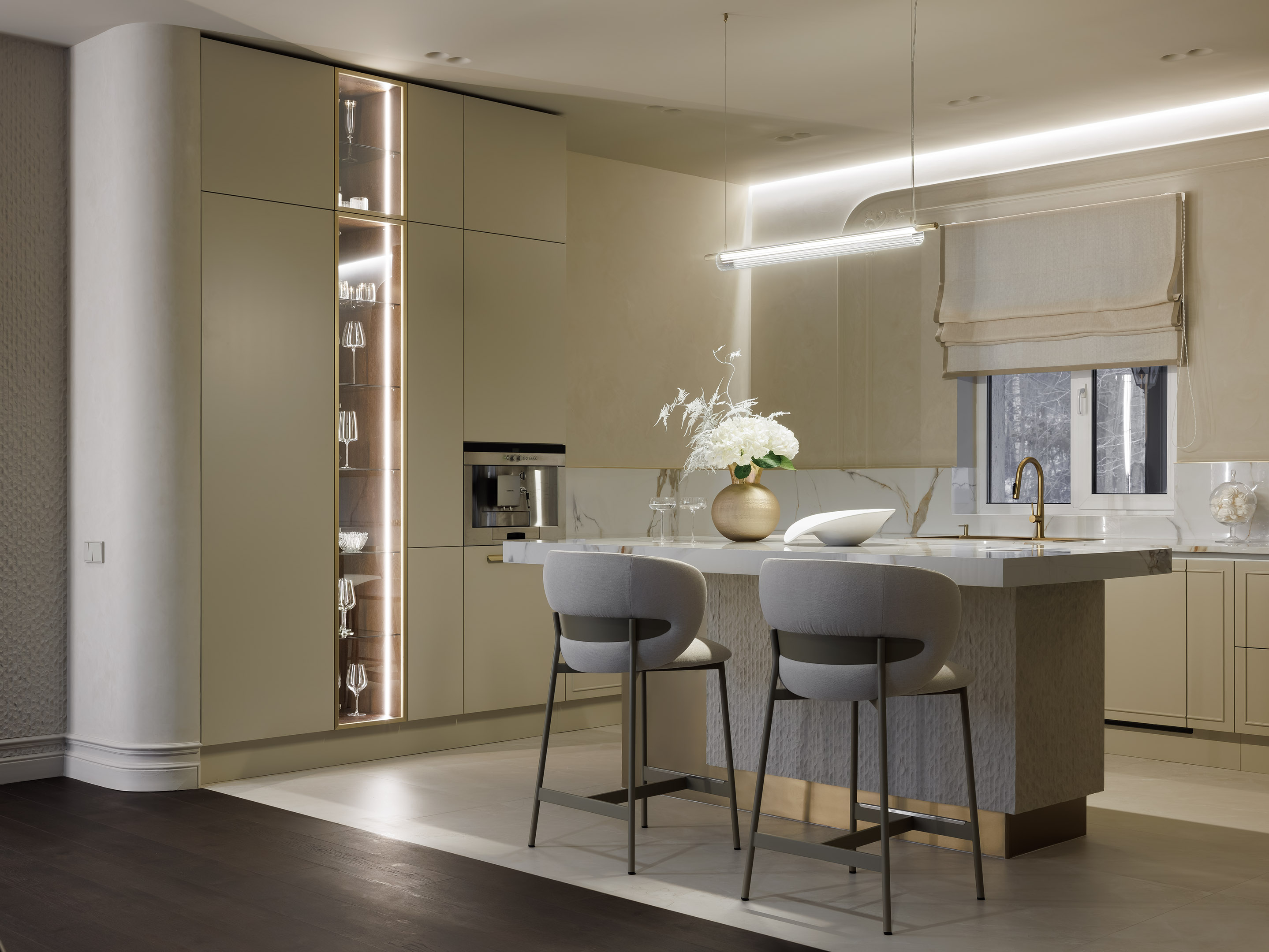 Остров, как главный центр притяжения, собрал в себе все самые необычные материалы интерьера: панели под камень, латунь и глянцевый керамогранит. В столешнице из Calacatta Borghin предусмотрен встроенный блок розеток. Полубарные стулья, ТОК. Остров, как главный центр притяжения, собрал в себе все самые необычные материалы интерьера: панели под камень, латунь и глянцевый керамогранит. В столешнице из Calacatta Borghin предусмотрен встроенный блок розеток. Полубарные стулья, ТОК.