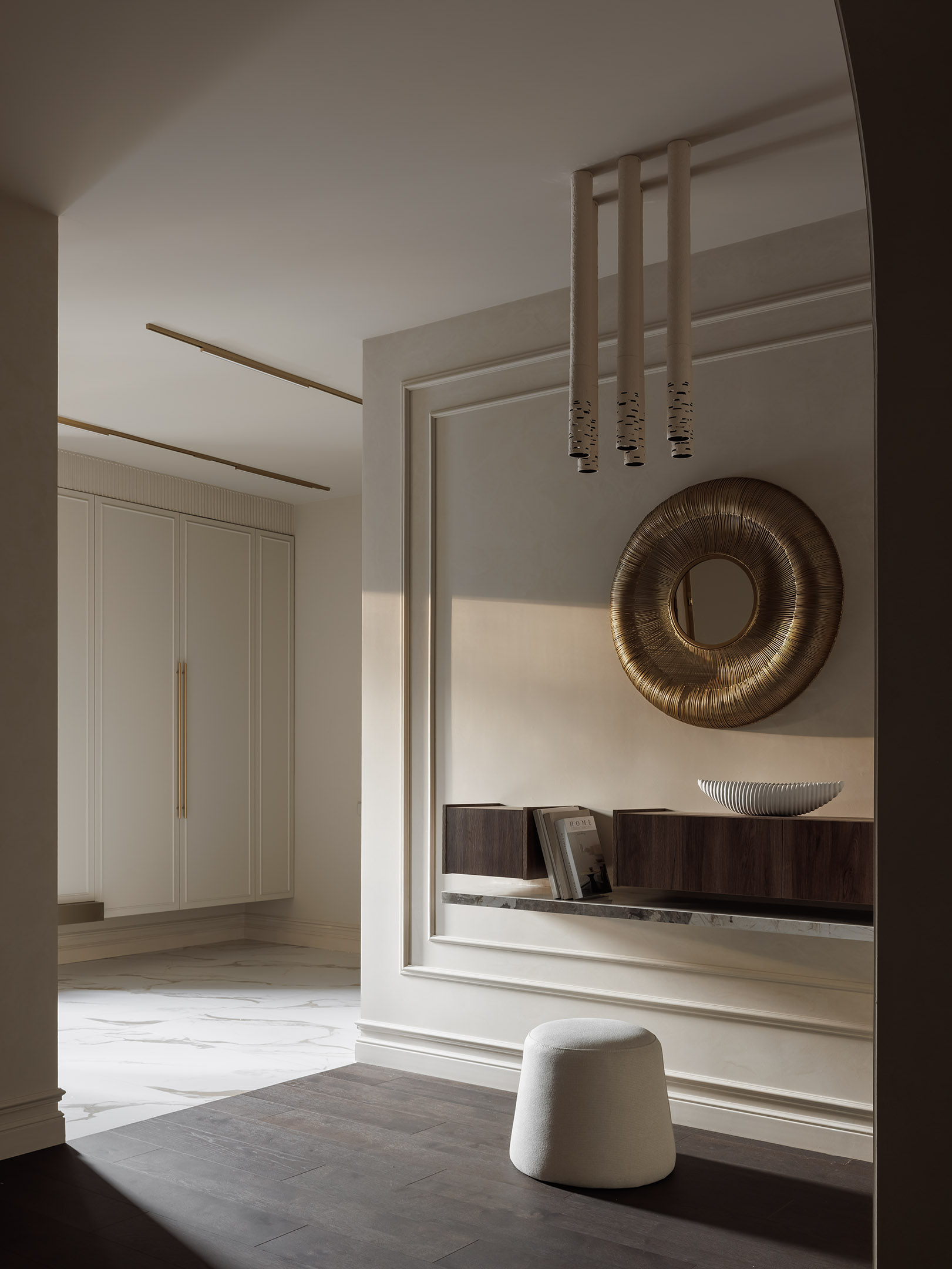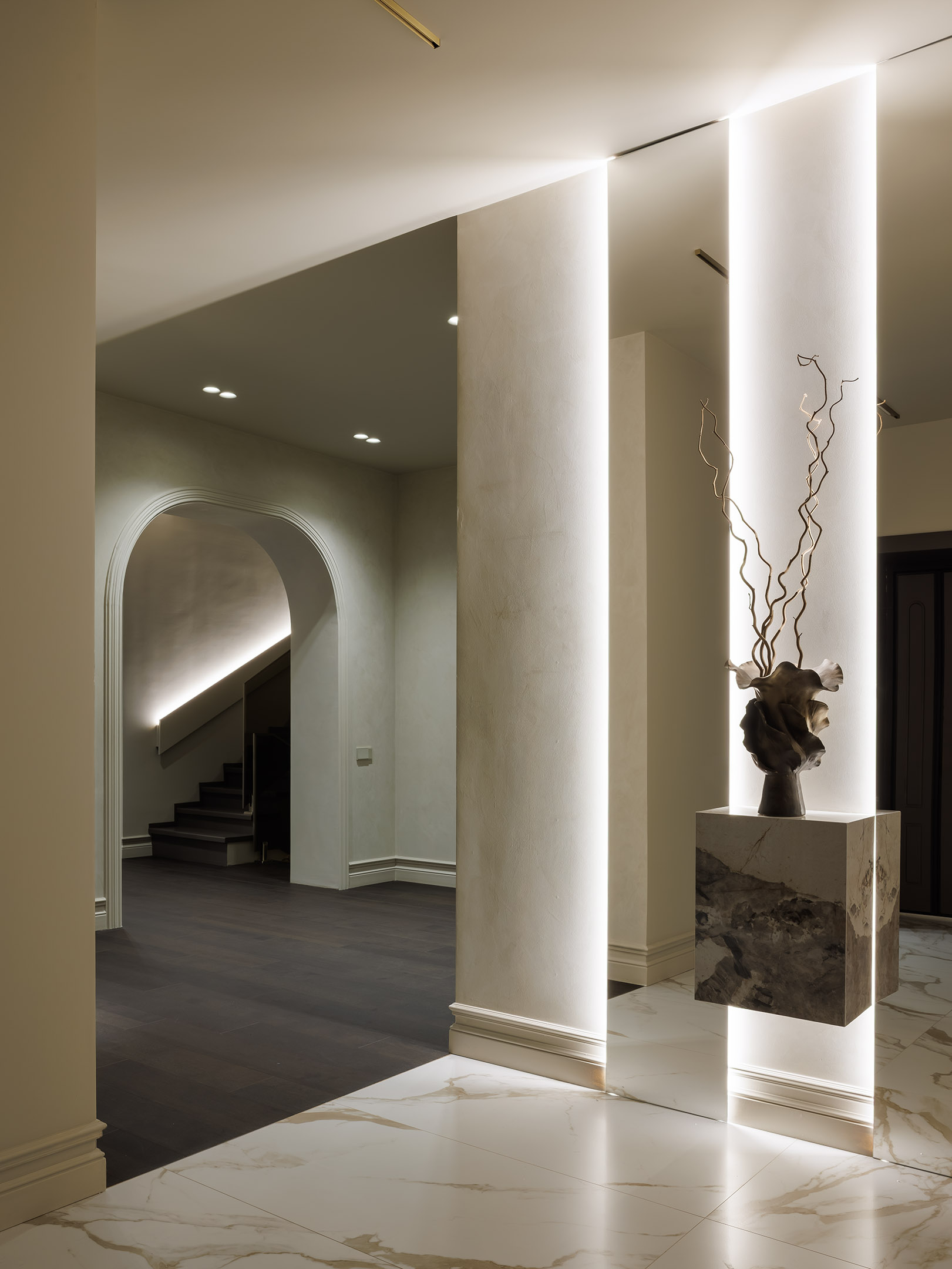«Первое, что мы видим при входе в дом — это композиция из зеркал, подсветка которой выгодно подчеркивает фактуру стен и тумбы из керамогранита Patagonia Quartzite, — говорит автор проекта. — Входящий видит не просто зеркало и свое отражение. За счет комбинации элементов он скорее начнет рассматривать интерьер, чем любоваться собой. Зеркала тут выполняют больше комплементарную функцию, несмотря на их большие размеры. Все материалы и декор при таком освещении создают атмосферу спокойствия и тепла». Cтены и потолок отделаны декоративной штукатуркой Polivelure Opaco San Marito от Piterra. Трековая система, Denkirs. Керамика, Chertogi. «Первое, что мы видим при входе в дом — это композиция из зеркал, подсветка которой выгодно подчеркивает фактуру стен и тумбы из керамогранита Patagonia Quartzite, — говорит автор проекта. — Входящий видит не просто зеркало и свое отражение. За счет комбинации элементов он скорее начнет рассматривать интерьер, чем любоваться собой. Зеркала тут выполняют больше комплементарную функцию, несмотря на их большие размеры. Все материалы и декор при таком освещении создают атмосферу спокойствия и тепла». Cтены и потолок отделаны декоративной штукатуркой Polivelure Opaco San Marito от Piterra. Трековая система, Denkirs. Керамика, Chertogi.