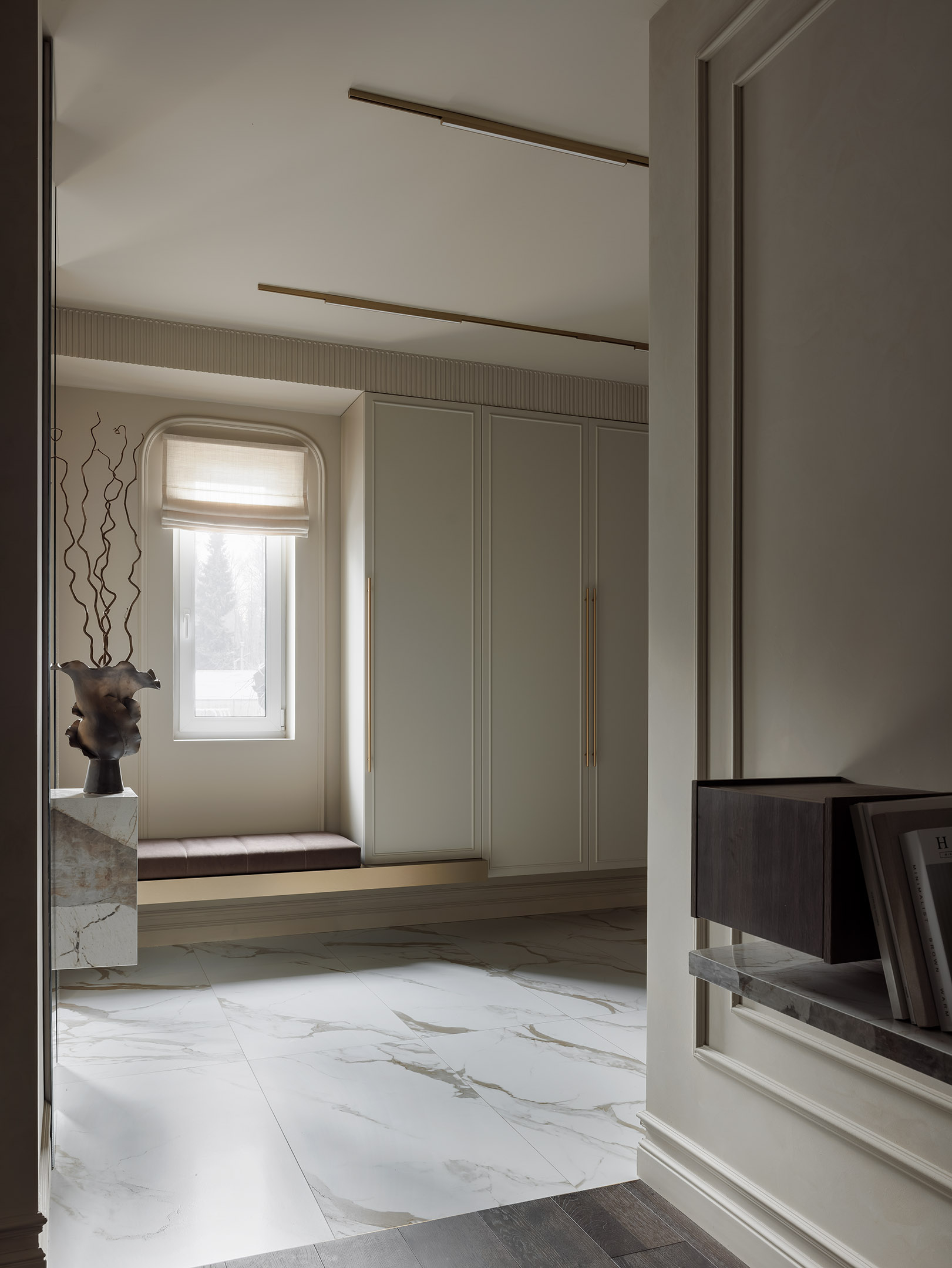 Еще одно удобное и стильное решение — в шкаф интегрирована мягкая скамья,