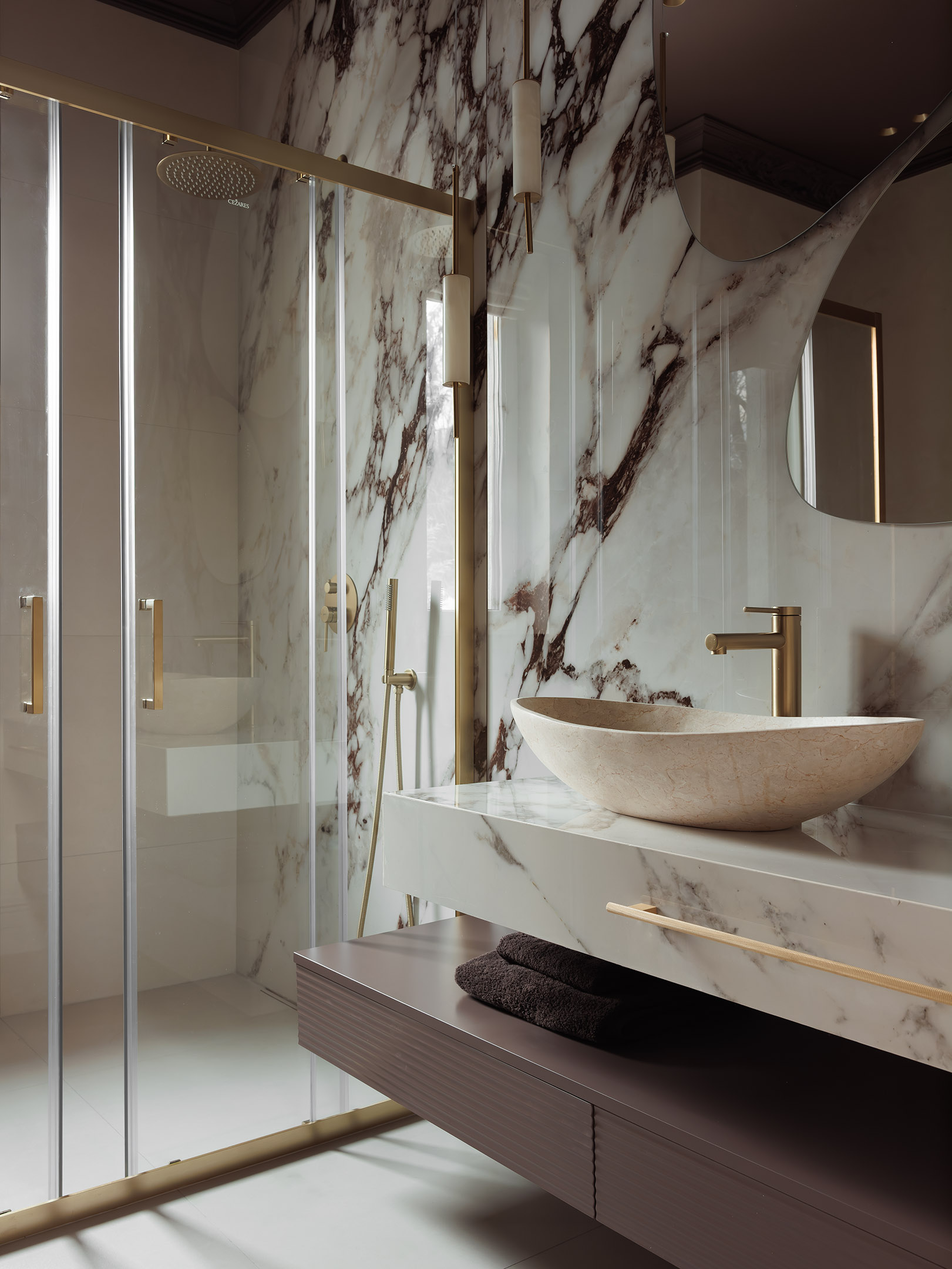 Особую парадность санузлу придает яркий широкоформатный керамогранит Les Bijoux Breche Capraia Matte от REX Ceramiche, и резные карнизы, выкрашенные с потолком в темный цвет «горячий какао» из палитры San Marito. Раковина из камня Amethyst White, Teak House. Особую парадность санузлу придает яркий широкоформатный керамогранит Les Bijoux Breche Capraia Matte от REX Ceramiche, и резные карнизы, выкрашенные с потолком в темный цвет «горячий какао» из палитры San Marito. Раковина из камня Amethyst White, Teak House.
