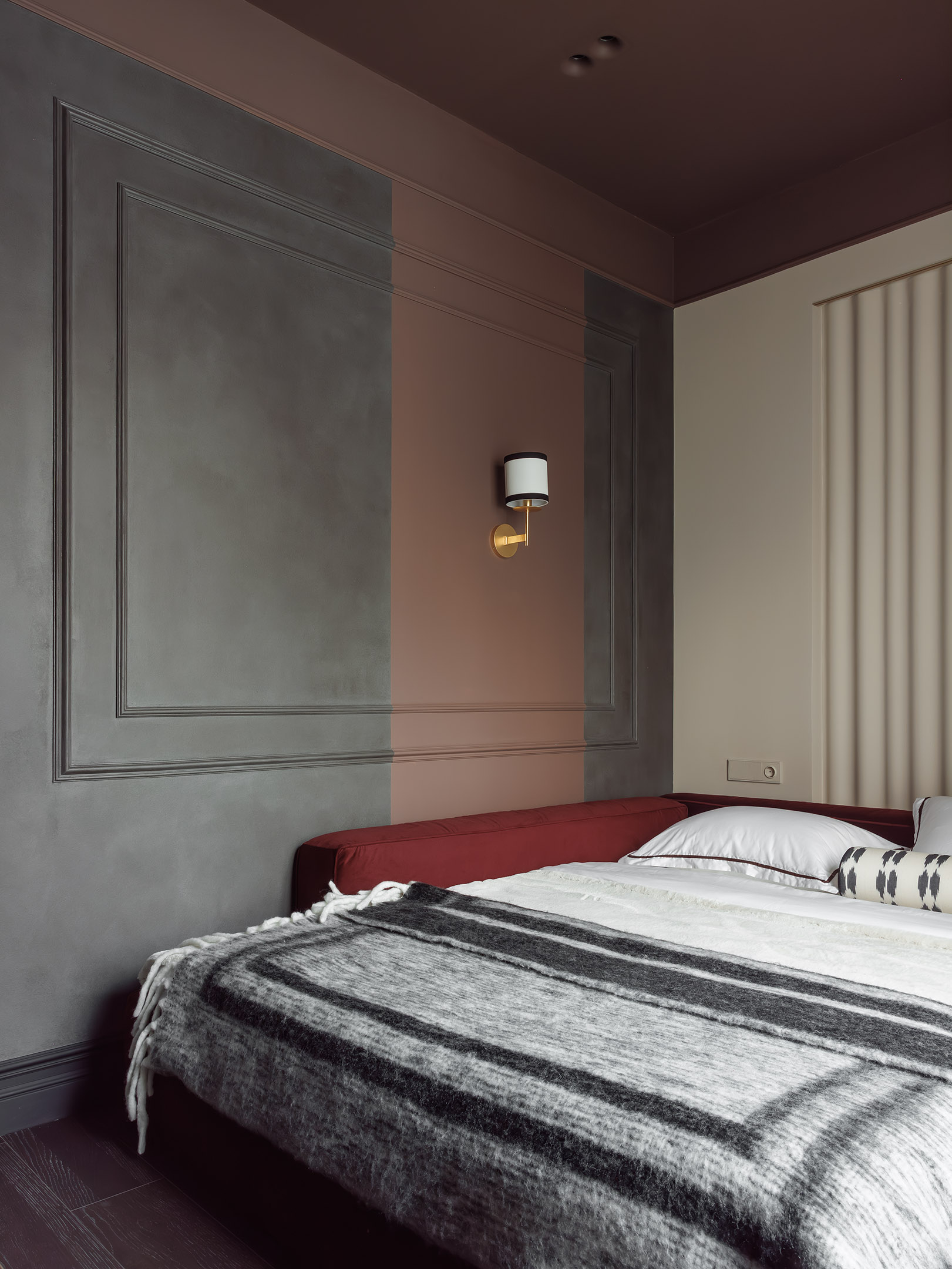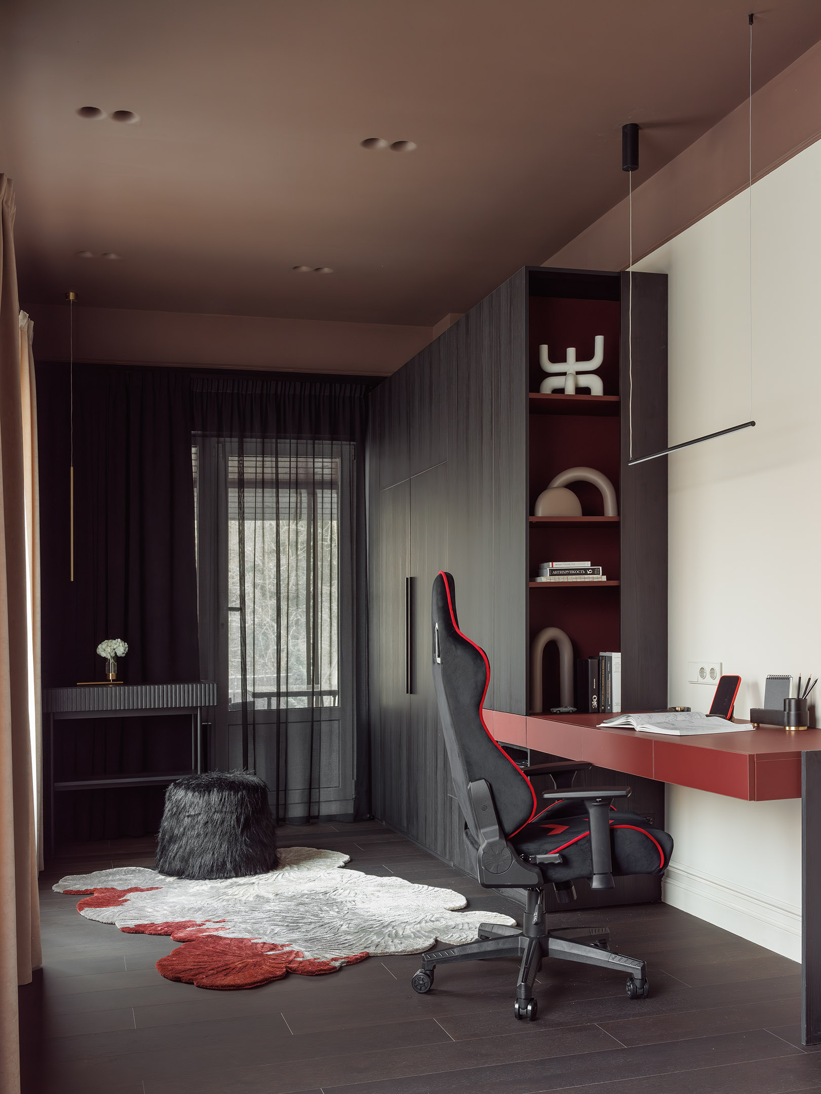 Старшие мальчишки хотели, чтобы у них были комнаты-берлоги, и я постаралась воплотить их мечты. В спальне старшего сына черная декоративная штукатурка создает эффект бархата и контрастирует с теплым, но темным оттенком «горячий какао», который окутывает потолок и плавно «спускается» на стены. За счет визуального стирания границ пространство смотрится уютным, цельным, обволакивающим. Гранатовый красный добавляет нотки провокации, олицетворяя яркость и силу мнения подростка, который хочет быть услышанным».