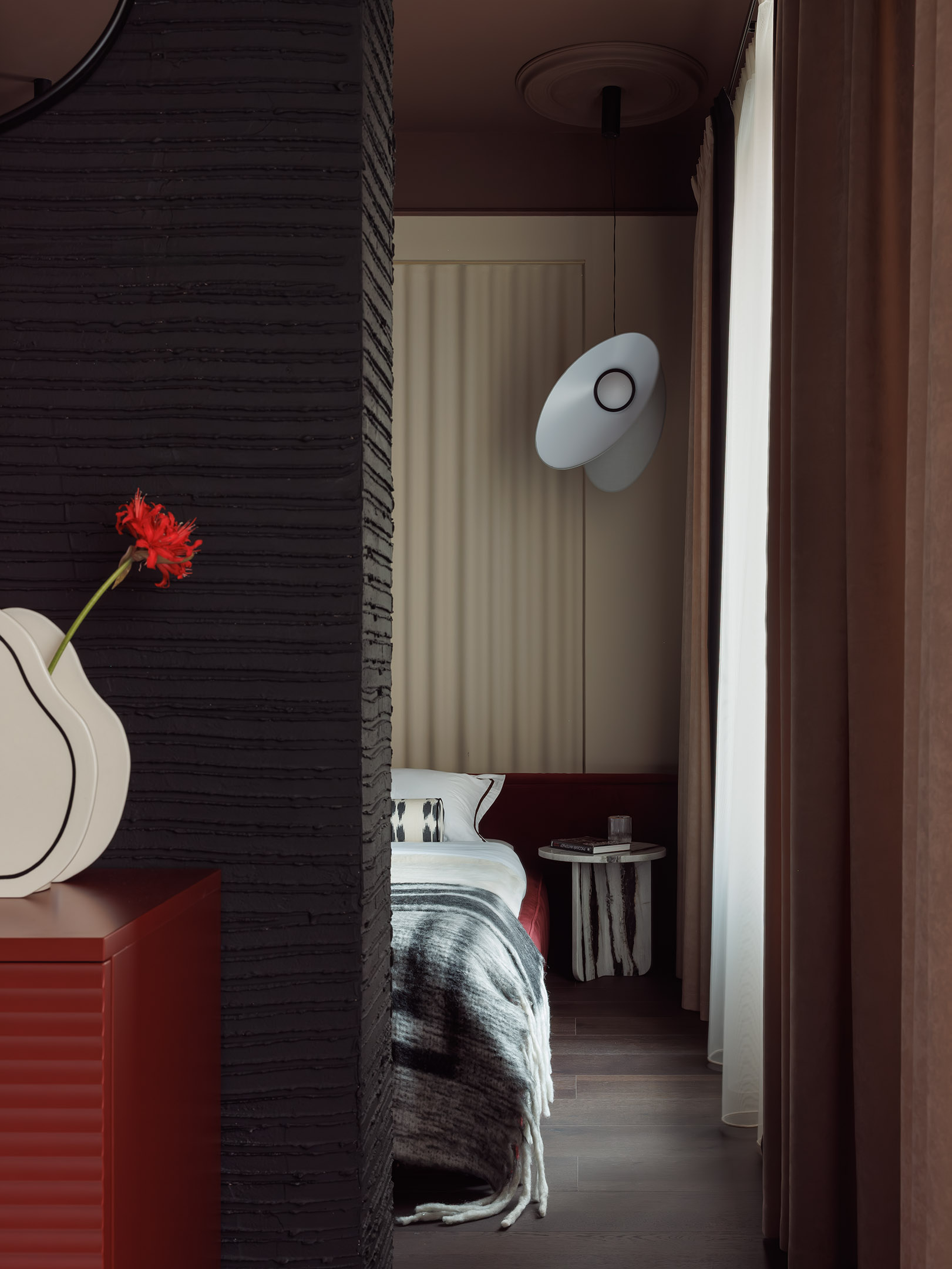 Комната старшего сына. «Отсылкой к образу стал лохматый пуф от SoftHome store, который врывается в интерьер своей легкой небрежностью. Десяток оттенков черного в различных материалах сочетаются со смелым, но теплым гранатовым цветом. Это абстрактная интерпретация протеста против классических устоев», — поясняет дизайнер. Декор, LaboratoryDome, Galerie 46. Светильники, Maytoni. Ковер, kover.ru. Комната старшего сына. «Отсылкой к образу стал лохматый пуф от SoftHome store, который врывается в интерьер своей легкой небрежностью. Десяток оттенков черного в различных материалах сочетаются со смелым, но теплым гранатовым цветом. Это абстрактная интерпретация протеста против классических устоев», — поясняет дизайнер. Декор, LaboratoryDome, Galerie 46. Светильники, Maytoni. Ковер, kover.ru.