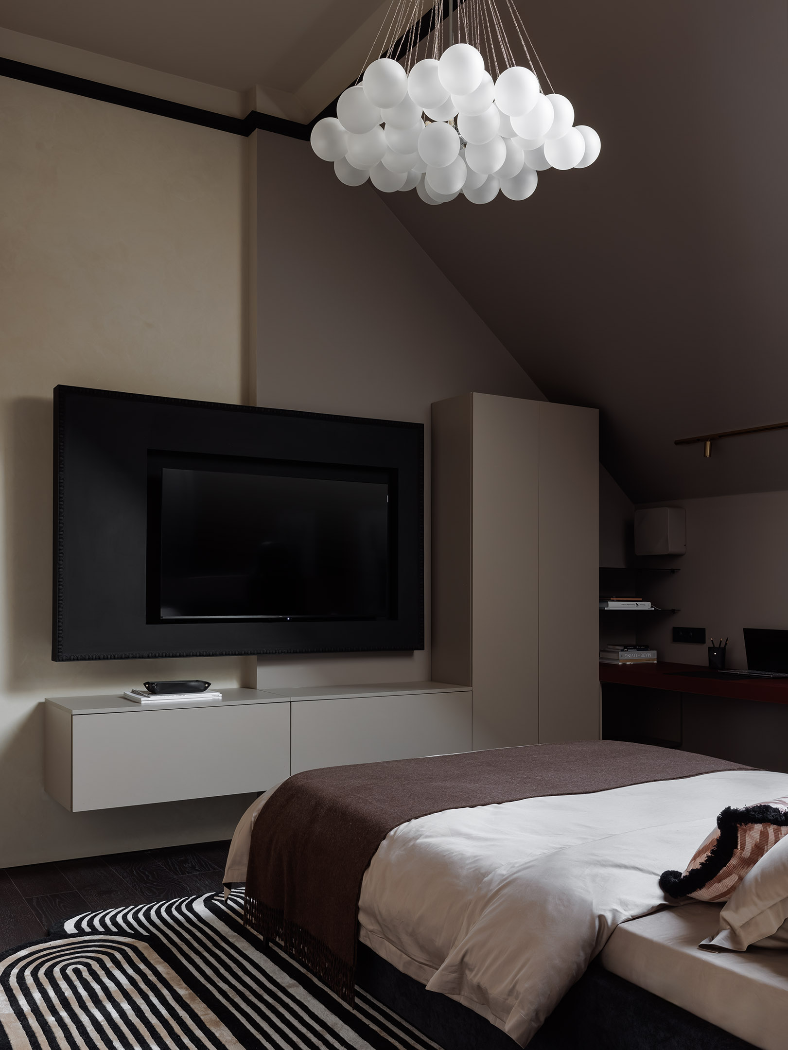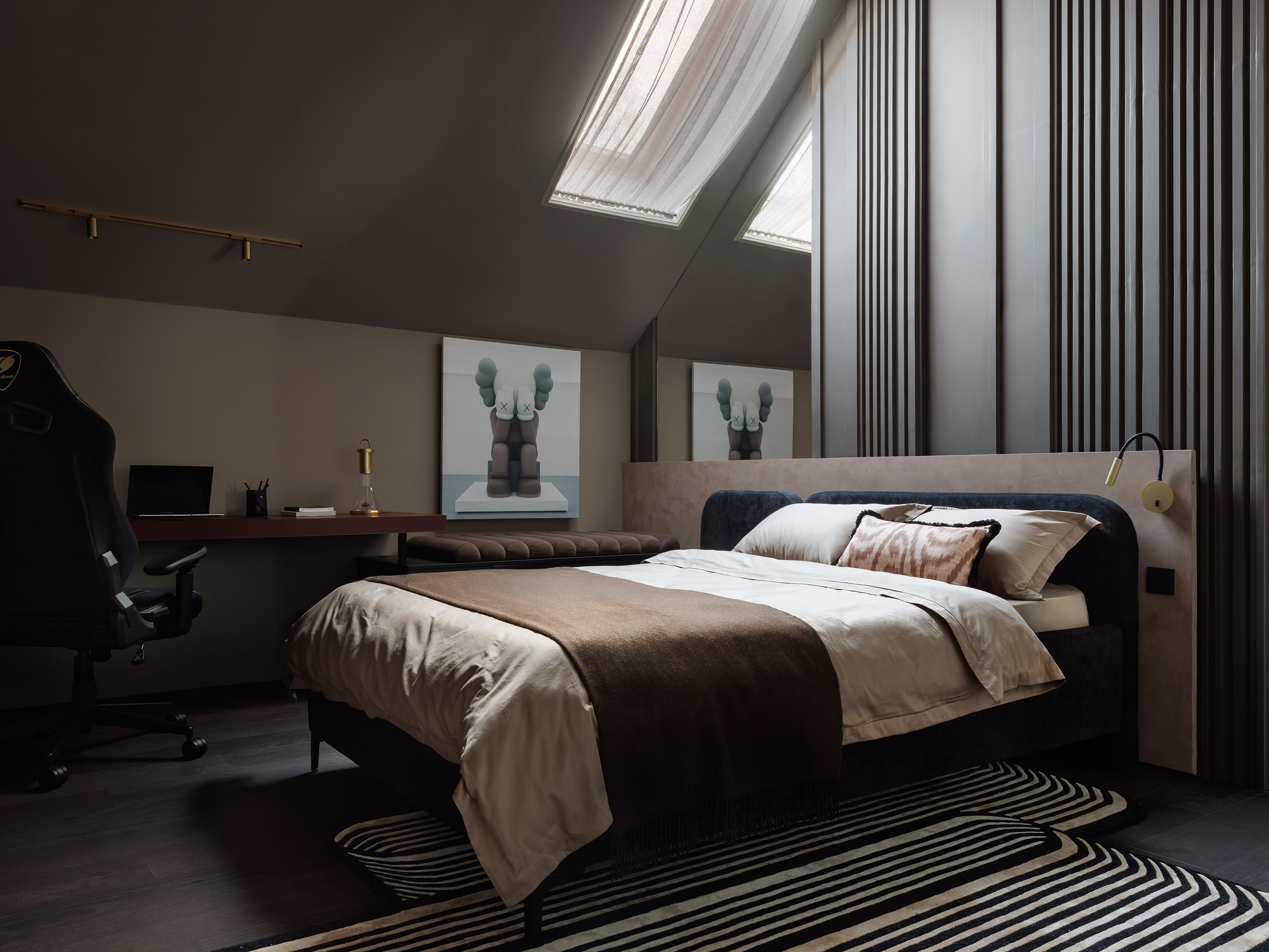 Комната среднего сына. Героем ее оформления стал известный всем подросткам персонаж — кукла Кавса, созданная дизайнером Брайаном Доннелли. «Формы куклы прослеживаются невидимой линией в деталях — в лепнине на черной ТВ-панели, в игривой люстре, напоминающей ее ушки, в подушке на комоде, напоминающей ботинки героя, — рассказывает Олеся Лещенко. — Изголовье кровати — это тоже результат переосмысления форм, которые использует Брайан. Но само пространство и идея протеста против классики продиктовали идею асимметричной композиции. За счет ковра визуально смещен центр тяжести. Подушка с лохматым кантиком тоже неслучайна, она намекает на легкую небрежность, которая однозначно появляется в комнате любого подростка. Зеркало у окна ломает восприятие скошенного потолка и позволяет впустить в комнату больше естественного света». Постельное белье, «Верфь». Декоративный текстиль, Laboratory dome, ADDA details. Краска, San Marito. Ковер, kover.ru. Настольная лампа Kandella Accent Sean Lavin, Visual Comfort. Трековый светильник, Denkirs. Стеновые гипсовые панели, гипсовые фризы выполнены по эскизам дизайнера, Decaro. Лепной декор, Rodecor. Комната среднего сына. Героем ее оформления стал известный всем подросткам персонаж — кукла Кавса, созданная дизайнером Брайаном Доннелли. «Формы куклы прослеживаются невидимой линией в деталях — в лепнине на черной ТВ-панели, в игривой люстре, напоминающей ее ушки, в подушке на комоде, напоминающей ботинки героя, — рассказывает Олеся Лещенко. — Изголовье кровати — это тоже результат переосмысления форм, которые использует Брайан. Но само пространство и идея протеста против классики продиктовали идею асимметричной композиции. За счет ковра визуально смещен центр тяжести. Подушка с лохматым кантиком тоже неслучайна, она намекает на легкую небрежность, которая однозначно появляется в комнате любого подростка. Зеркало у окна ломает восприятие скошенного потолка и позволяет впустить в комнату больше естественного света». Постельное белье, «Верфь». Декоративный текстиль, Laboratory dome, ADDA details. Краска, San Marito. Ковер, kover.ru. Настольная лампа Kandella Accent Sean Lavin, Visual Comfort. Трековый светильник, Denkirs. Стеновые гипсовые панели, гипсовые фризы выполнены по эскизам дизайнера, Decaro. Лепной декор, Rodecor.