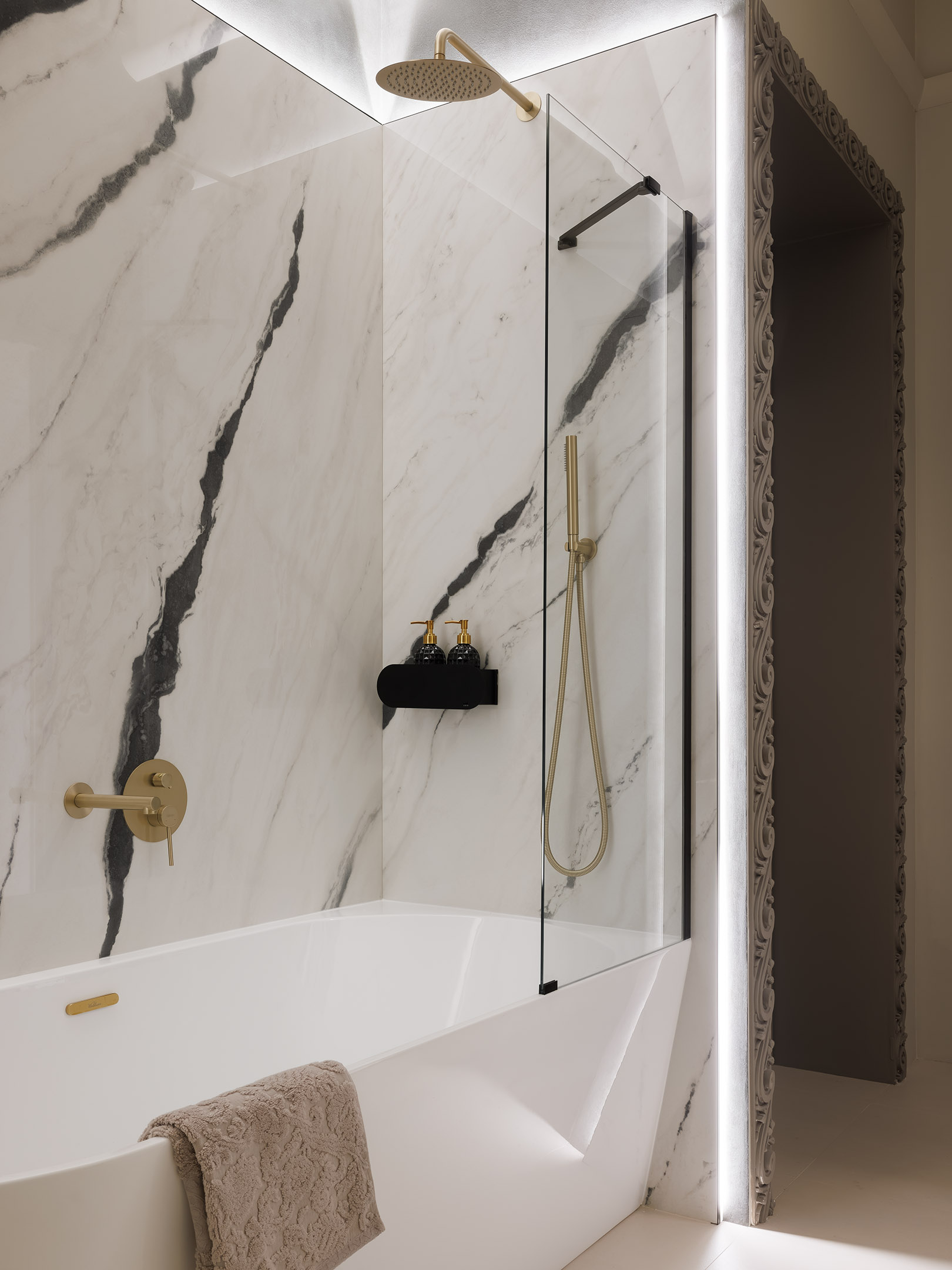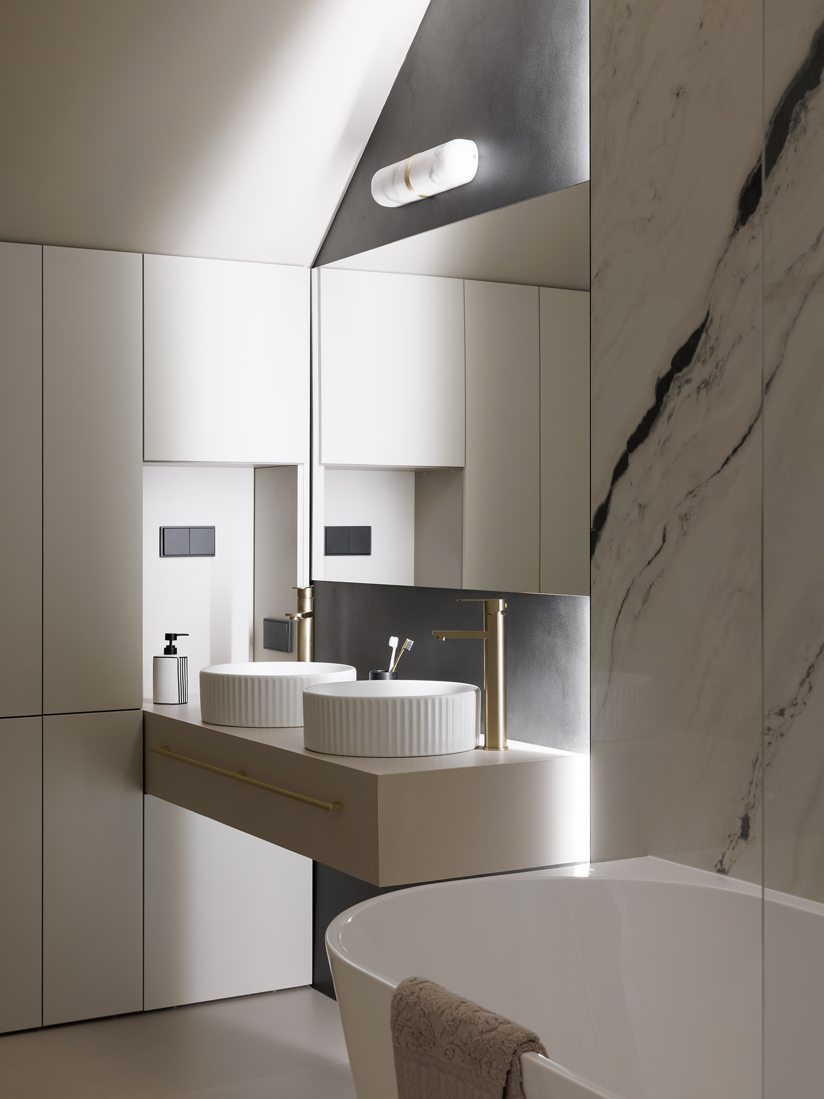 Ванная для мальчиков фактически лишена зон открытого хранения — все лишнее спрятано за фасадами мебели. Немного брутальная за счет цвета и грубых контрастных объемов гипсовая лепнина продолжает идею округлых форм в интерьере. На стенах — широкоформатный керамогранит Forte Dei Marmi Panda White, Atlas Concorde. На полу — керамогранит Sal Sapiente. Полотенца и банные принадлежности, Yves Delorme. Сантехника, Abber. Ванная для мальчиков фактически лишена зон открытого хранения — все лишнее спрятано за фасадами мебели. Немного брутальная за счет цвета и грубых контрастных объемов гипсовая лепнина продолжает идею округлых форм в интерьере. На стенах — широкоформатный керамогранит Forte Dei Marmi Panda White, Atlas Concorde. На полу — керамогранит Sal Sapiente. Полотенца и банные принадлежности, Yves Delorme. Сантехника, Abber.