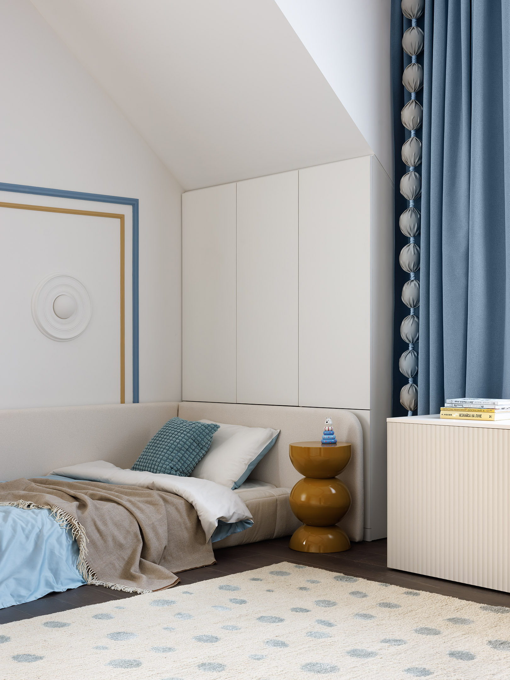 По желанию мамы детскую малыша сделали самым светлым помещением в доме, здесь использованы нейтральный белый, светлый песочный, жизнерадостный, но приглушенный небесный и песчано-желтый оттенки. Симметричные шкафы за кроватью закрыли абсолютно нефункциональные зоны со скошенным потолком. В них находятся большие секции для хранения белья и подушек. Для хранения неисчислимого количество крупных и мелких игрушек предусмотрен большой комод, на столешнице которого ребёнок может заниматься творчеством. «Формы полусфер повторяются в подушках-подлокотниках на игровом матрасе, в светильниках, обрамленных гипсовыми розетками, в декоре на стене. В текстильном оформлении окон также появилась своя изюминка. Косичка из шариков — это просто декор, но он появился намеренно, для того, чтобы отвлечь внимание деталями от хаоса, который точно будет создан десятками разноцветных игрушек», — добавляет дизайнер. Постельное белье, Еllie de niko. Прикроватный столик, LaRedoute. По желанию мамы детскую малыша сделали самым светлым помещением в доме, здесь использованы нейтральный белый, светлый песочный, жизнерадостный, но приглушенный небесный и песчано-желтый оттенки. Симметричные шкафы за кроватью закрыли абсолютно нефункциональные зоны со скошенным потолком. В них находятся большие секции для хранения белья и подушек. Для хранения неисчислимого количество крупных и мелких игрушек предусмотрен большой комод, на столешнице которого ребёнок может заниматься творчеством. «Формы полусфер повторяются в подушках-подлокотниках на игровом матрасе, в светильниках, обрамленных гипсовыми розетками, в декоре на стене. В текстильном оформлении окон также появилась своя изюминка. Косичка из шариков — это просто декор, но он появился намеренно, для того, чтобы отвлечь внимание деталями от хаоса, который точно будет создан десятками разноцветных игрушек», — добавляет дизайнер. Постельное белье, Еllie de niko. Прикроватный столик, LaRedoute.