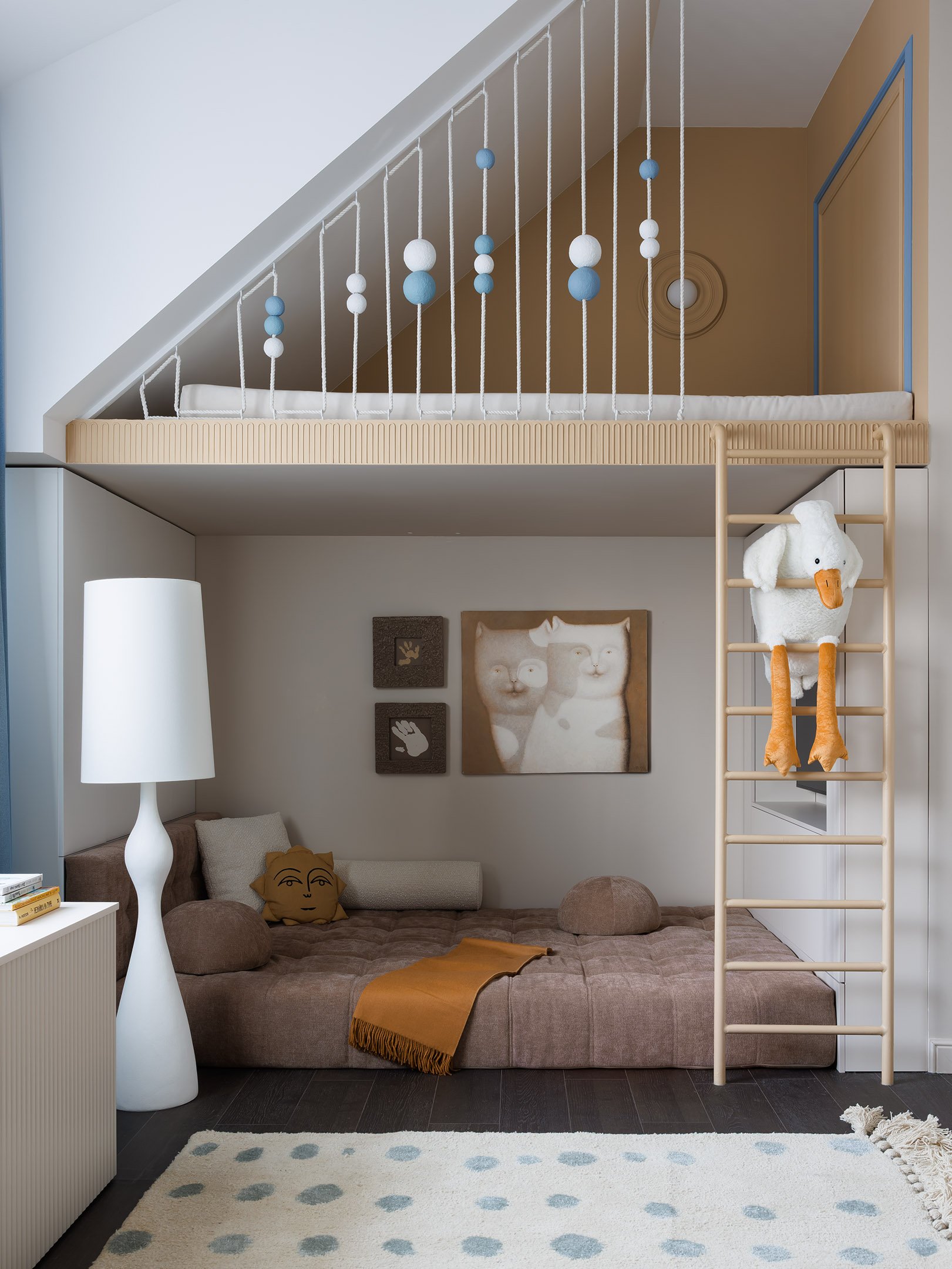 «Высота потолков позволила обустроить для малыша чердак для секретов и возможности скрыться от мира в своей Нарнии, — говорит дизайнер. — Под ним предусмотрена большая уютная игровая зона, где старшие братья могли бы присоединиться для игры в приставку или для просмотра популярных видеообзоров. Картины и декор в комнате имеют символическую значимость для домочадцев. Настя Лепота создала две необычные картины «Память» в своей особой технике. А малыш с мамой приложили к этому арт-объекту свою руку, оставив на них свои отпечатки. Теперь эта зона излучает особое тепло и нежность. Символично подобрана и картина Юрия Первушина (галерея ArtMaley Gallery), на которой мило изображены словно мама и малыш — кошка и игривый котенок». Торшер Lakmos Aerin, Visual Comfort. Кровать, Softhome store. Ковер ручной работы, Наталья Пантюхина. Краски, San Marito. «Высота потолков позволила обустроить для малыша чердак для секретов и возможности скрыться от мира в своей Нарнии, — говорит дизайнер. — Под ним предусмотрена большая уютная игровая зона, где старшие братья могли бы присоединиться для игры в приставку или для просмотра популярных видеообзоров. Картины и декор в комнате имеют символическую значимость для домочадцев. Настя Лепота создала две необычные картины «Память» в своей особой технике. А малыш с мамой приложили к этому арт-объекту свою руку, оставив на них свои отпечатки. Теперь эта зона излучает особое тепло и нежность. Символично подобрана и картина Юрия Первушина (галерея ArtMaley Gallery), на которой мило изображены словно мама и малыш — кошка и игривый котенок». Торшер Lakmos Aerin, Visual Comfort. Кровать, Softhome store. Ковер ручной работы, Наталья Пантюхина. Краски, San Marito.