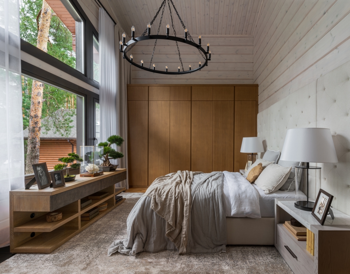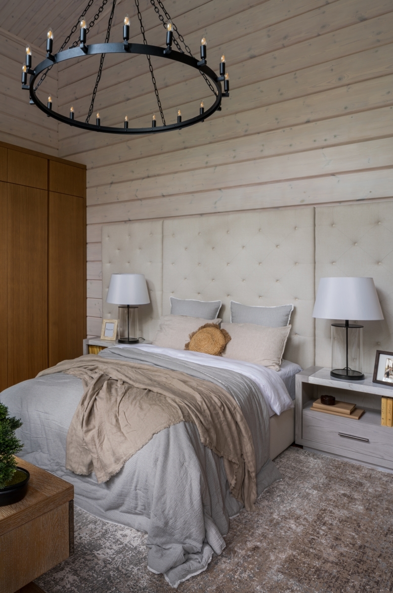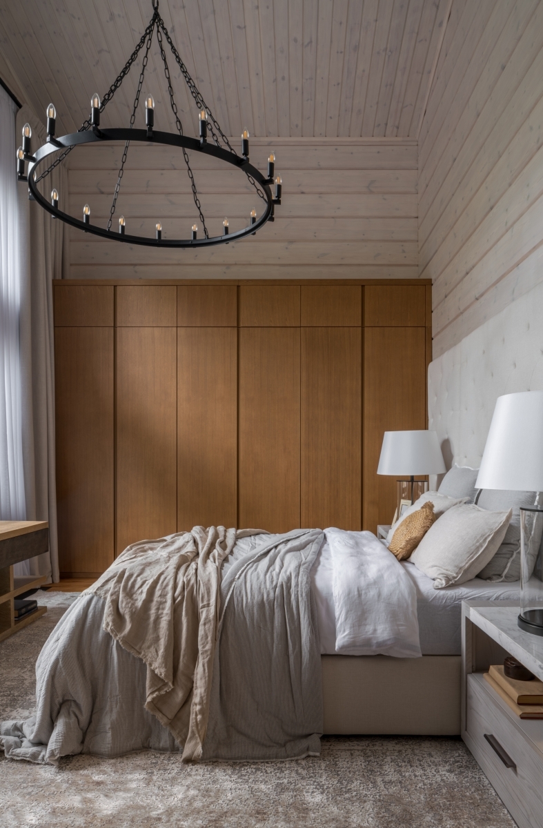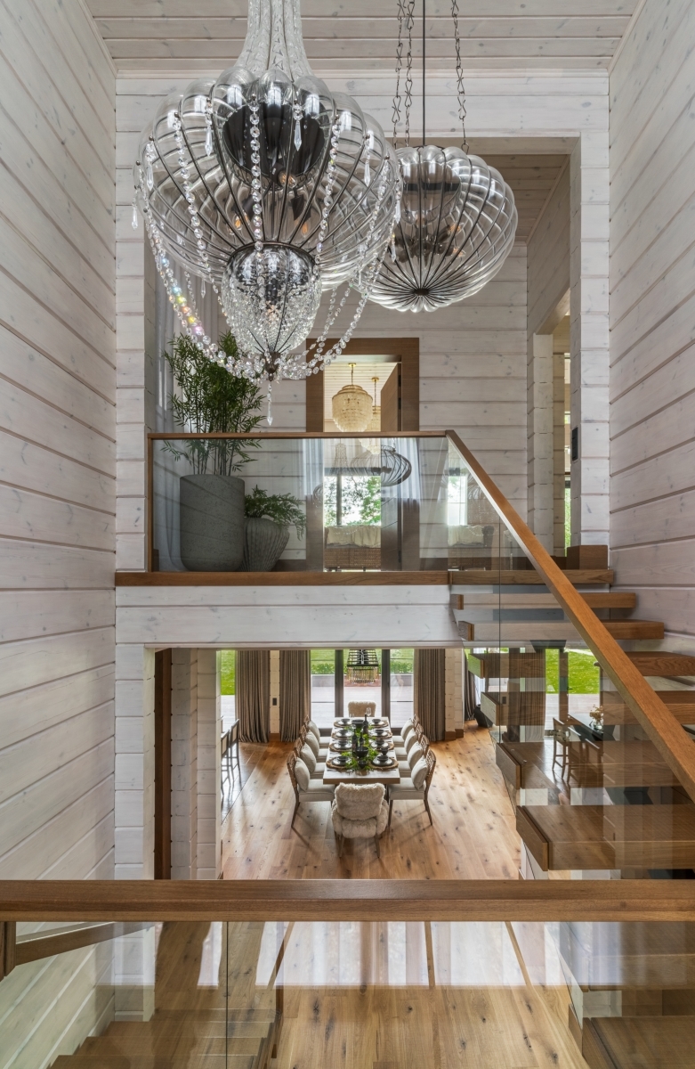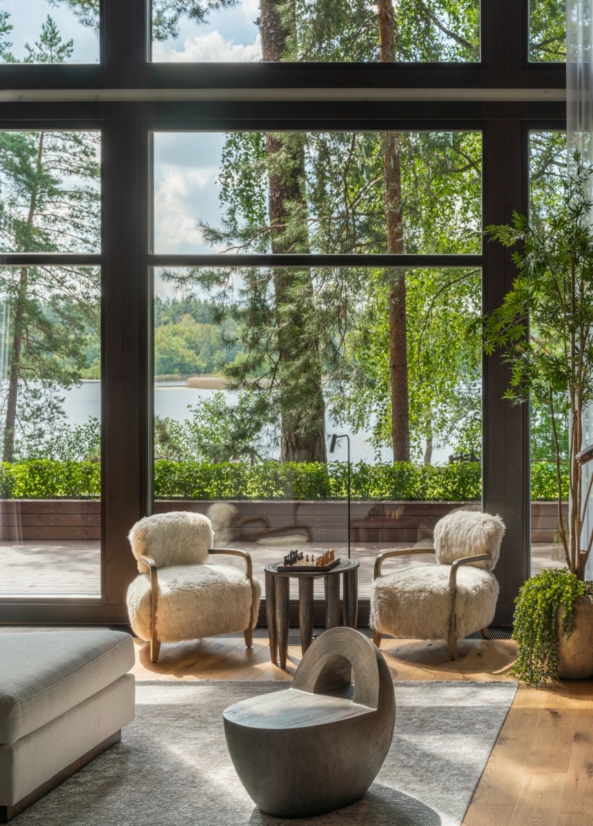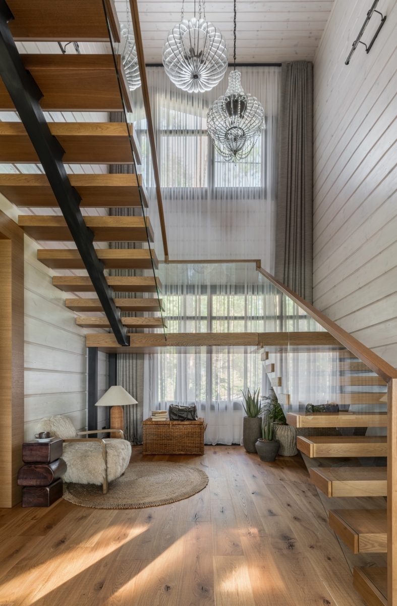 Потрясающий вид на озеро задал тон всему интерьеру. Дом повернут лицом к пейзажу — вход организован с задней стороны, и уже из прихожей открывается живописная природная панорама. Двухсветное пространство первого этажа с огромным окном в пол отвели под общую зону: гостиную с камином, столовую, кухню и спа-комплекс. Из каждого помещения можно выйти на открытую деревянную террасу. На втором этаже — приватная зона с тремя спальнями.
