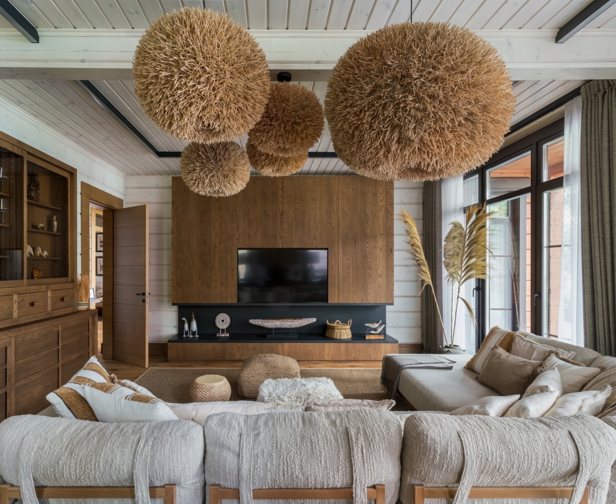 «Проект мы выполнили по принципам экодизайна, — продолжает рассказ Татьяна Миронова. — Экодизайн — это попытка с помощью обстановки укрепить незримую связь между человеком и окружающим пейзажем. Поэтому все материалы здесь — только натуральные, как и в самой природе: уютное кожаное кресло с меховой оторочкой в гостиной, журнальный столик из белого американского дуба, плетеные стулья. Комнатные растения в каждом помещении тоже работают на эффект единения с природным началом. Если говорить в целом, то у современного заказчика всё чаще возникает этот запрос — хочется чего-то уютного, природного, простого, но при этом по всем стандартам современного комфортного пространства. Думаю, в этом проекте нам удалось достичь такой цели».