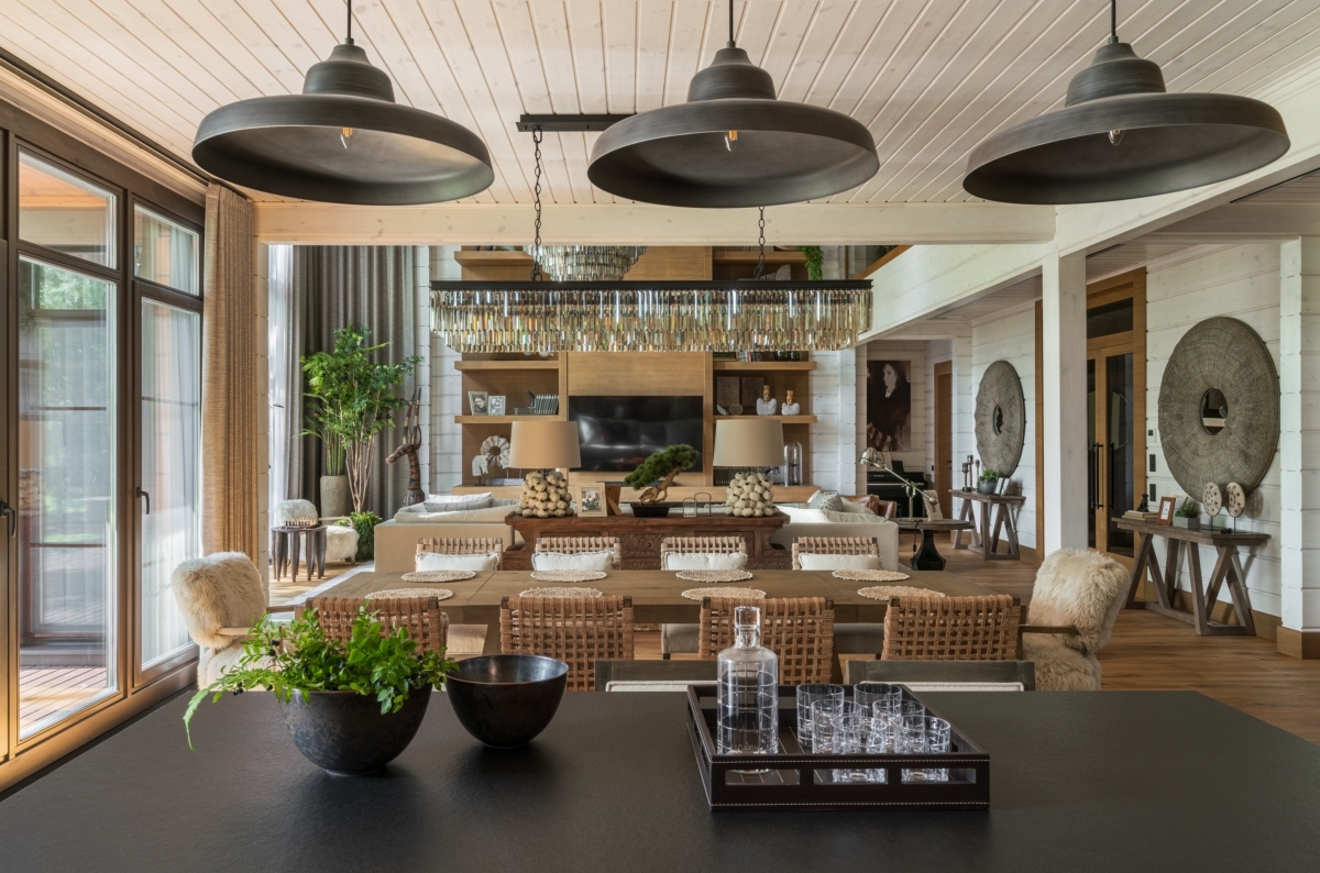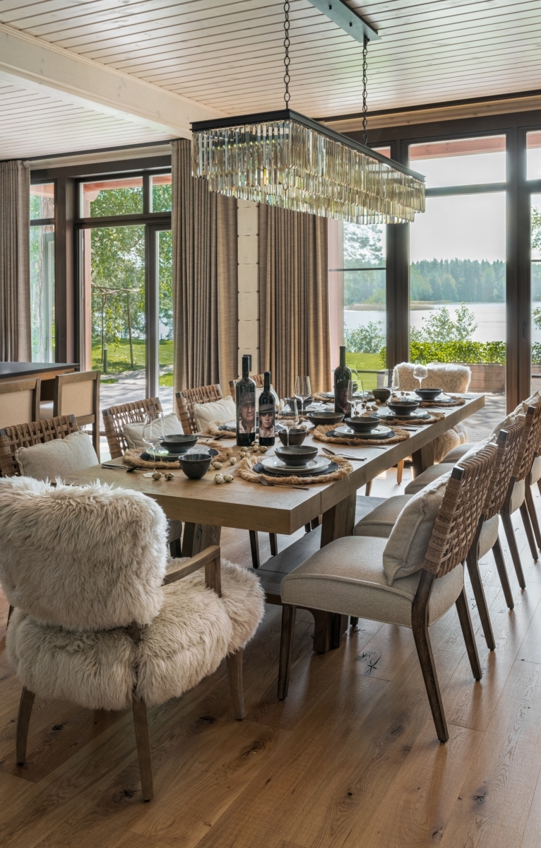 Фрагмент столовой зоны. Массивный, нарочито грубоватый обеденный стол от американского бренда Restoration Hardware подчеркивает идею естественности, близости к природе. Стулья, Hooker Furniture. Фрагмент столовой зоны. Массивный, нарочито грубоватый обеденный стол от американского бренда Restoration Hardware подчеркивает идею естественности, близости к природе. Стулья, Hooker Furniture.