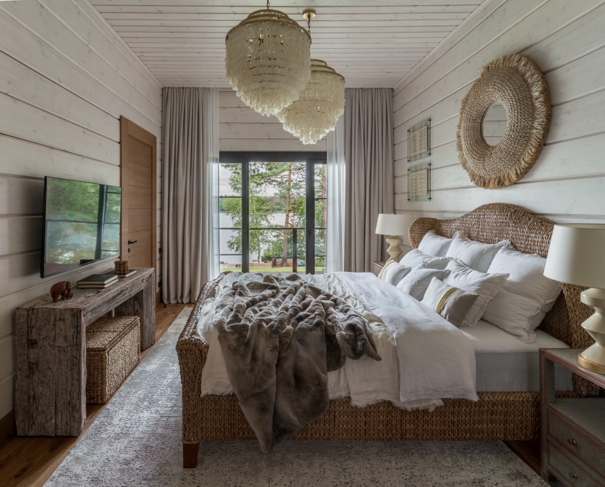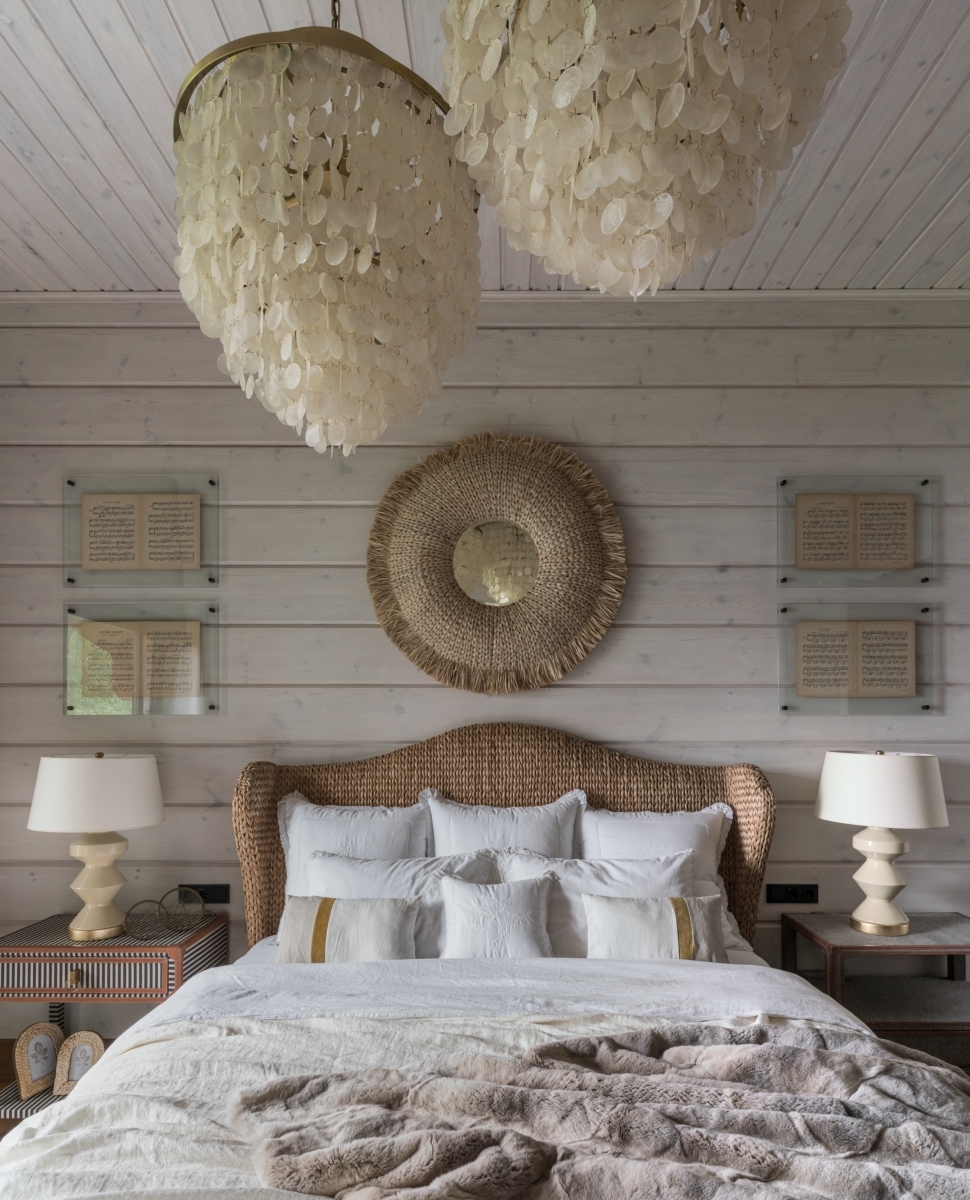 Спальня хозяев. Кровать ручной работы от Made Goods перекликается с зеркалом в плетеной раме этого же бренда. Стены украшены раскрытыми нотными тетрадями — эта деталь привносит в интерьер атмосферу легкой романтики и перекликается с пианино на первом этаже (вся семья любит музицировать). Прикроватные тумбы, Made Goods. Спальня хозяев. Кровать ручной работы от Made Goods перекликается с зеркалом в плетеной раме этого же бренда. Стены украшены раскрытыми нотными тетрадями — эта деталь привносит в интерьер атмосферу легкой романтики и перекликается с пианино на первом этаже (вся семья любит музицировать). Прикроватные тумбы, Made Goods.