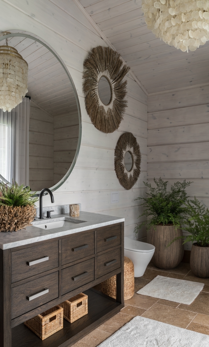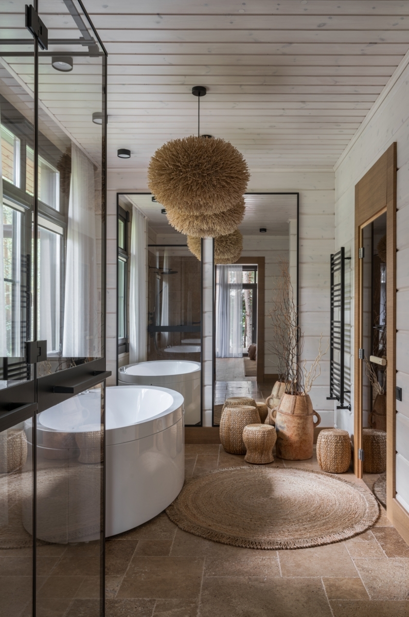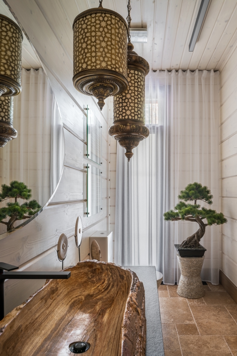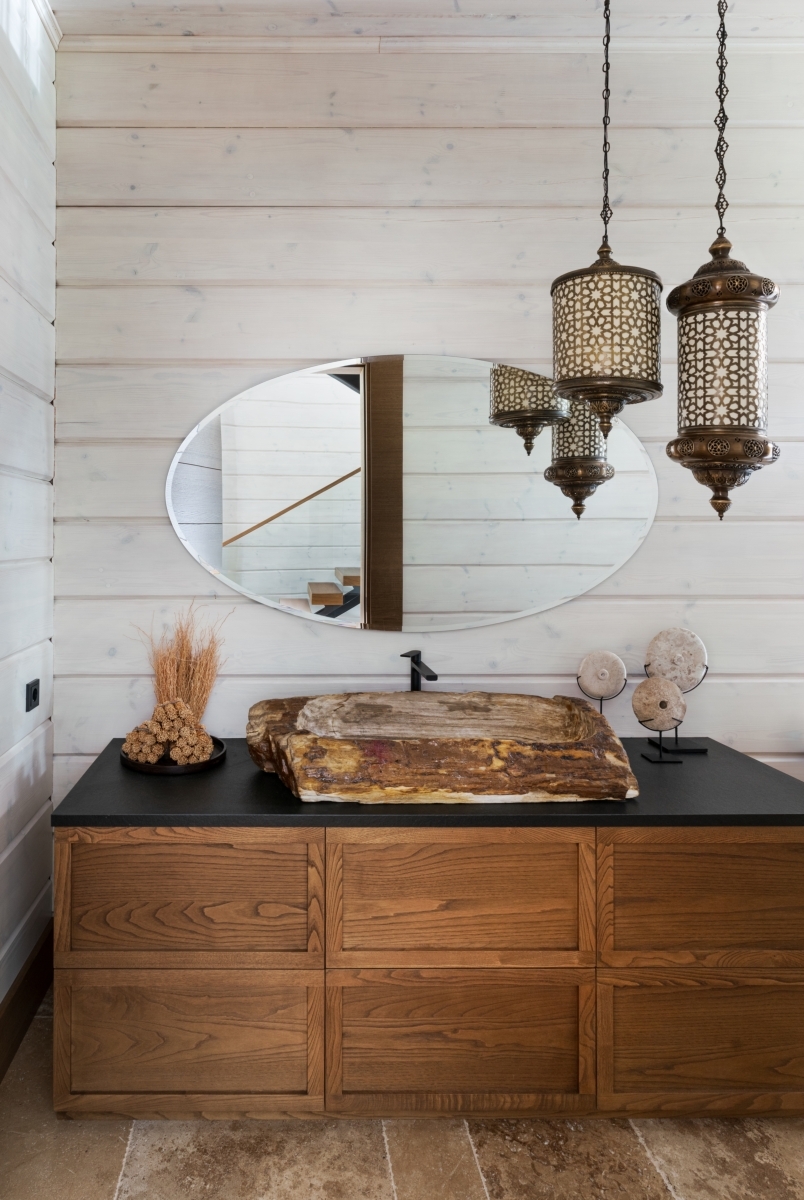 Слева спа-зона. Стены отделаны деревом — еще один штрих в создании уютной, домашней атмосферы. Текстурные корзины и светильники работают на тот же эффект. Подвесные светильники, Dantone Home. Справа ванная комната на первом этаже. Как и подобает проекту в духе экодизайна, раковина выполнена из окаменевшего куска дерева. Фонари в этническом стиле перекликаются с ориентальным декором гостиной. Зеркало, Bassett Mirror. Слева спа-зона. Стены отделаны деревом — еще один штрих в создании уютной, домашней атмосферы. Текстурные корзины и светильники работают на тот же эффект. Подвесные светильники, Dantone Home. Справа ванная комната на первом этаже. Как и подобает проекту в духе экодизайна, раковина выполнена из окаменевшего куска дерева. Фонари в этническом стиле перекликаются с ориентальным декором гостиной. Зеркало, Bassett Mirror.