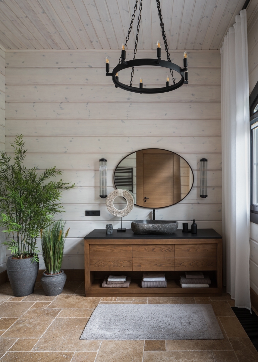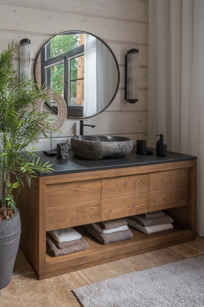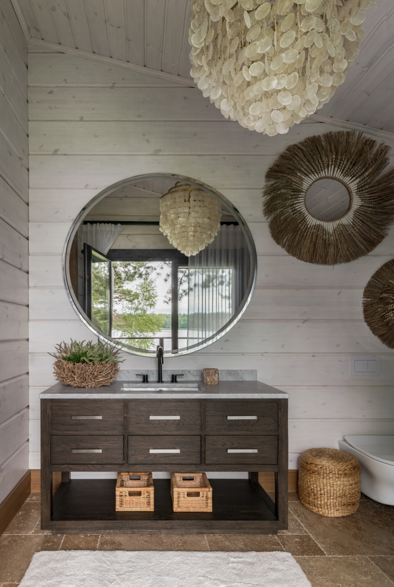 Слева спа-зона. Стены отделаны деревом — еще один штрих в создании уютной, домашней атмосферы. Текстурные корзины и светильники работают на тот же эффект. Подвесные светильники, Dantone Home. Справа ванная комната на первом этаже. Как и подобает проекту в духе экодизайна, раковина выполнена из окаменевшего куска дерева. Фонари в этническом стиле перекликаются с ориентальным декором гостиной. Зеркало, Bassett Mirror. Слева спа-зона. Стены отделаны деревом — еще один штрих в создании уютной, домашней атмосферы. Текстурные корзины и светильники работают на тот же эффект. Подвесные светильники, Dantone Home. Справа ванная комната на первом этаже. Как и подобает проекту в духе экодизайна, раковина выполнена из окаменевшего куска дерева. Фонари в этническом стиле перекликаются с ориентальным декором гостиной. Зеркало, Bassett Mirror.