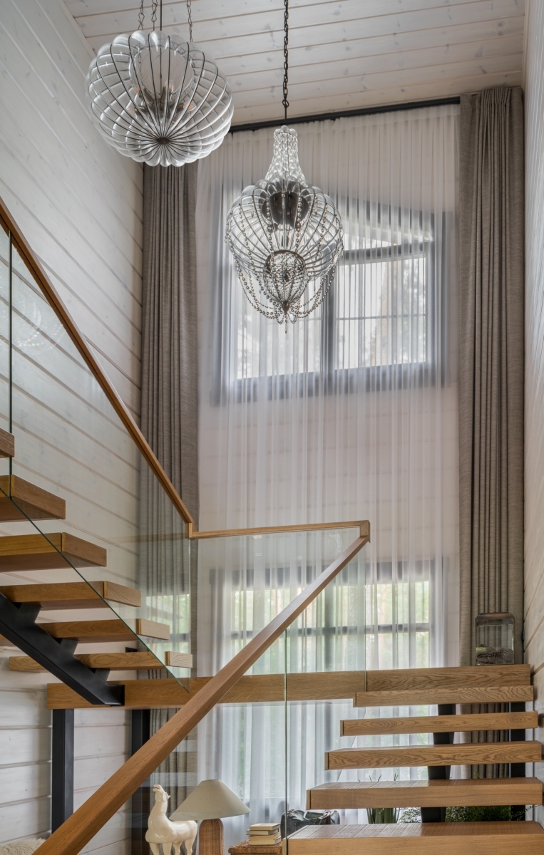 На спокойном фоне из песочных оттенков и мягких фактур особенно эффектно смотрятся элементы из стекла — светильники, прозрачные двери, ограждение лестницы. Они удачно уравновешивают «теплый» интерьер и наполняют пространство воздухом и светом.
