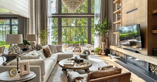 Общий вид гостиной. Широкие окна в пол впускают природную панораму в интерьер. Диван, Century Furniture. Журнальный стол, кожаное кресло, меховые кресла (у окна), Restoration Hardware. Общий вид гостиной. Широкие окна в пол впускают природную панораму в интерьер. Диван, Century Furniture. Журнальный стол, кожаное кресло, меховые кресла (у окна), Restoration Hardware.