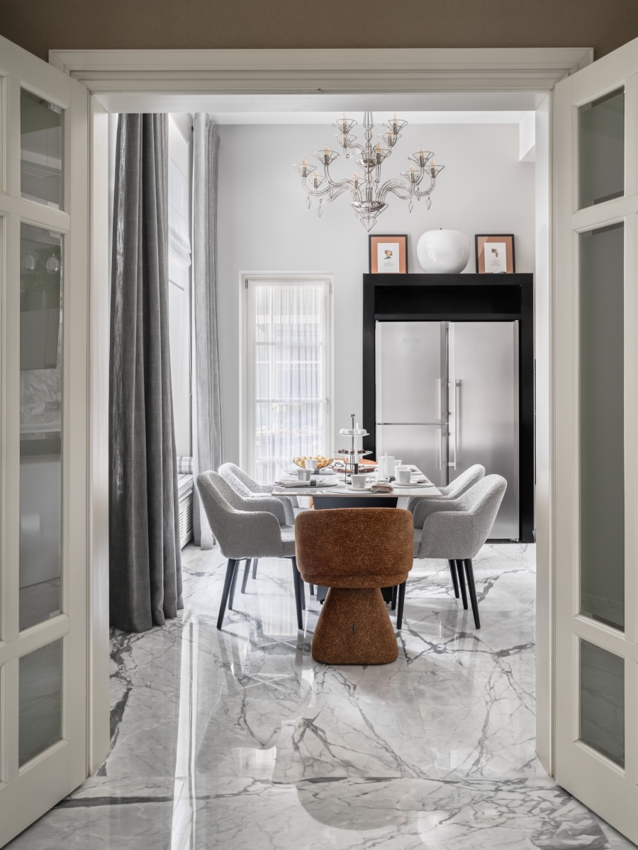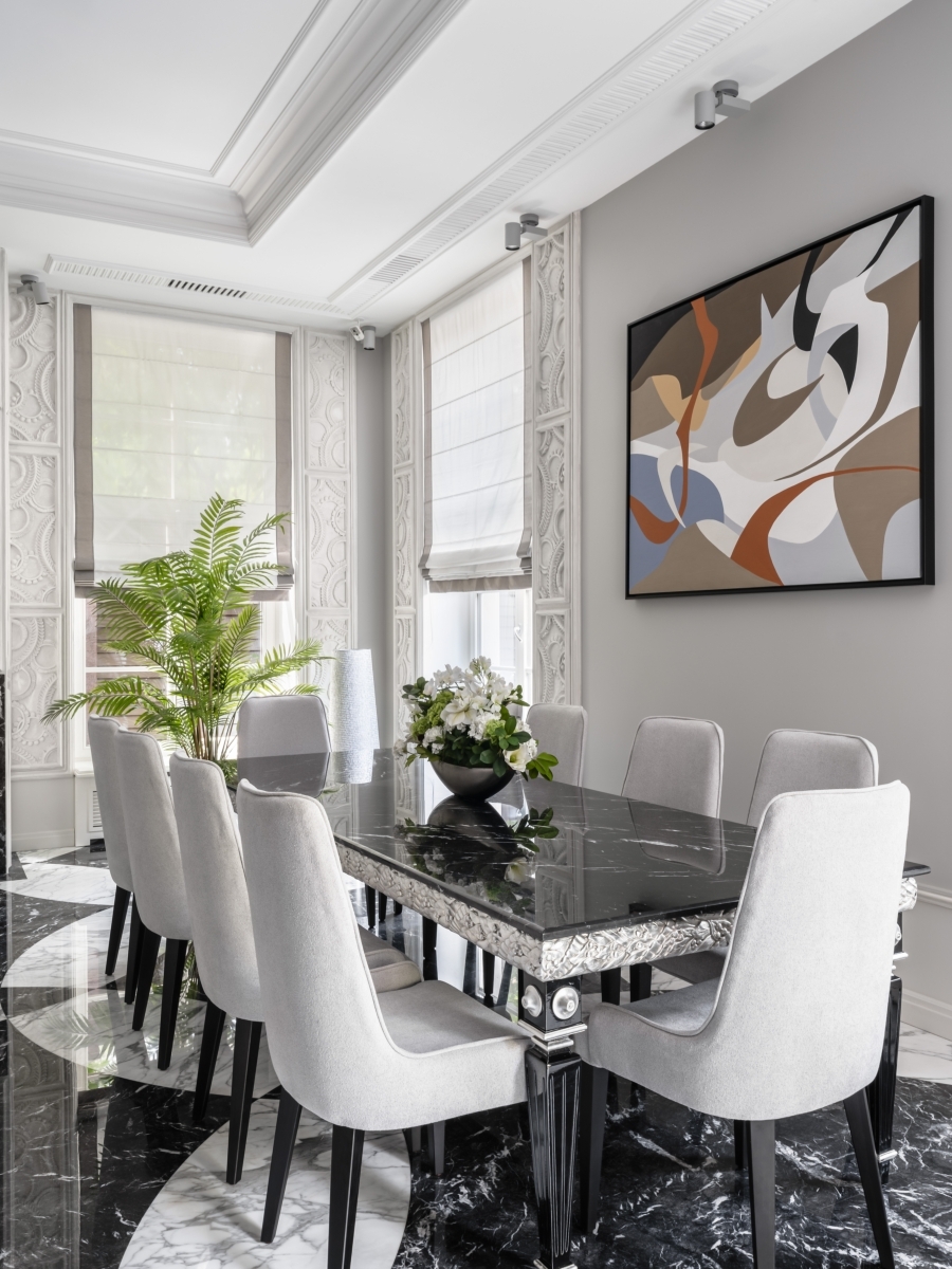 Гостиная-столовая — еще одно яркое сочетание ар-деко с визуальной сдержанностью. «Парадная» составляющая включает в себя пол из итальянского мрамора с геометричной раскладкой и панели с гипсовой резьбой, орнамент которых заимствован из интерьера нью-йоркского лофта эпохи ар-деко. Над камином размещена композиция из гипса по мотивам скульптурной группы Антонио Кановы «Три Грации». Для равновесия дизайнер добавила в интерьер легкий, современный декор: мебель обтекаемых форм, актуальную живопись и уютные, текстурные ткани: английскую шерсть, букле, тутовый шелк. «Использование только натуральных материалов — основной принцип в отделке дома: это натуральный камень, дерево экзотических пород, кожа, замша, шерсть, шелк в сочетании с элементами из стекла и металла», — отмечает Алексия Братушкова.