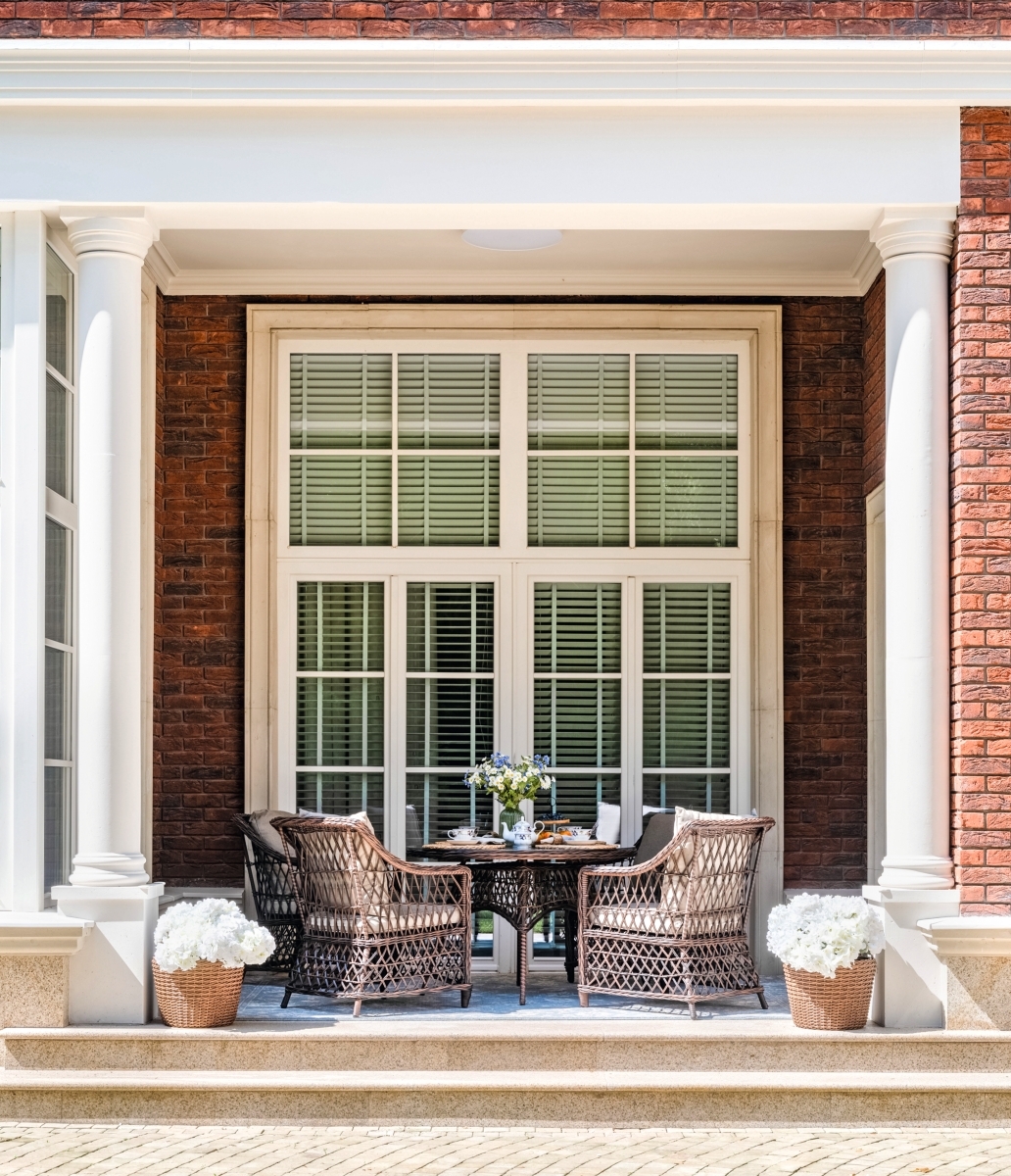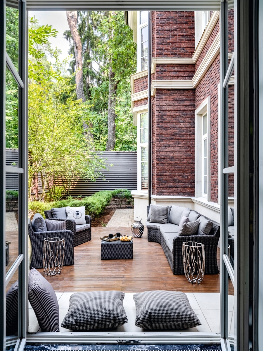 Открытая зона патио с выходом из гостиной и видом из панорамных окон столовой — еще одна уютная релакс-зона. Подушки и текстиль во всем доме украшает авторская вышивка с логотипом дома Heritage Rezinence.