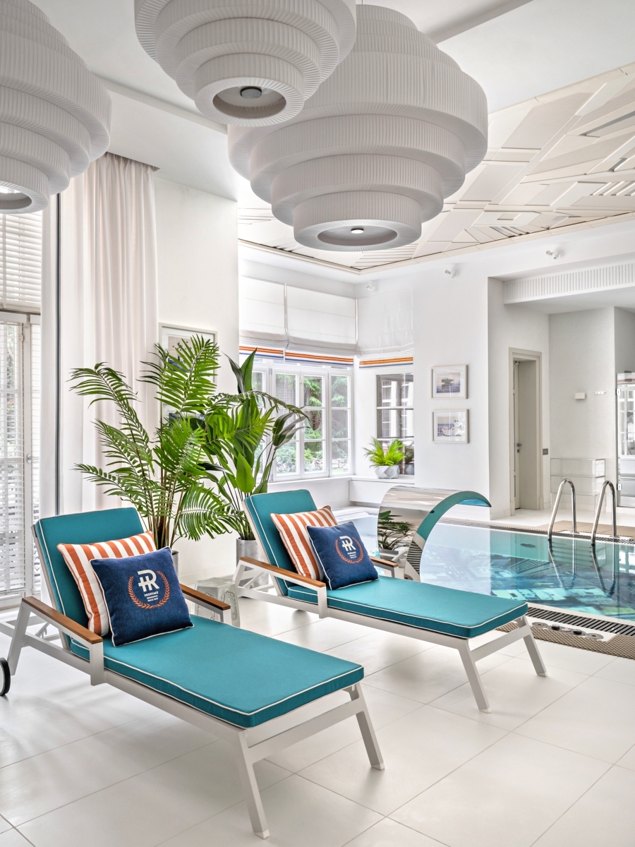 Спа-зона с бассейном — яркое воплощение американского ар-деко. Интерьер получился респектабельным, но при этом свежим, легким, не перегруженным деталями. На потолке — панно из искусственной кожи: стилизованное изображение нью-йоркских улиц в графичной и рельефной технике. Светильники, Bover, «Трио Интерьер». Шезлонги, Verandaru. Текстиль, AlexaBrattFurniture. Спа-зона с бассейном — яркое воплощение американского ар-деко. Интерьер получился респектабельным, но при этом свежим, легким, не перегруженным деталями. На потолке — панно из искусственной кожи: стилизованное изображение нью-йоркских улиц в графичной и рельефной технике. Светильники, Bover, «Трио Интерьер». Шезлонги, Verandaru. Текстиль, AlexaBrattFurniture.