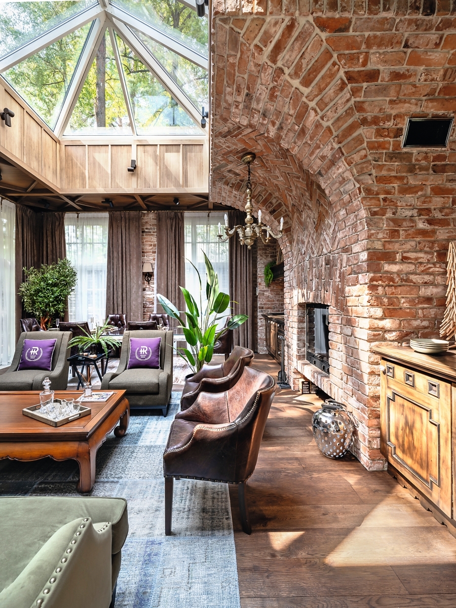 Прекрасный зимний сад-атриум выполняет роль второй гостиной. На потолке расположен световой фонарь, к которому склонились пышные кроны вековых сосен. Центральная композиция — арочный свод с камином, выполненным из исторического тесаного кирпича имперских времен. Помещение условно разделено на две зоны: столовую с уникальным столом из стекла и дерева ручной резьбы и лаундж с уютным диваном Marrakech и креслами Ray от Creatica. Кожаные стулья, Eichholtz. Ковер Bloom, «Ами Ковры». Прекрасный зимний сад-атриум выполняет роль второй гостиной. На потолке расположен световой фонарь, к которому склонились пышные кроны вековых сосен. Центральная композиция — арочный свод с камином, выполненным из исторического тесаного кирпича имперских времен. Помещение условно разделено на две зоны: столовую с уникальным столом из стекла и дерева ручной резьбы и лаундж с уютным диваном Marrakech и креслами Ray от Creatica. Кожаные стулья, Eichholtz. Ковер Bloom, «Ами Ковры».