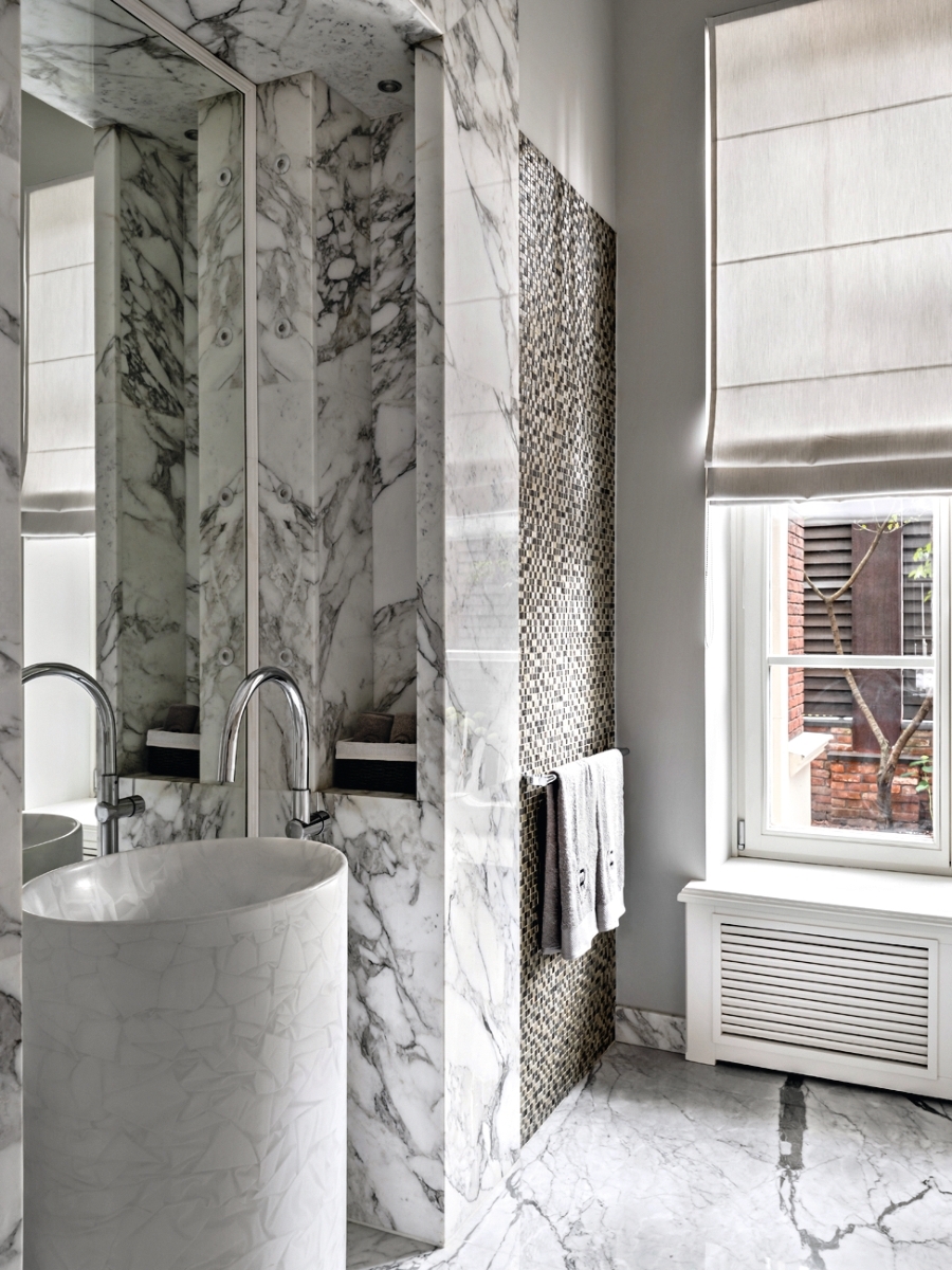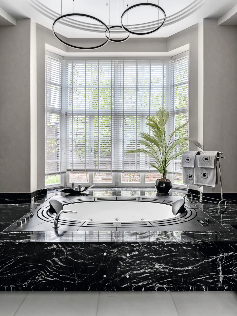 Ванная комната при спальне на первом этаже облицована натуральным итальянским мрамором Nero Marquino — черный цвет и глянцевая фактура, характерные для ар-деко, в сочетании со светлыми стенами позволяют добиться вожделенного эффекта неброской роскоши. Сама ванна расположилась на подиуме в один уровень с окном. Ванна Jacuzzi, сантехника и аксессуары Artcheram, Keuco, компания Decorroom. Смесители, Fantini. Люстра Zero, Panzeri, компания Rum24. Ванная комната при спальне на первом этаже облицована натуральным итальянским мрамором Nero Marquino — черный цвет и глянцевая фактура, характерные для ар-деко, в сочетании со светлыми стенами позволяют добиться вожделенного эффекта неброской роскоши. Сама ванна расположилась на подиуме в один уровень с окном. Ванна Jacuzzi, сантехника и аксессуары Artcheram, Keuco, компания Decorroom. Смесители, Fantini. Люстра Zero, Panzeri, компания Rum24.